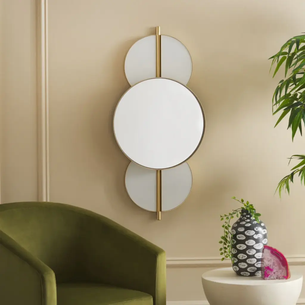 Update your walls with the refined elegance and glamour of our Syrus wall mirror. Our three-tiered mirror is beautifully layered to achieve an eye-catching balance and poise. Featuring a gold frame that is paired with a white metallic finish, our wall art combines fine materials and lustrous finishes to lend a touch of luxury. It can be hung both vertically and horizontally to serve as an elevated centerpiece for your walls.