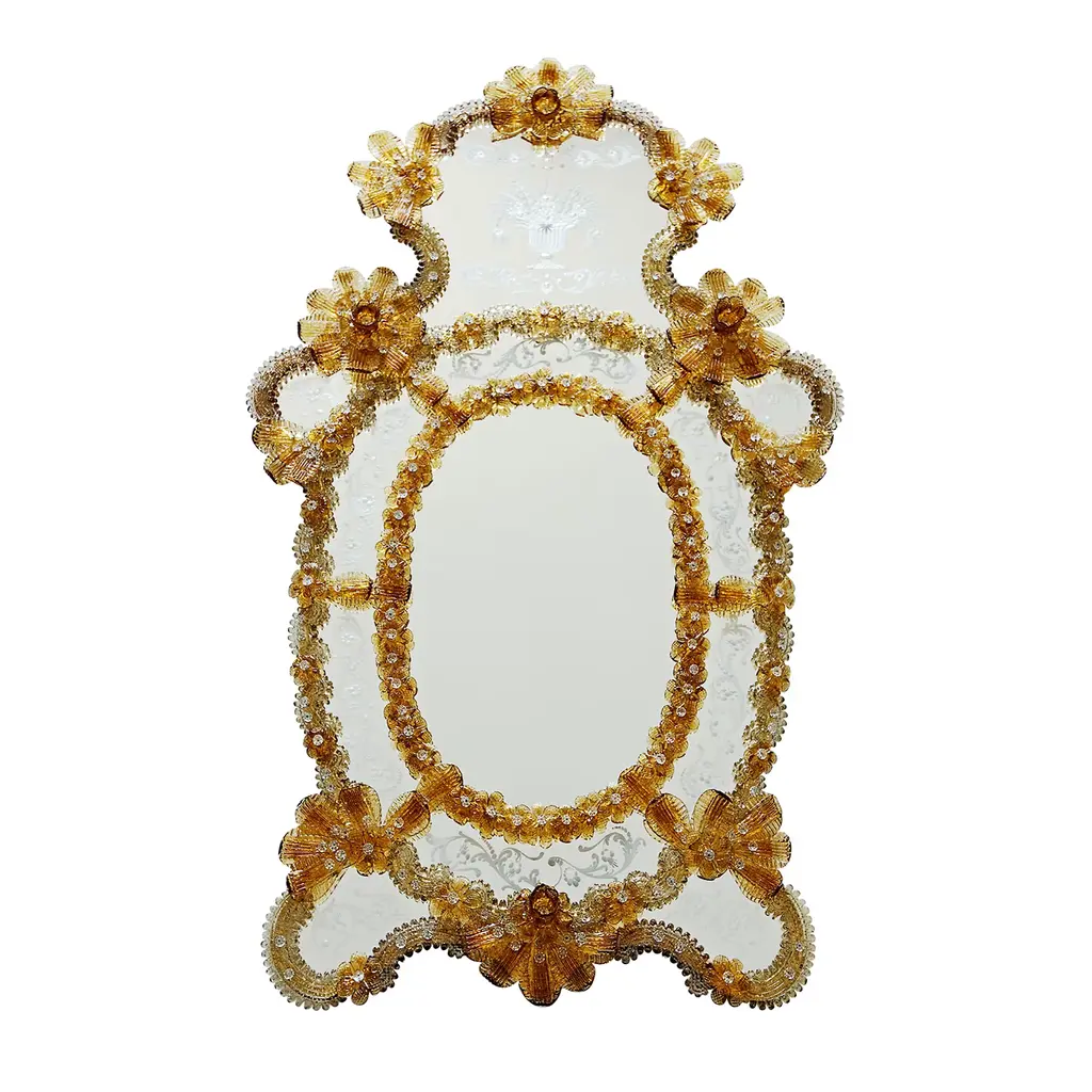 Classic shaped Venetian mirror, made in the most rigorous Murano tradition. Finely hand-engraved on all elements, it is assembled with numerous floral elements in crystal and gold handmade in the Murano furnaces. Wooden frame with a natural finish.