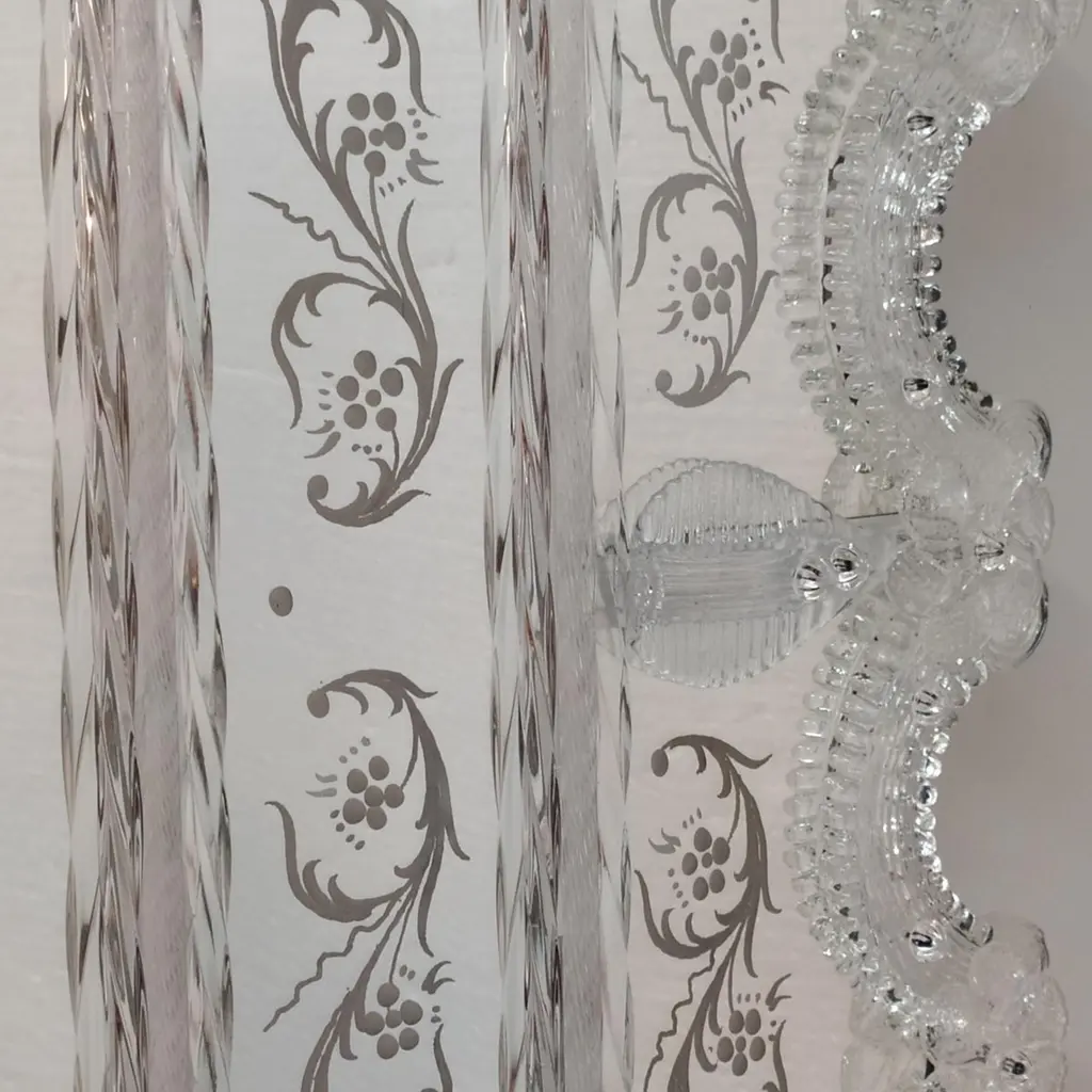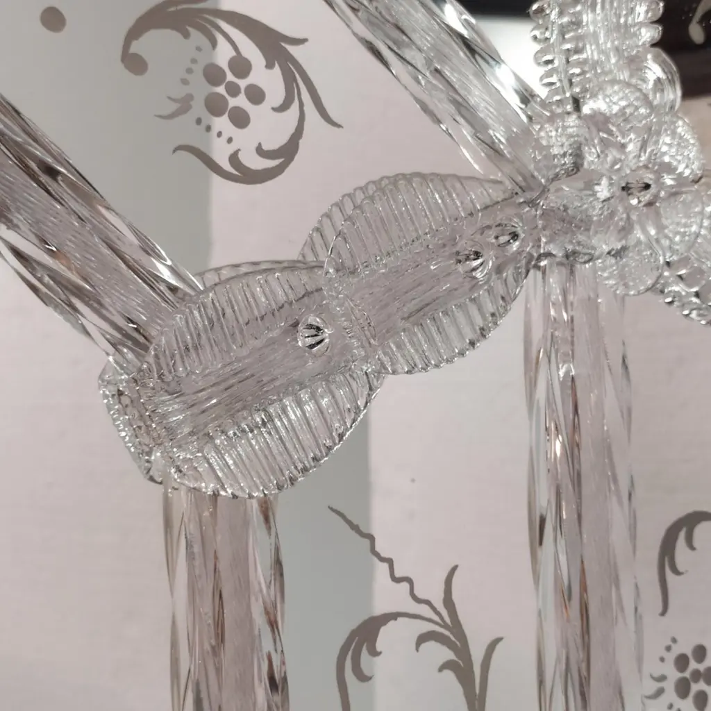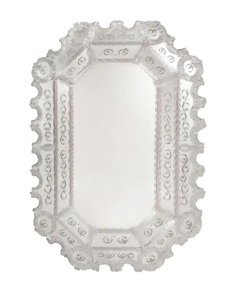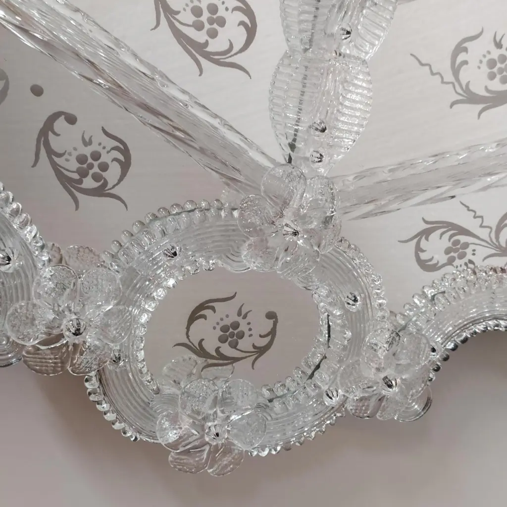 Venetian mirror in Murano Glass made by the Fratelli Tosi Murano, entirely handmade according to the techniques of our ancestors. Mirror composed of a central octagon with crystal and silver frame in Murano glass and decorated with Murano glass curls, all on a silver background, embellished with details of crystal flowers, the mirror is all decorated with floral and curly engravings made by hand.
