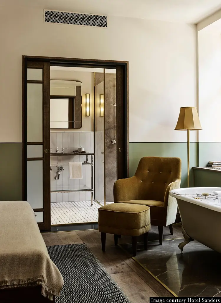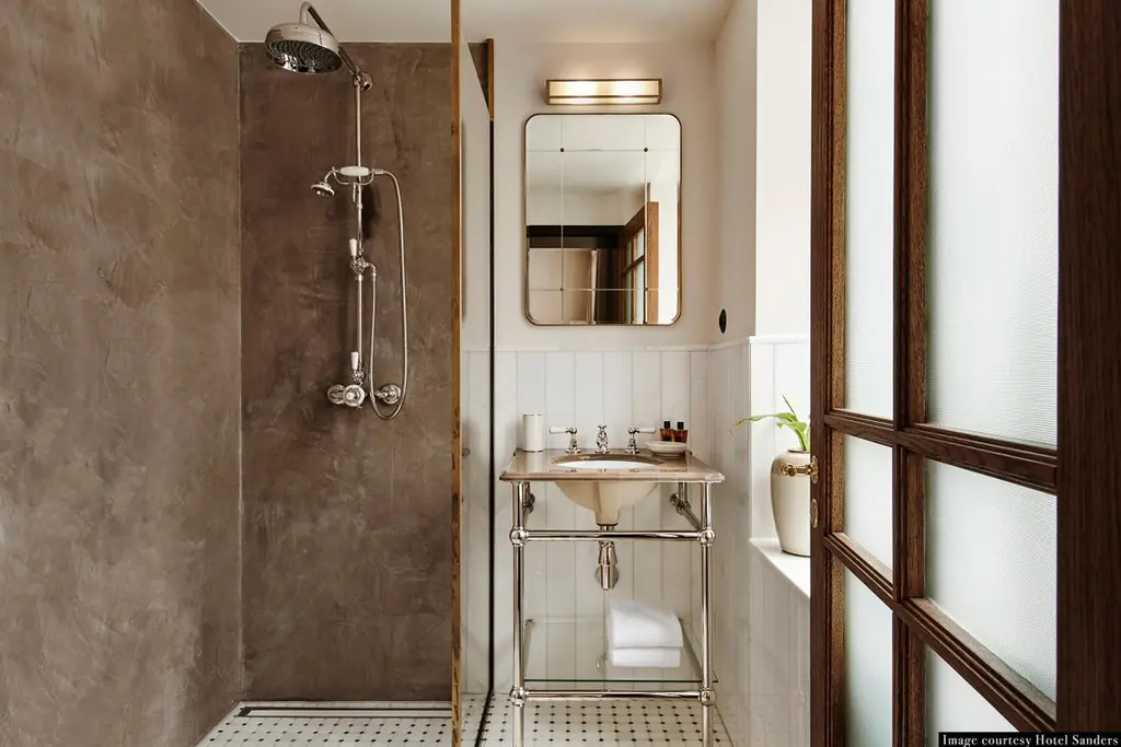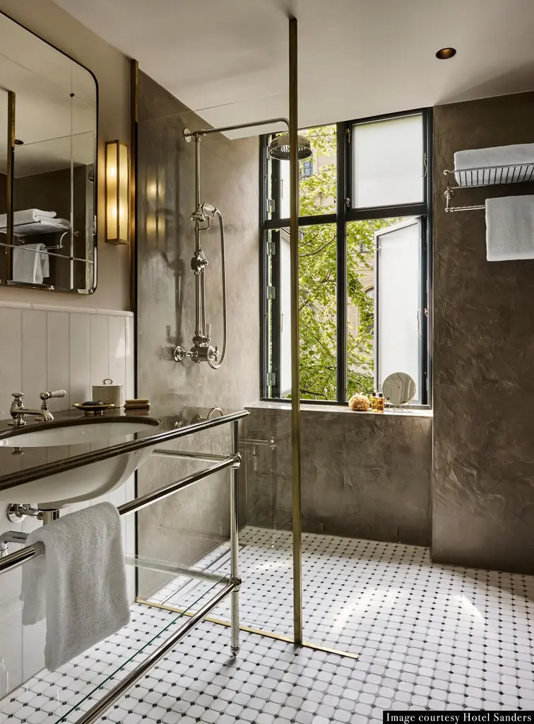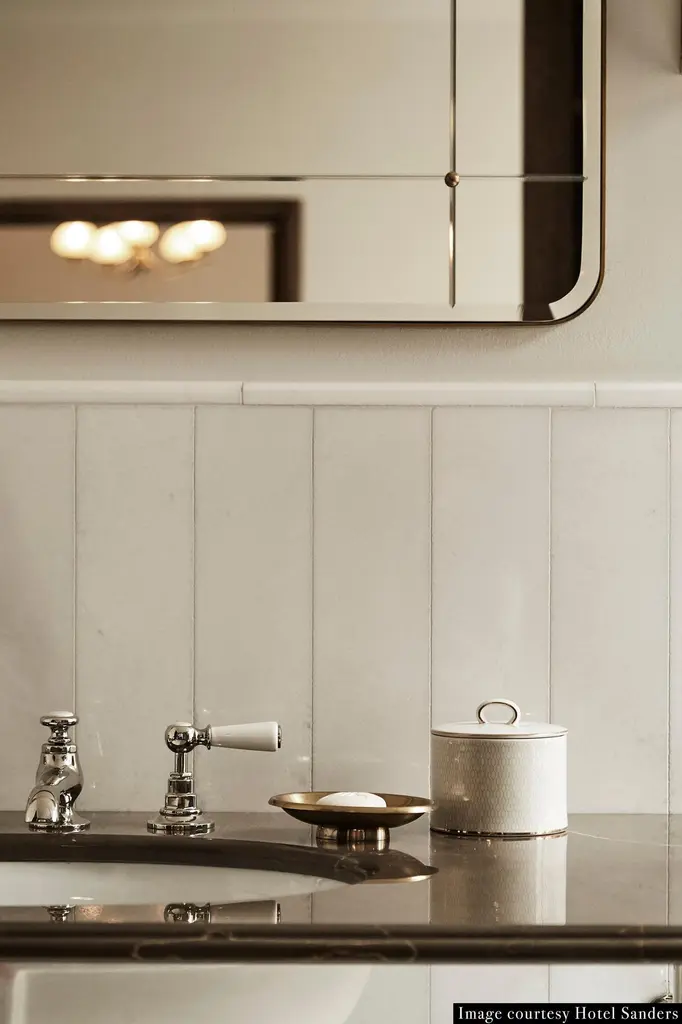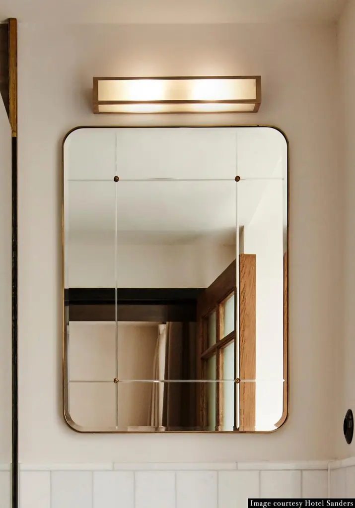 Bathroom mirror for Sanders by Lind + Almond in cut glass and brass, large a mirror in cut-glass and hand patinated brass, with brass studs. Developed especially for Sanders, Copenhagen's premier luxury boutique hotel.Available in two sizes. Handcrafted to order in Northern England.Bespoke sizes available.