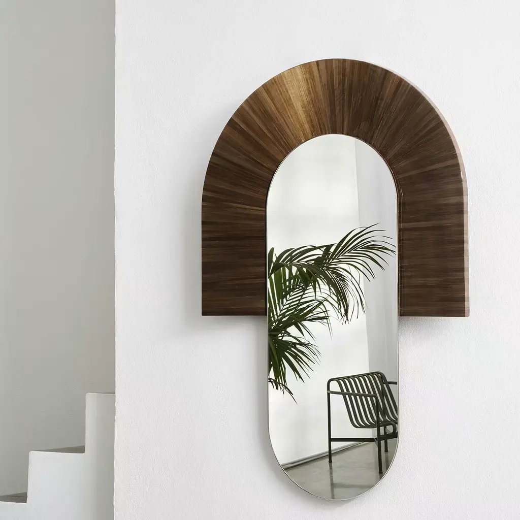 Reflect on your day in peace with the Santa Mirror by Marco Sorrentino. Framed in divine straw marquetry in glistening dark gold tones, the oval mirror can also help brighten up a dark hallway or corner. The mirror is available in pink, gray and natural straw so you can personalize it to your space.