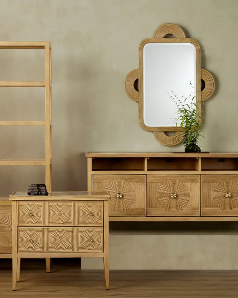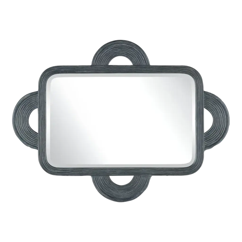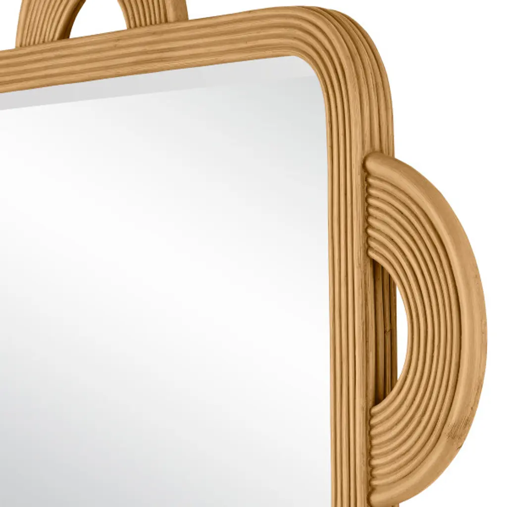 The Santos Rectangular Mirror is handmade of rattan, the rounded shapes extremely difficult to achieve with such a strong material. The finish covers the entire frame, bringing a subtle patina to the decorative mirror, another design detail worth noting. The beveled edges on the mirror are also done by hand, and there are two cleats on the back so that it can be hung vertically or horizontally.