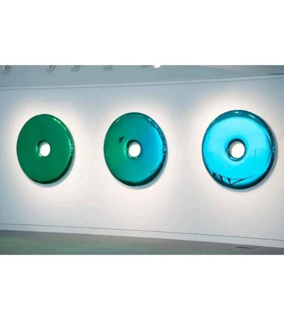 Sapphire Rondo 75 wall mirror by ZietaDimensions: Diameter 75 x Depth 6 cm Material: Stainless steel.Finish: Sapphire.Available finishes: Stainless steel, white matt, Sapphire/Emerald, Sapphire, Emerald, deep space blue, dark matter, or red Rubin. Also available in sizes ø75, ø120, and ø95cm. The Rondo mirror is made of stainless steel polished to a high gloss. Its polished surface is perfectly reflecting the light and other objects placed in the same room or hall. Largescale convexities that appear on the surface of the mirror are literally able to alter the space. It is like making an individualized interior design of the moment when by rolling the mirror from one place to another everybody can create or rediscover a well-known environment to a brand new and grasping concept. Depending on Rondo´s arrangement, either by hanging it or leaning at the wall, the mirror can change the perception of the surroundings.Deep, dark, blue, and intriguing. The new unique finish of Rondo Deep Space Blue takes the spectators for an unexpected journey into an undiscovered world of reflections. The mirror resembles cosmic wonders and at the same time can be fitted with the most demanding and elegant interiors. Color gives meaning and brings associations. The Gradient collection presents the whole spectrum of shades of cool sea depth. Carefully selected colors blend well with the hard steel.About Zieta: Zietas main goal is to deliver uniqueness and customization in design and construction while keeping the production, transport, and warehousing innovatively efficient.This is how they imagine the future world: Light, durable structures of customized applications produced on demand out of one-of-a-kind parts, yet efficiently.They use a computer-controlled production process. Customized pattern, customized form, customized function, one-of-a-kind product, and outstanding precision are what they deliver.You will find all of this philosophy reflected in the products. They research, they discover new possibilities, they play with forms and they deliver a beautiful, innovative, surprising outcome to people who love the design and who care about design development.They believe their work is a valuable contribution to the world of design not only by the unique beauty of the forms but most of all by opening ultra-innovative opportunities of forming and new paths for the world of the future.