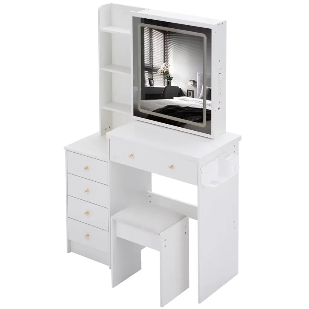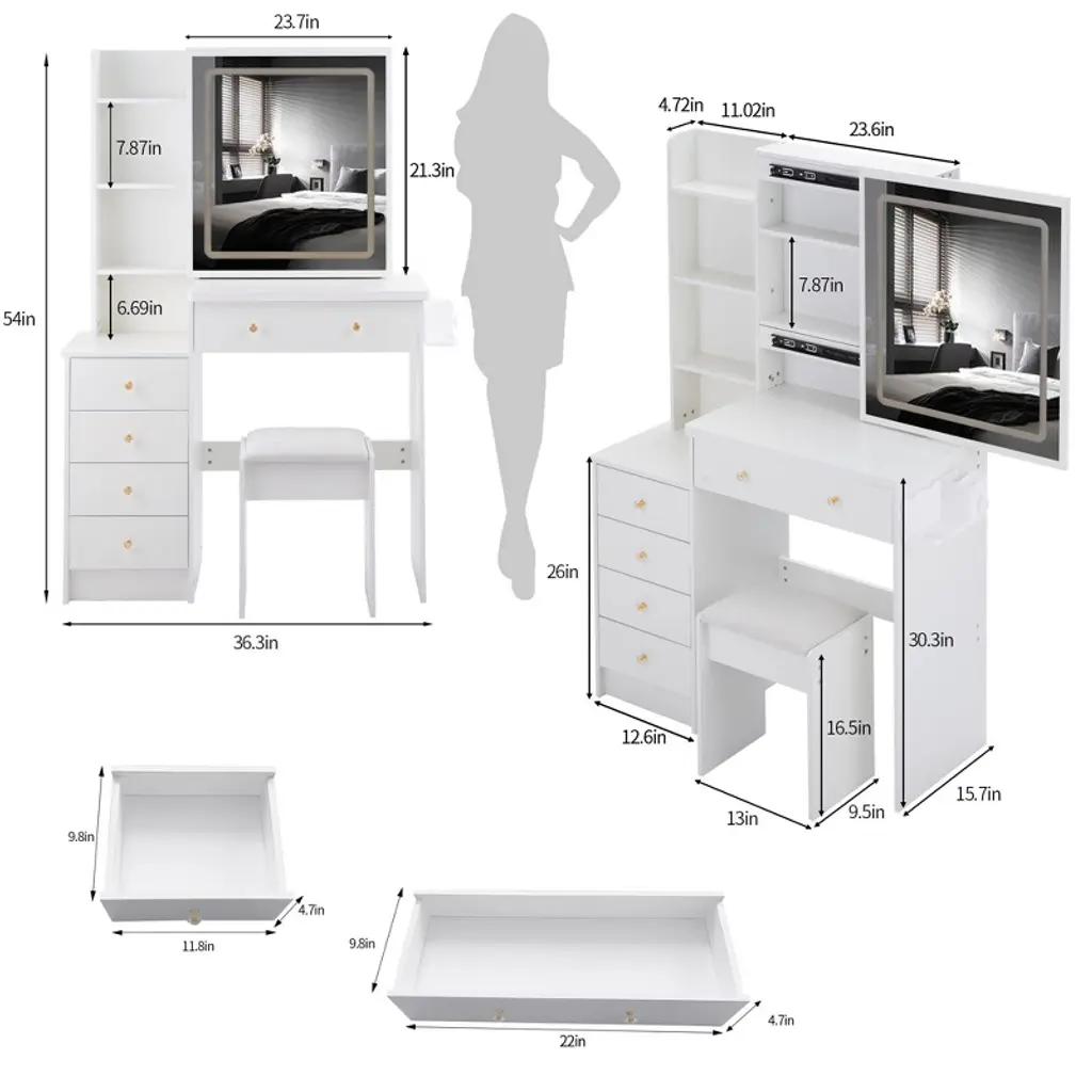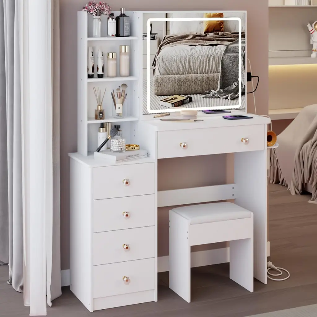 Sapphtopaz 37" Vanity Desk Modern Makeup Vanity With 2 Socket, Hair Dryer Stand, Led Sliding Mirror For Bedroom, Living Room, Locker Room, White