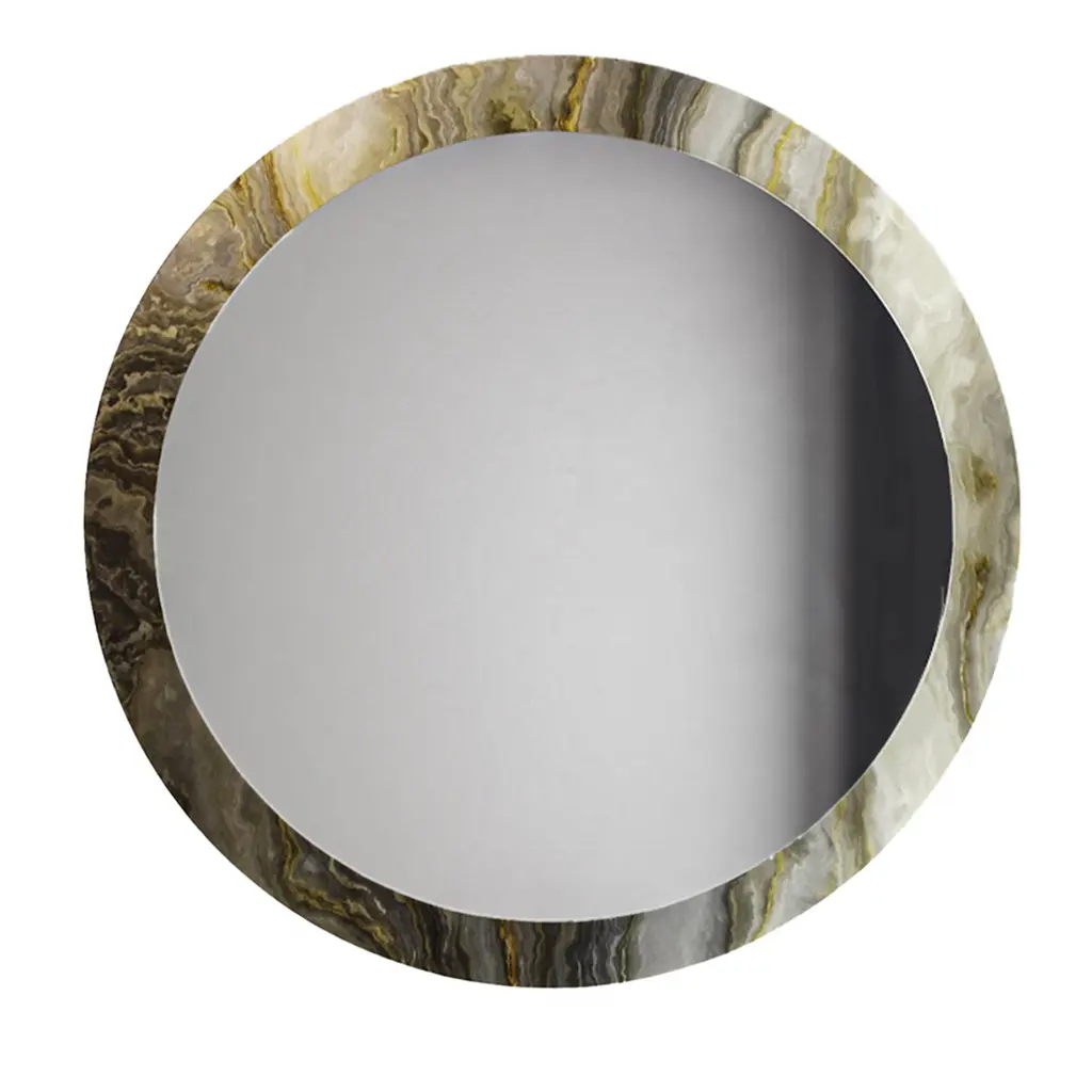 This stupendous wall mirror will imbue an elegant modern interior with subtly opulent charm, enhanced with the uniquely stylish frame reproducing the shades of Neptune with a stunning marble effect. Fashioned of sandblasted glass, the frame is available in other finishes upon request. A bold, charming design by Fabio Casali, it is equipped with LED lighting.