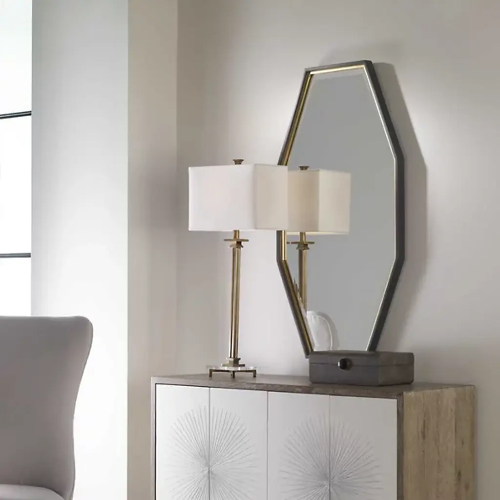 The Savion Wall Mirror from Uttermost breaks geometric norms with its confident octagonal shape. Grace Feyock's design intuition comes through in the precise contrast between the frame's exterior and its inner lip's metallic detailing. Perfect for grand foyers to intimate powder rooms, this substantial piece is particularly suited for contemporary and Art Deco spaces that need definition.