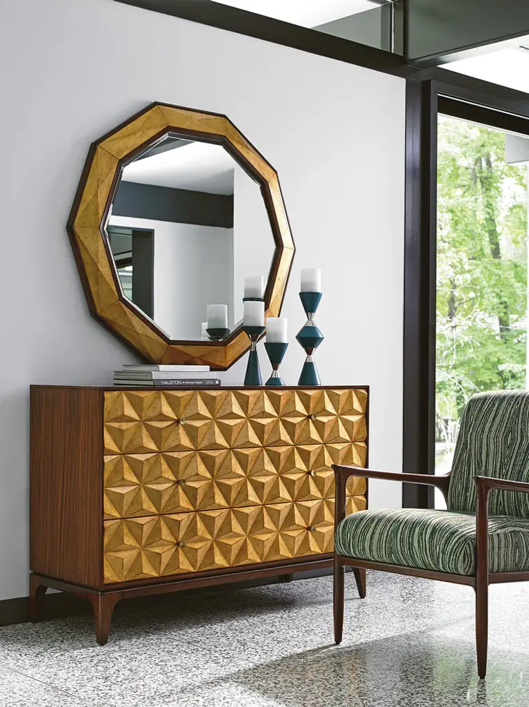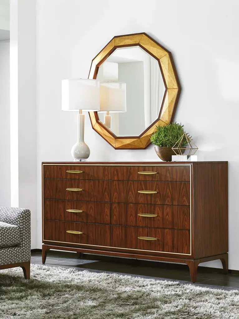 The 10-sided design of the mirror features diamond facets that sparkle in hand-burnished gold leaf.