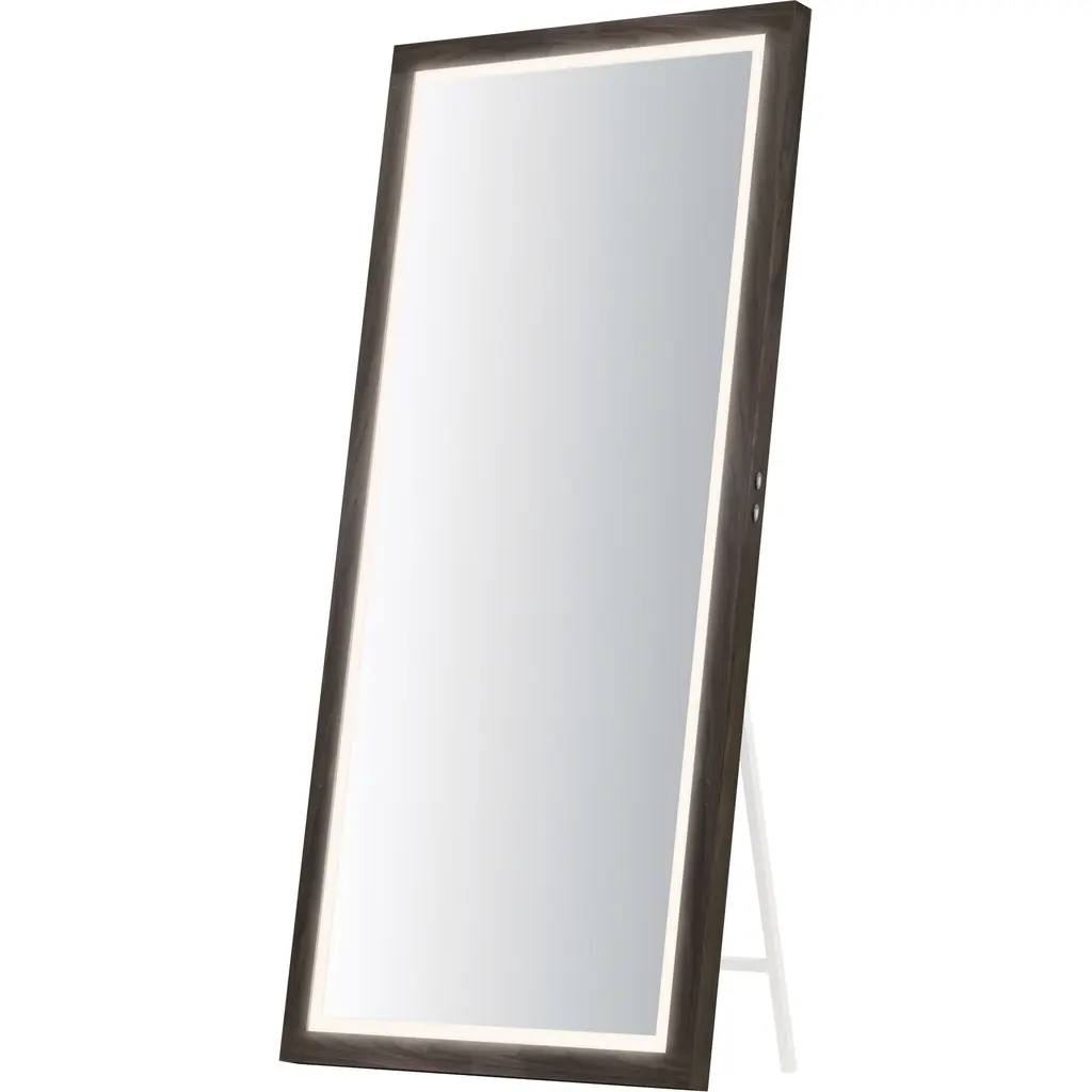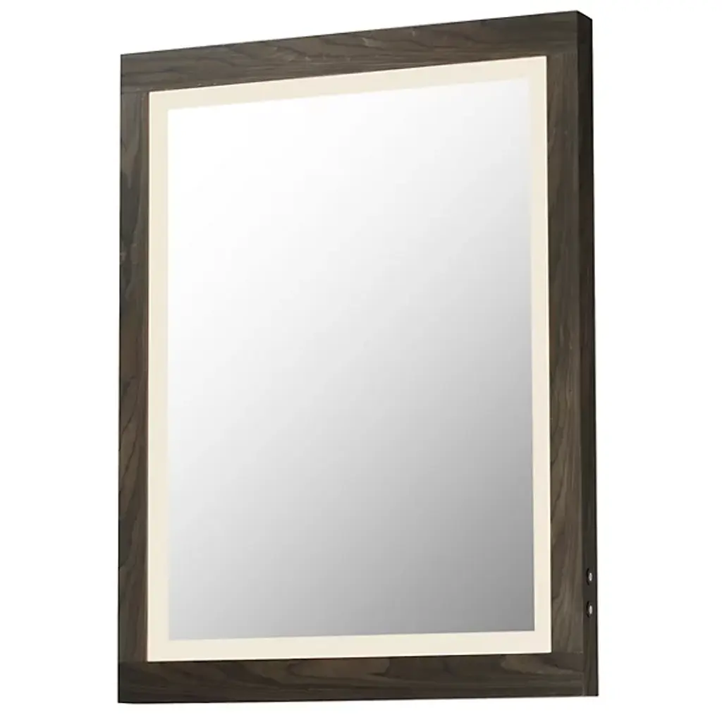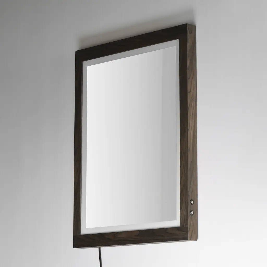 A wood-framed mirror is offered in a choice of Walnut or Distressed Oak, combining natural elements with modern functionality. A 2-inch frosted band along the frame's interior is backlit with LEDs, providing optimal illumination above a vanity. A discreetly hidden control along the edge of the frame allows easy selection between 3000K, 4000K, and 5000K color temperatures for personalized lighting.