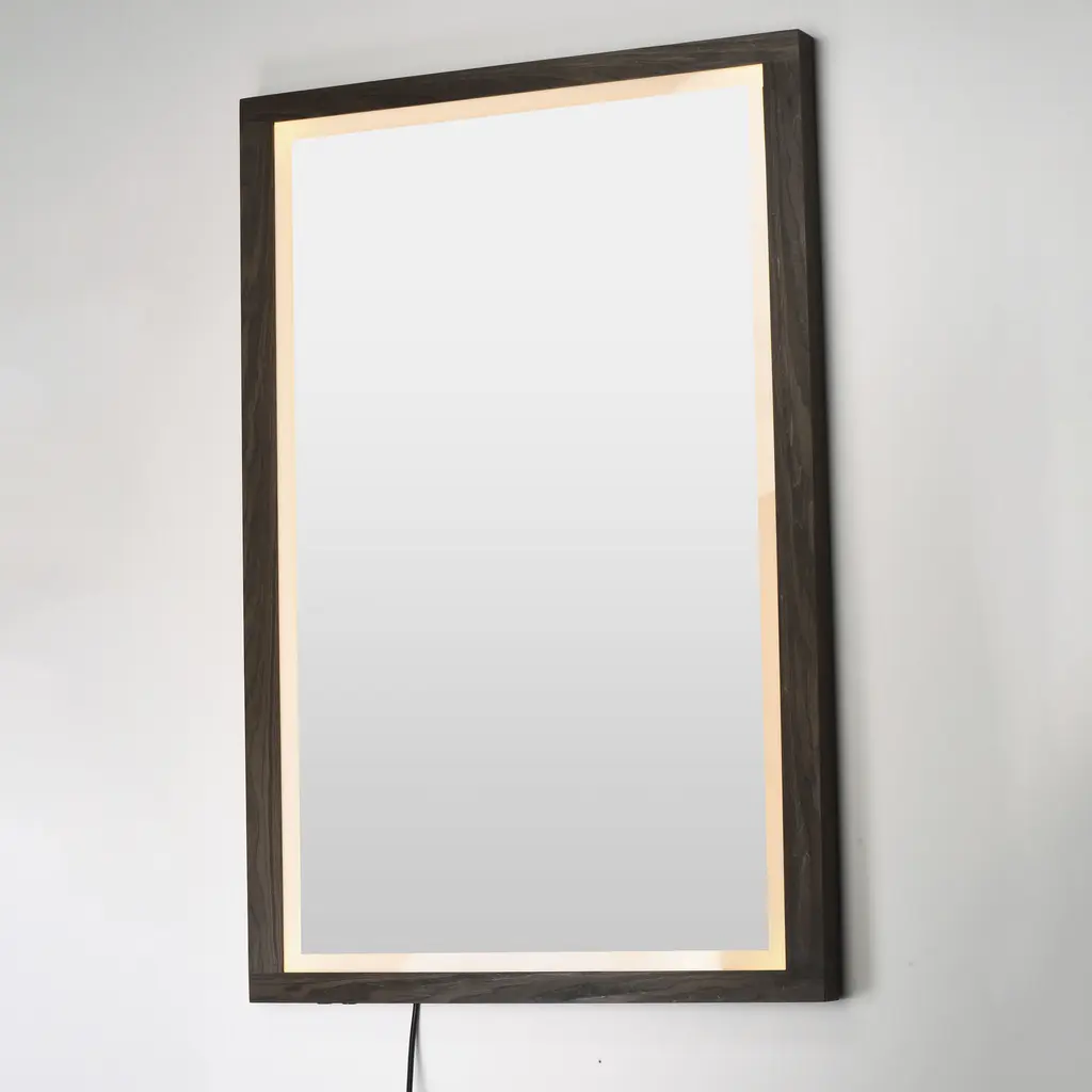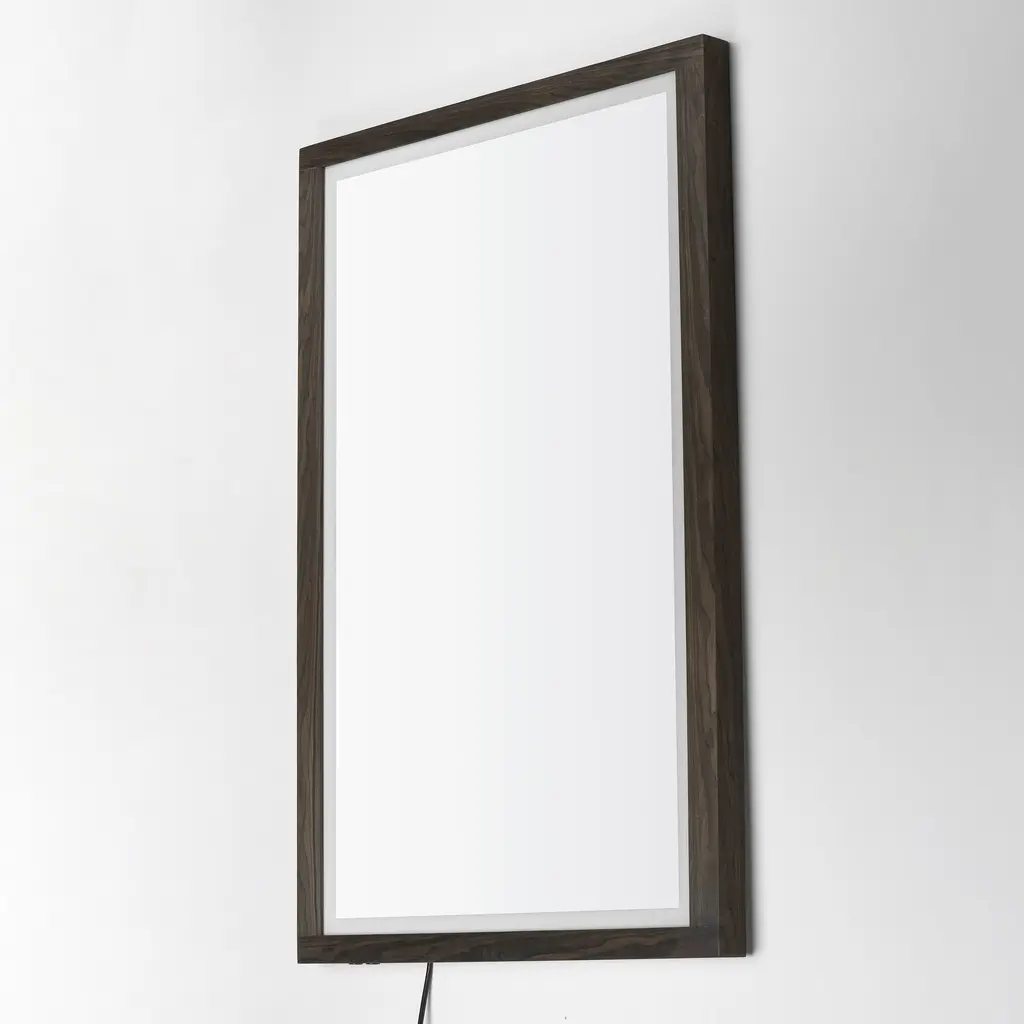 A wood-framed mirror is offered in a choice of Walnut or Distressed Oak, combining natural elements with modern functionality. A 2-inch frosted band along the frame's interior is backlit with LEDs, providing optimal illumination above a vanity. A discreetly hidden control along the edge of the frame allows easy selection between 3000K, 4000K, and 5000K color temperatures for personalized lighting.