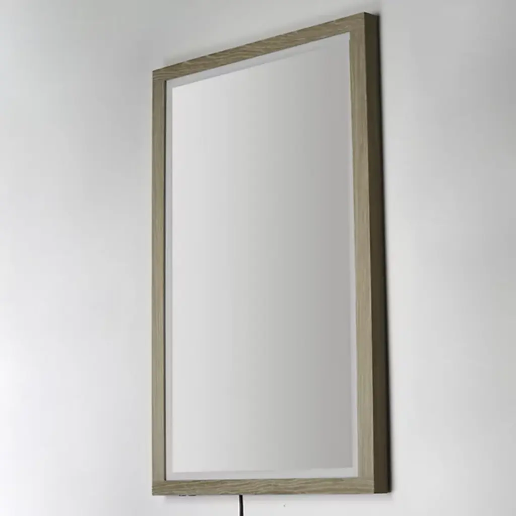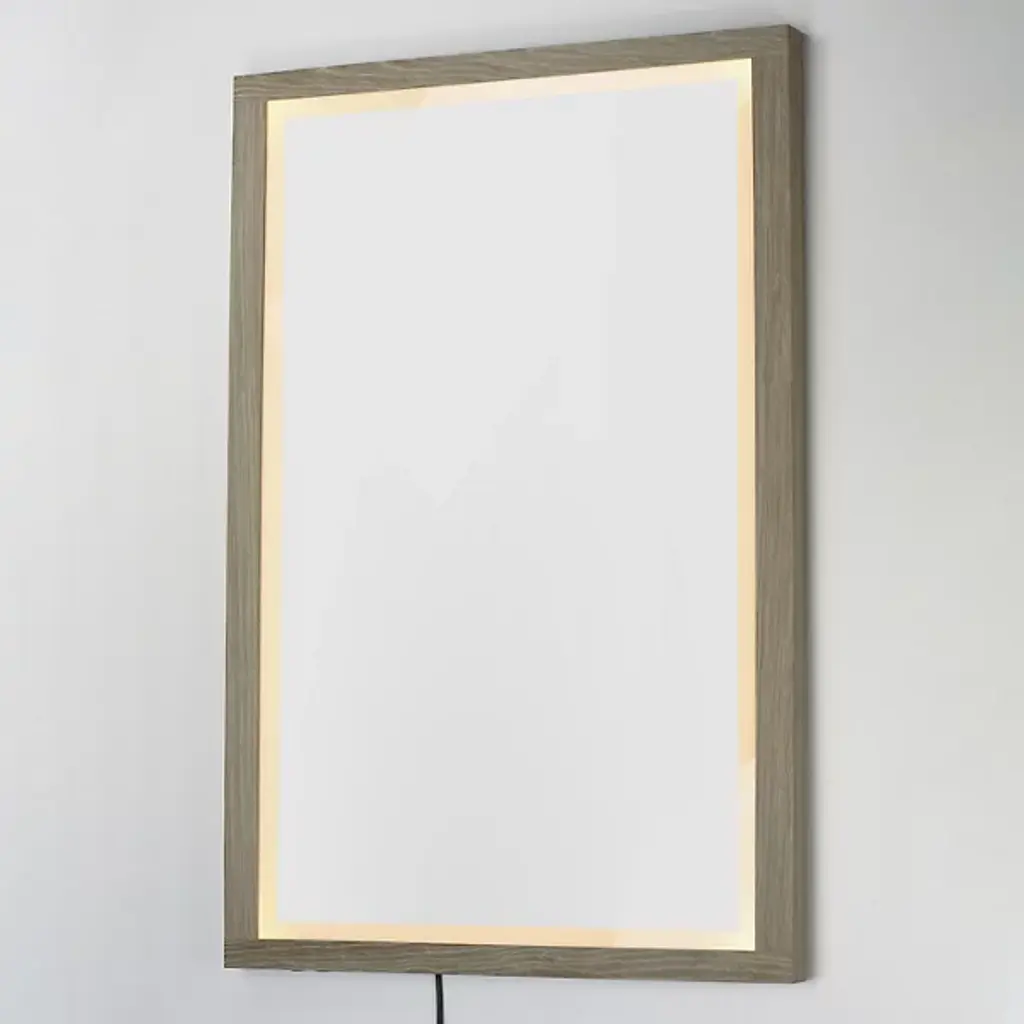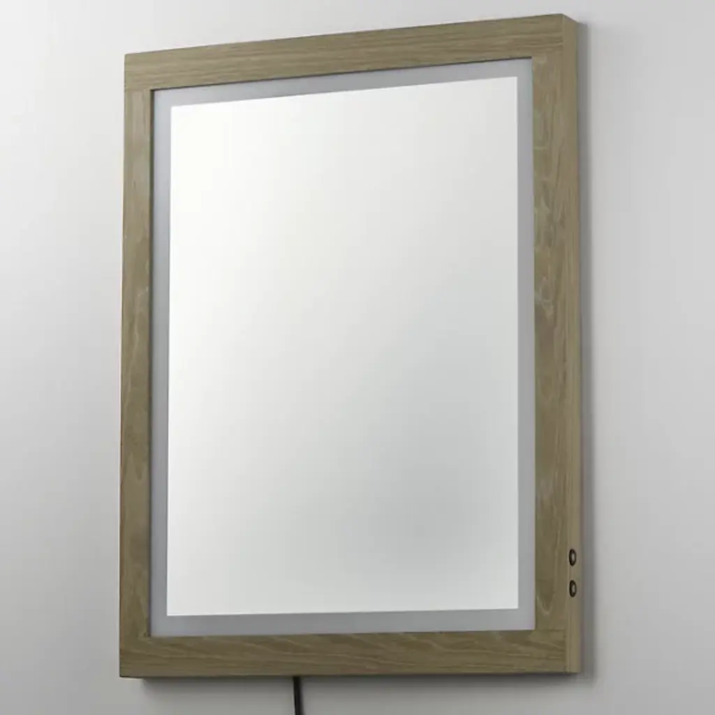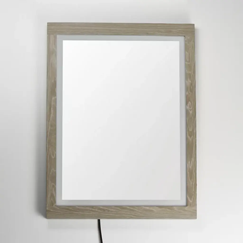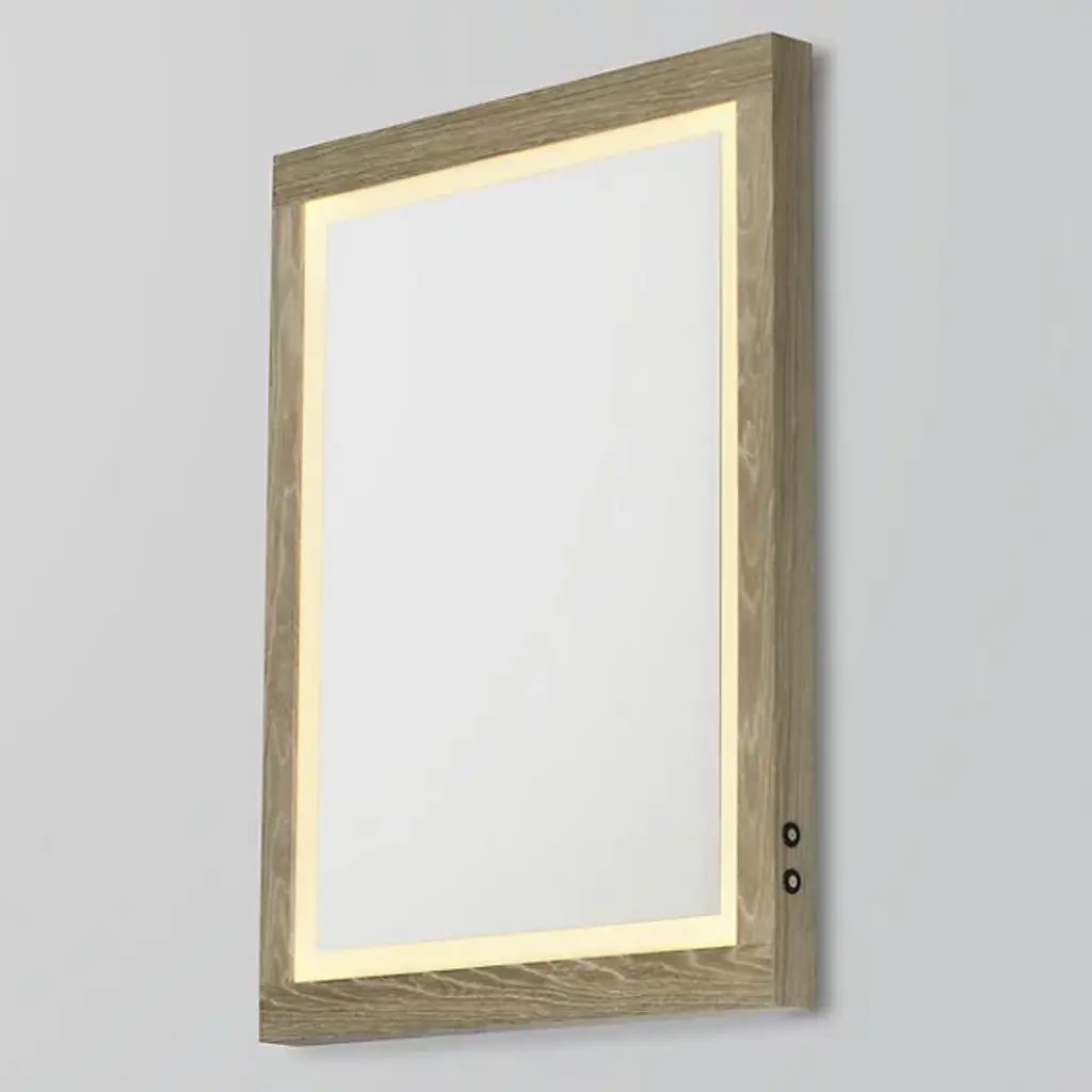 The Sawyer LED Mirror from ET2 Lighting combines wood craftsmanship with integrated lighting technology through its natural grain frame and illuminated inner border. The frosted band that runs along the interior edge diffuses LED light evenly across the face, eliminating harsh shadows during daily grooming tasks. Hidden controls at the edge allow personalization of the lighting temperature to match different times of day or specific needs. This mirror brings together traditional materials and modern functionality in a seamless package that enhances bathroom aesthetics beyond mere utility.