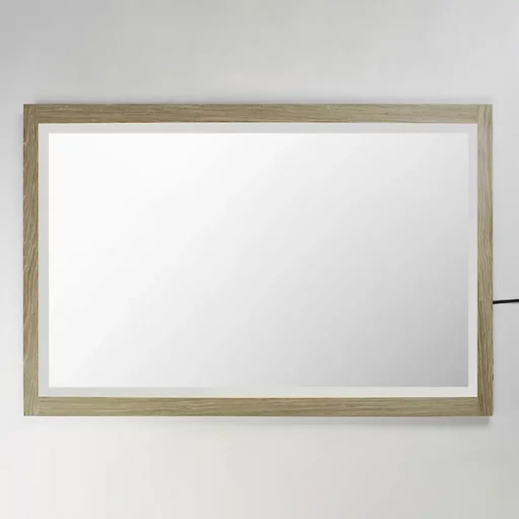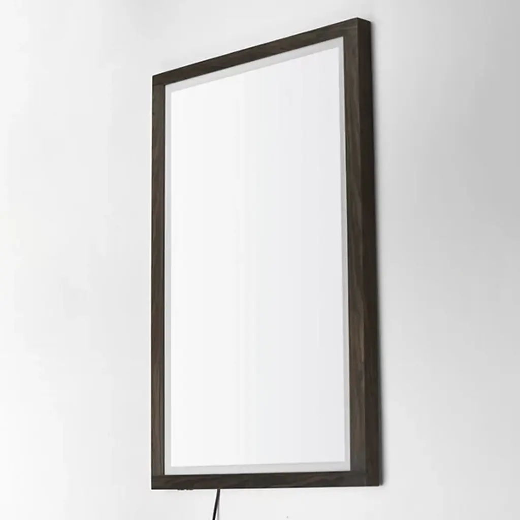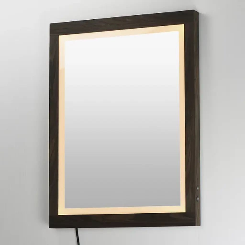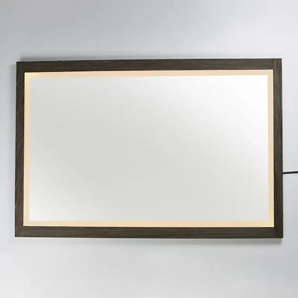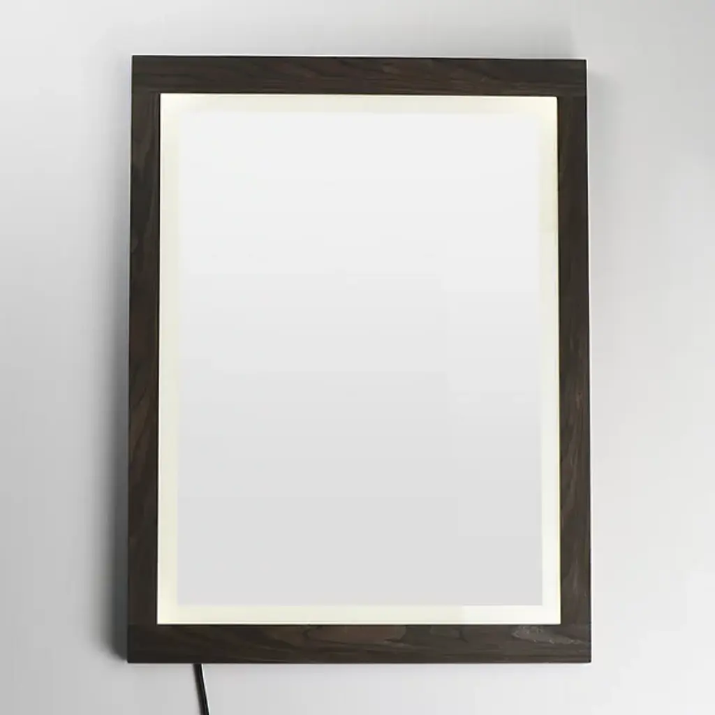 The Sawyer LED Mirror from ET2 Lighting combines wood craftsmanship with integrated lighting technology through its natural grain frame and illuminated inner border. The frosted band that runs along the interior edge diffuses LED light evenly across the face, eliminating harsh shadows during daily grooming tasks. Hidden controls at the edge allow personalization of the lighting temperature to match different times of day or specific needs. This mirror brings together traditional materials and modern functionality in a seamless package that enhances bathroom aesthetics beyond mere utility.