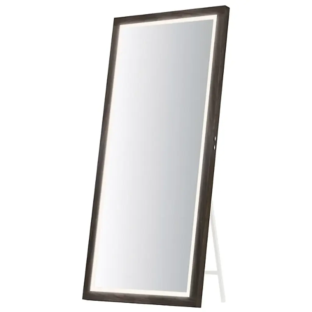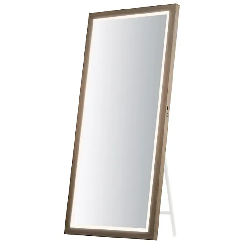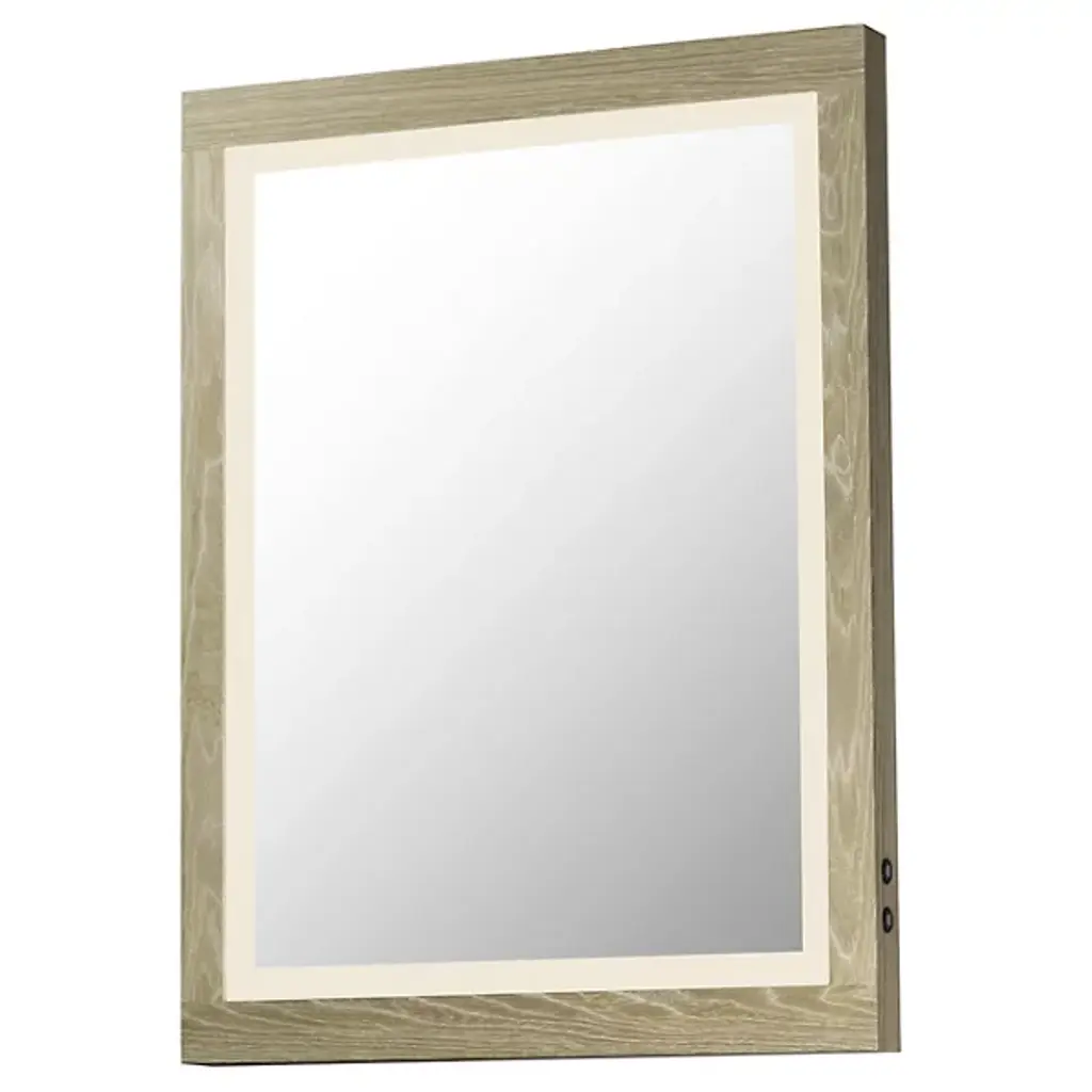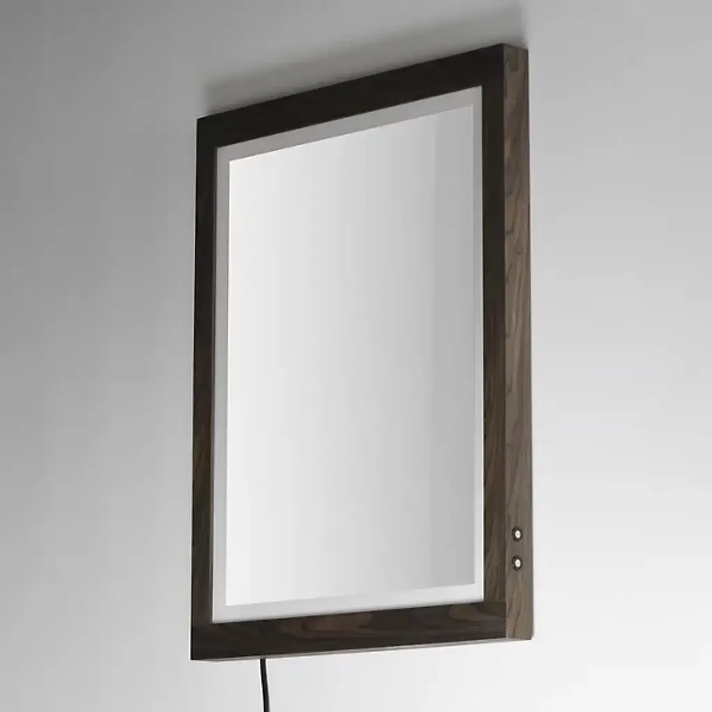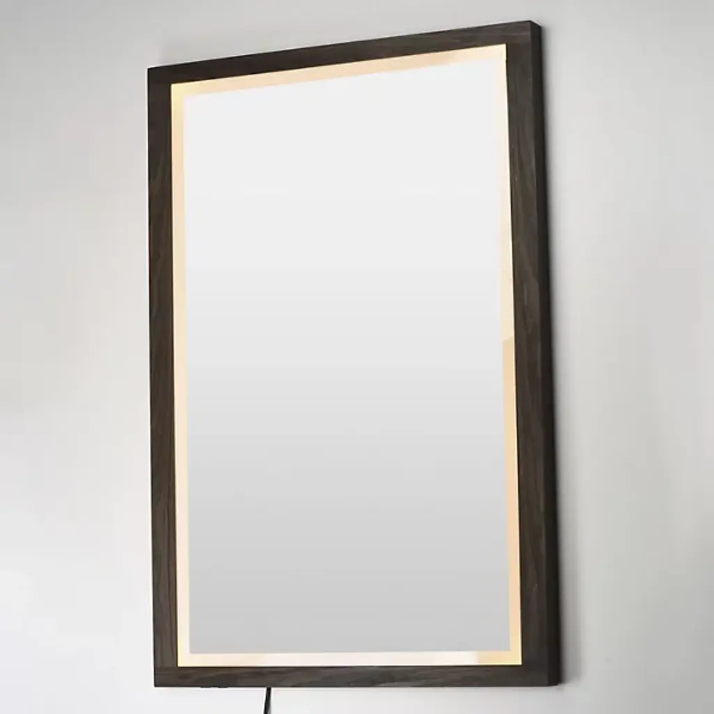The Sawyer LED Mirror from ET2 Lighting combines wood craftsmanship with integrated lighting technology through its natural grain frame and illuminated inner border. The frosted band that runs along the interior edge diffuses LED light evenly across the face, eliminating harsh shadows during daily grooming tasks. Hidden controls at the edge allow personalization of the lighting temperature to match different times of day or specific needs. This mirror brings together traditional materials and modern functionality in a seamless package that enhances bathroom aesthetics beyond mere utility.
