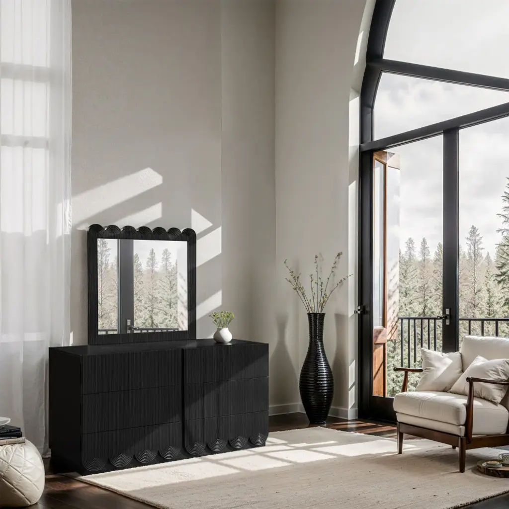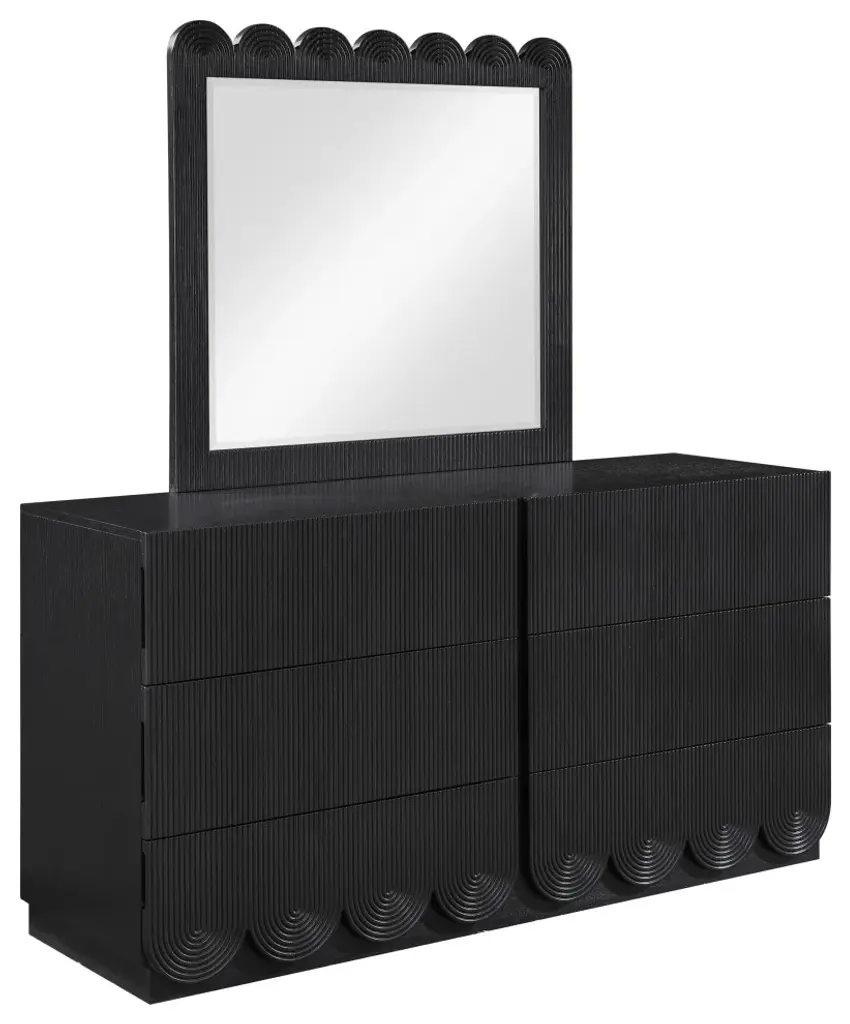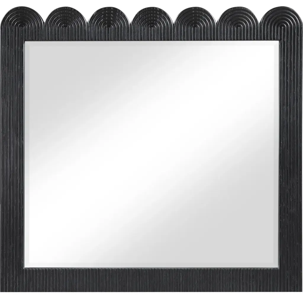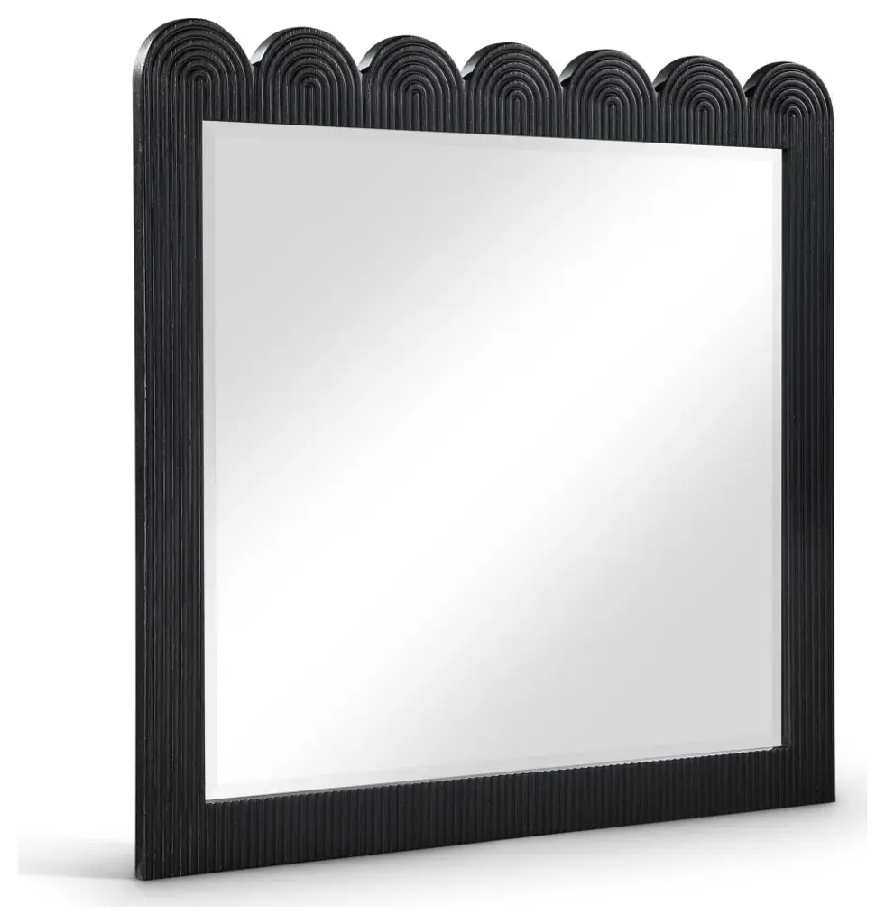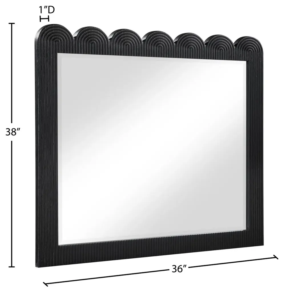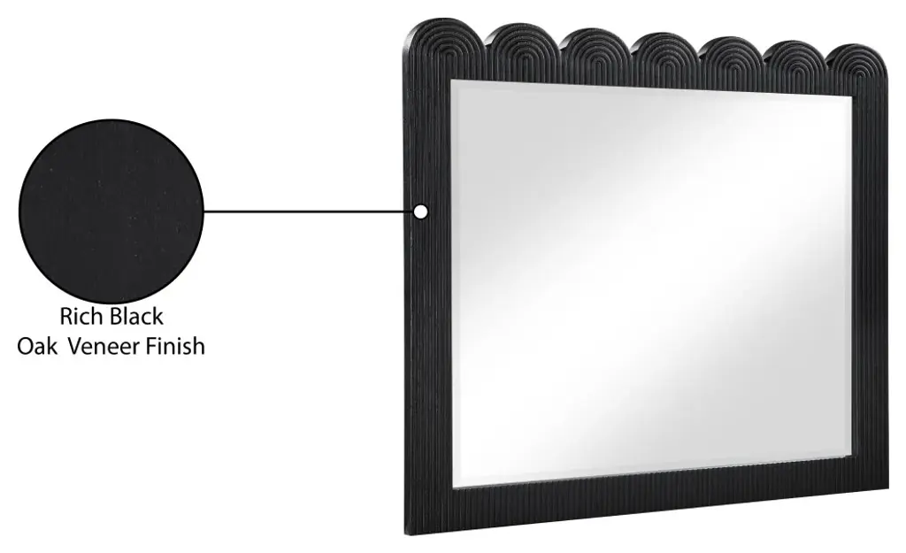 Indulge in the allure of the Black Scallop Mirror by Meridian Furniture. Its captivating design and luxurious Black elevate any space with effortless elegance. Crafted with precision and durability in mind, this stunning piece becomes the focal point of gatherings, fostering moments of connection and warmth. Embrace sophistication and style with the Scallop Mirror, a testament to exquisite taste and timeless beauty.Overall Product Dimensions: 36" W x 1" D x 38" HRich Black FinishOak VeneerArt Deco Style