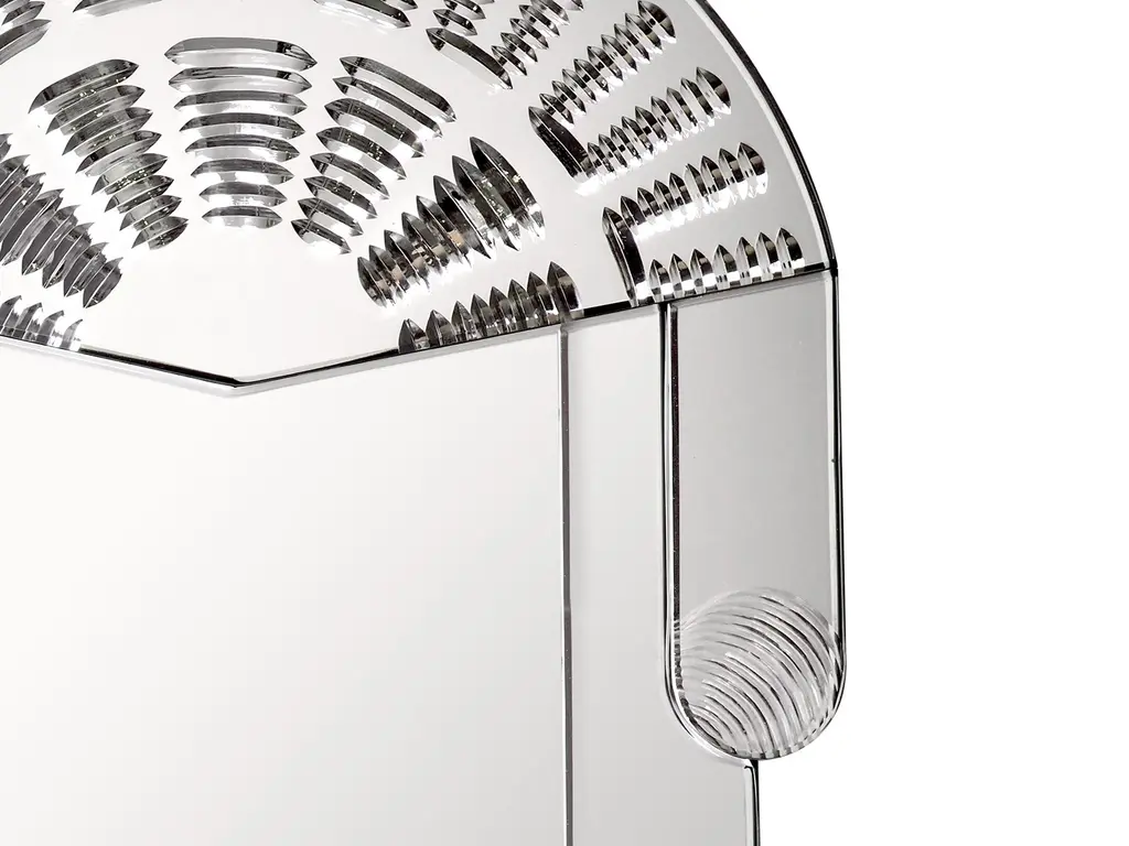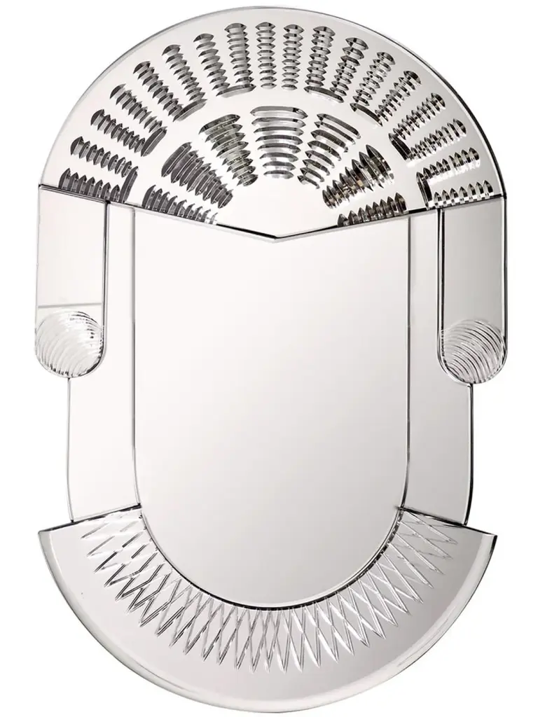 Designed by Nikolai Kotlartcyk for Portego, Scena is a series of solid glass wall mirrors full of depth and bold graphic lines, expertly crafted by hand in Murano. They reference a repeated use of perspective and illusion within the art, architecture, and artisan crafts of the Veneto region. A central inspiration were the forms and spatial designs of the architect Andrea Palladio and his constant focus on the vista within his work. Working with the skilled glass artists of Murano, a subtle use of perspective and depth was created by the intricate carving and grinding of the mirrored glass surfaces, which were then silvered to give depth to the details. The back in wood, painted in a cream color, features a wall hanger. Numbered,Labeled by Maker