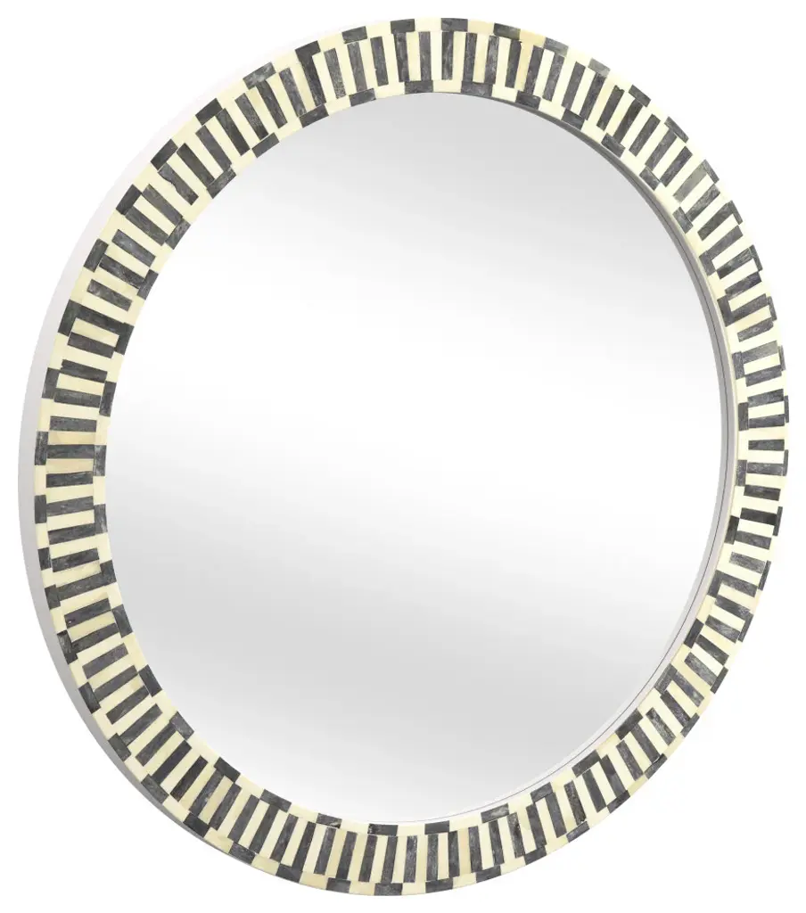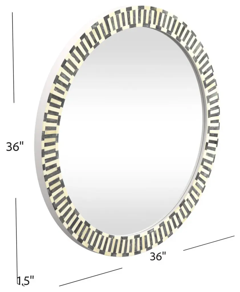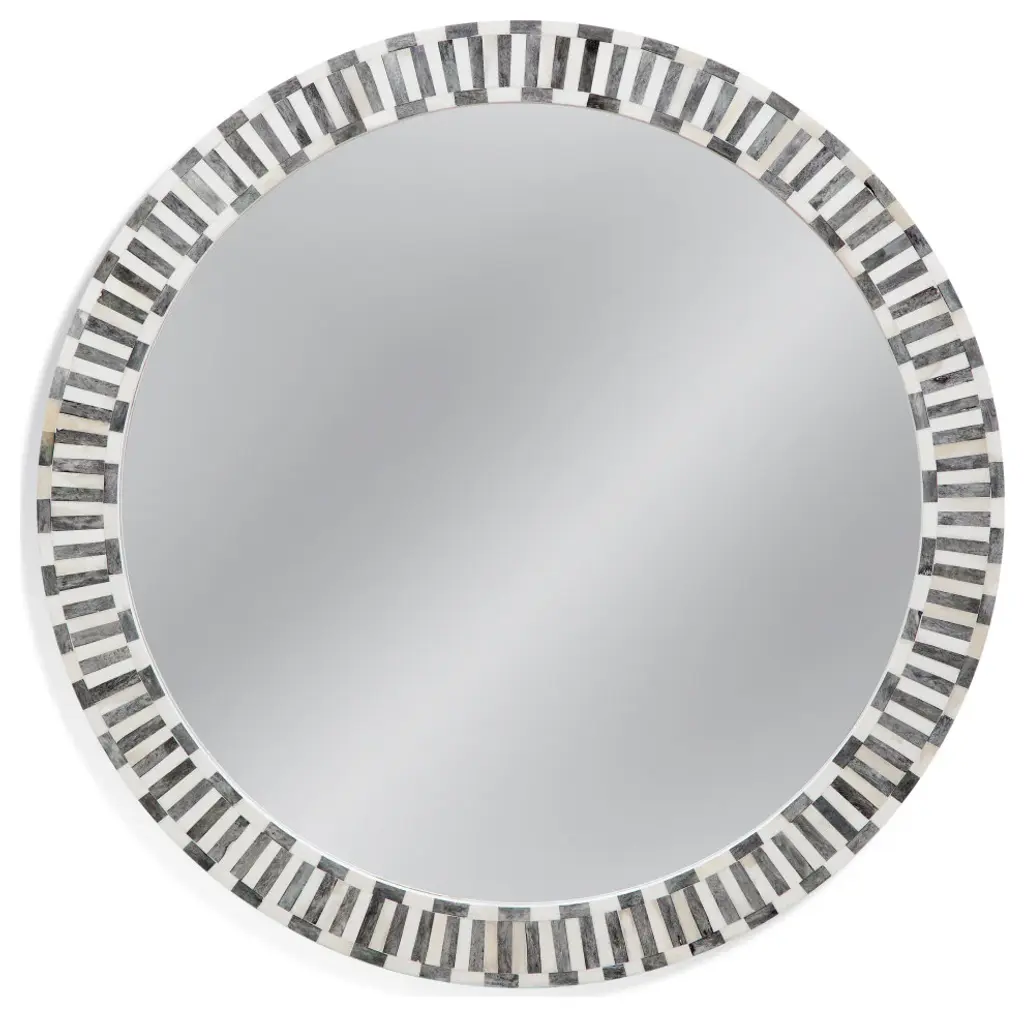 Sceptre Wall Mirror is round framed in a blue and white bone frame. Includes two "D" ring attachment points for ease of access for hanging.Features:This wall mirror features contemporary stylingFeatures a blue frame constructed of bone and resinEquipped with D ring hangers for easy wall mountingFor over a century, Bassett Mirror has been synonymous with style and quality, transforming homes with its sophisticated and timeless designs. With a wide-ranging collection of furniture, lighting, mirrors, and art, Bassett Mirror seamlessly blends modern style with classic appeal. From rustic modern to luxe glam, each piece is thoughtfully crafted to inspire and elevate any space. Committed to exceptional value and customer care, Bassett Mirror makes it easy for homeowners to create beautiful, personalized interiors with confidence.