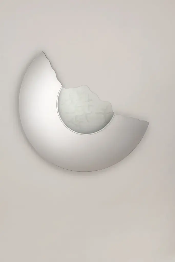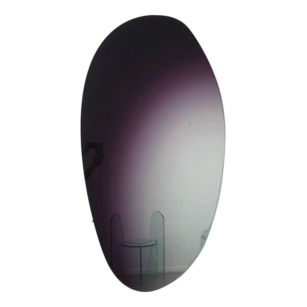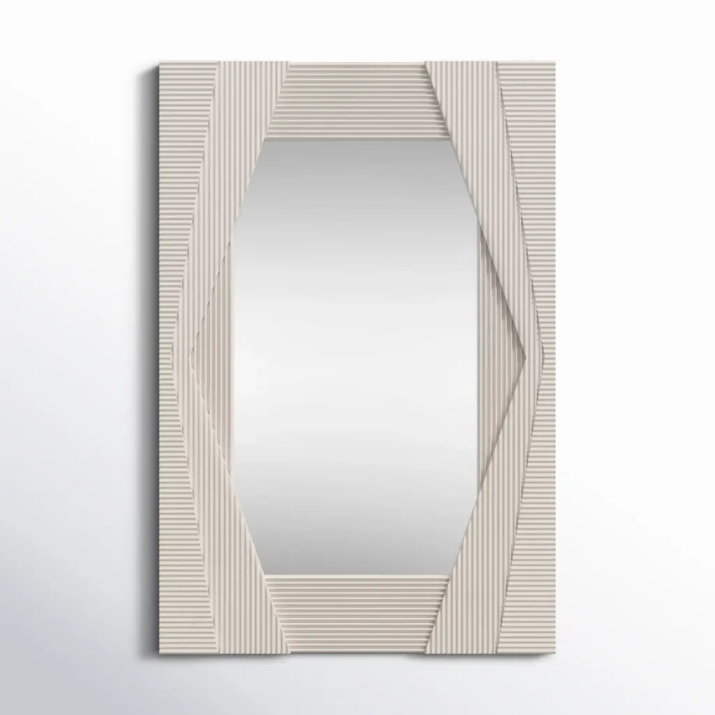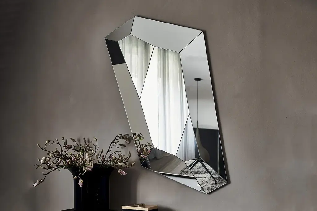 Set of mirrors with frame-like motifs and satined decorations on the transparent part, which repeat the reflections of glass. The cut chamfered edge enhances the frame motif. The rectangularshaped mirror has a double horizontal and vertical fixture.