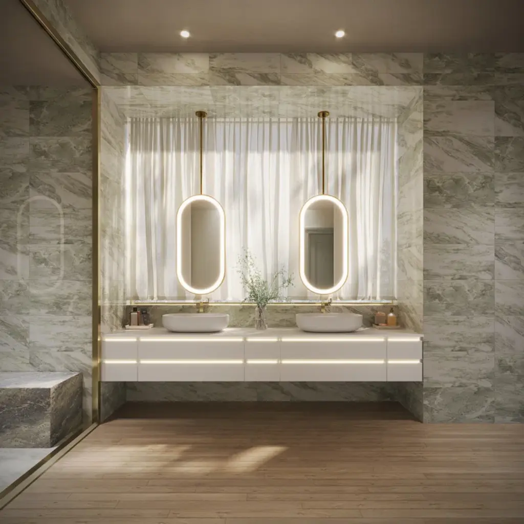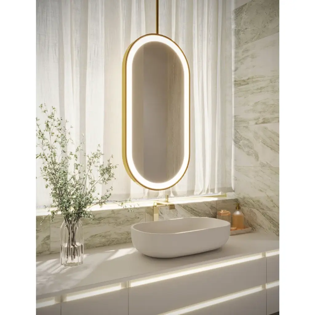 The Sculpt Hanging Lighted Mirror encapsulates elevated living through its architectural forms, finishes, and full illumination task lighting. By reimagining getting ready areas as spaces that can soothe, enhance, and inspire wellbeing, Sculpt brings a transformative addition to any corner of your home through its unique suspension and radiant light.