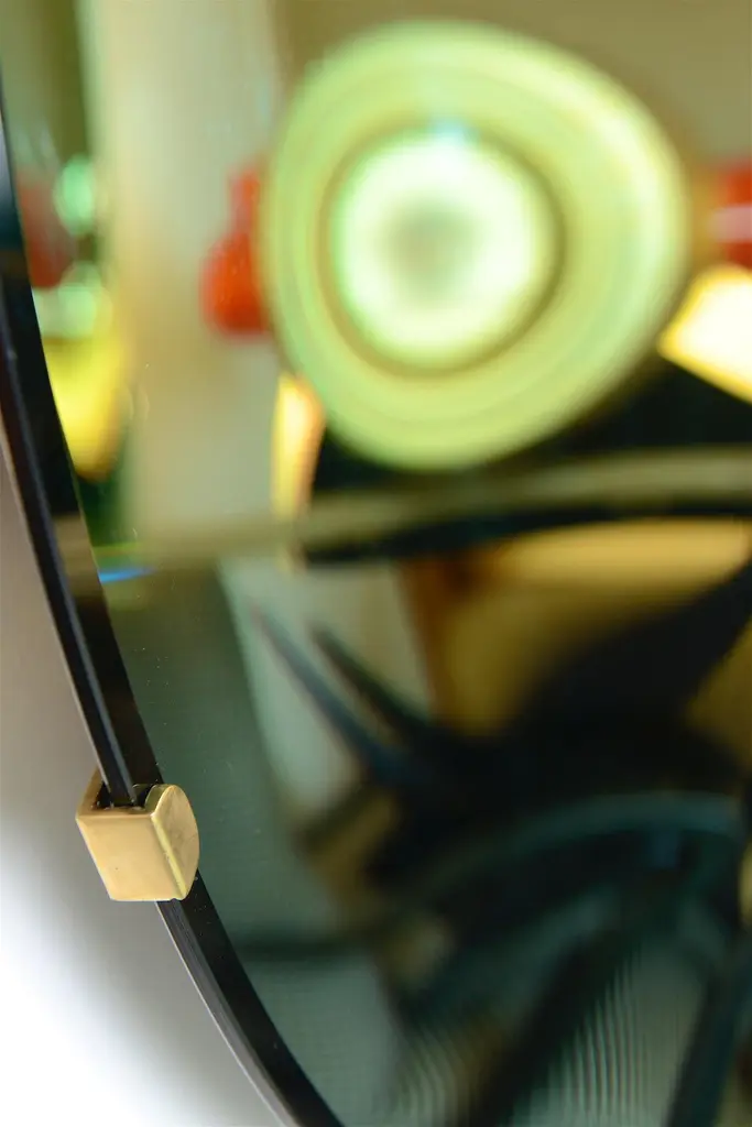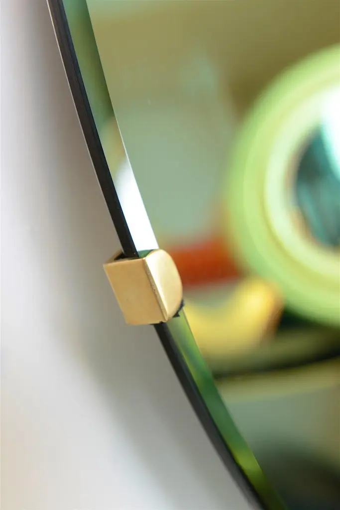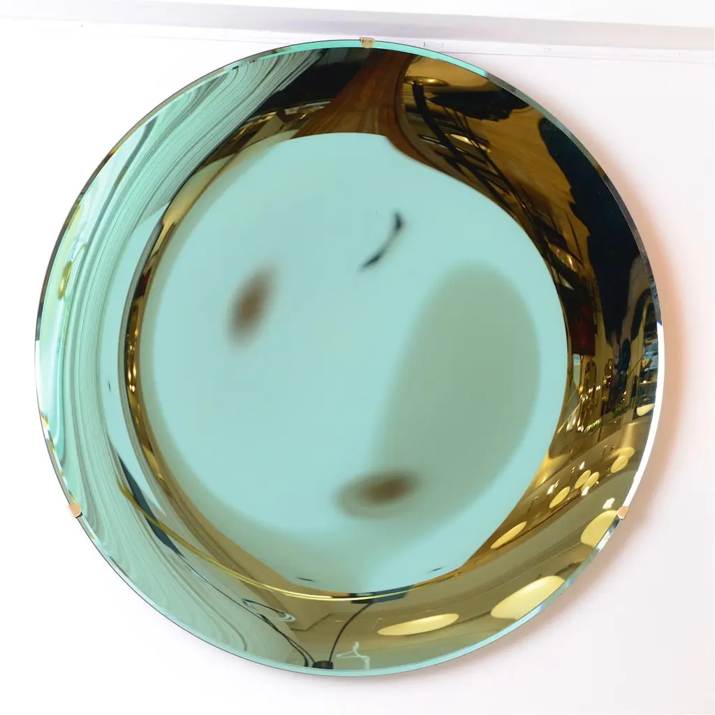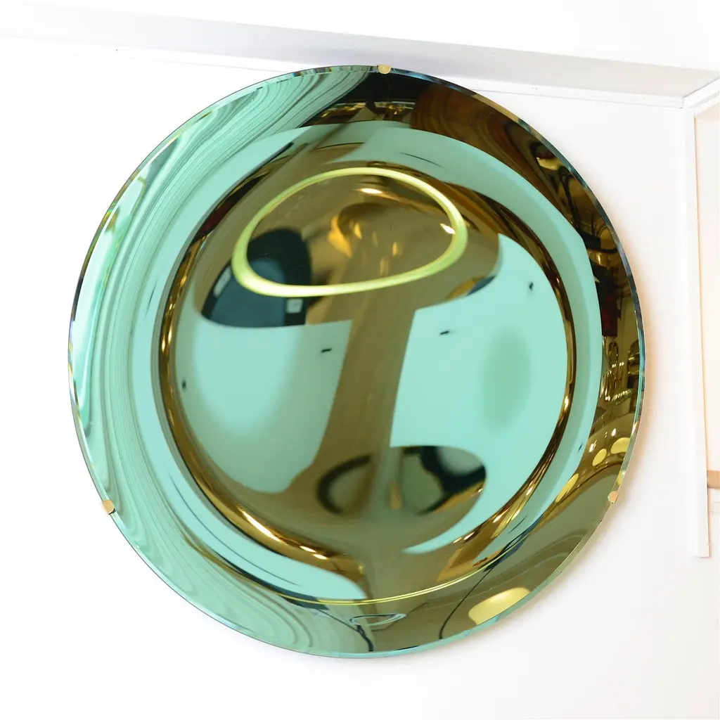 Anish Kapoor style concave mirror. Sculptural green glass mirror, with brass wall fixing.Excellent quality mirror with amazing reflections. Available in pink gold, copper and blue. Also in antique glass.Please ask re alternative colours. Custom sizes also available.