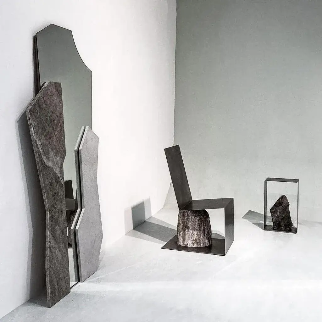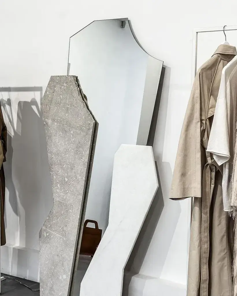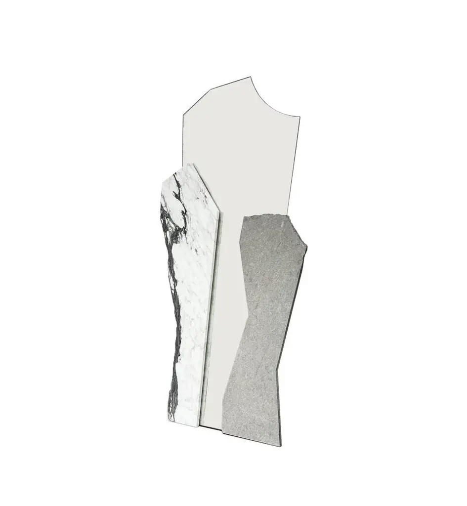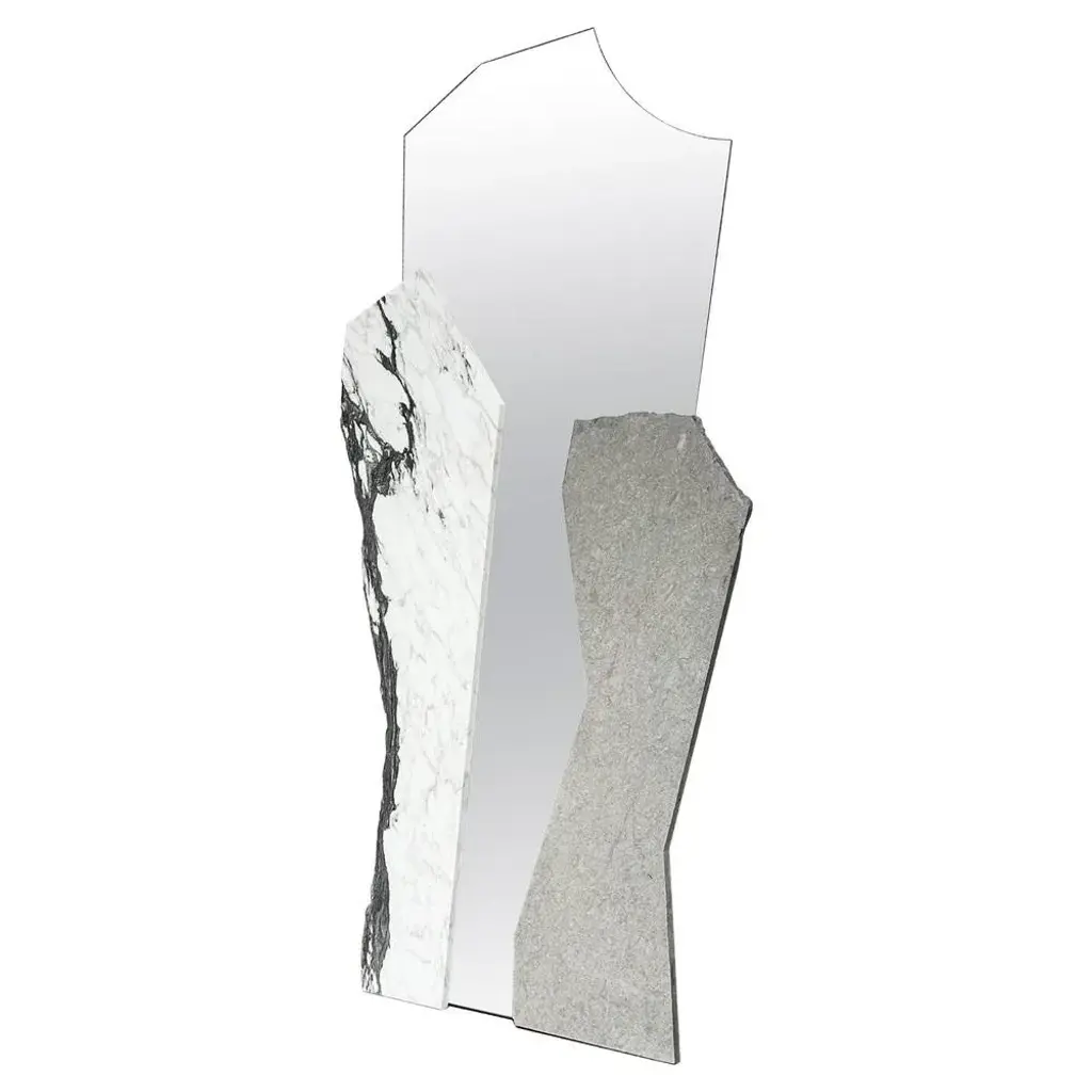 Sculptural mirror d by alexandra madirazza dimensions: w 90 x d 5 x h 190 cm. Materials: marble, mirror. The sculptural mirrors are made from leftover marble - no two stones will ever be the same. They will vary in size, color, and surface. The mirror part itself is basically the same, but this too can be changed as desired.