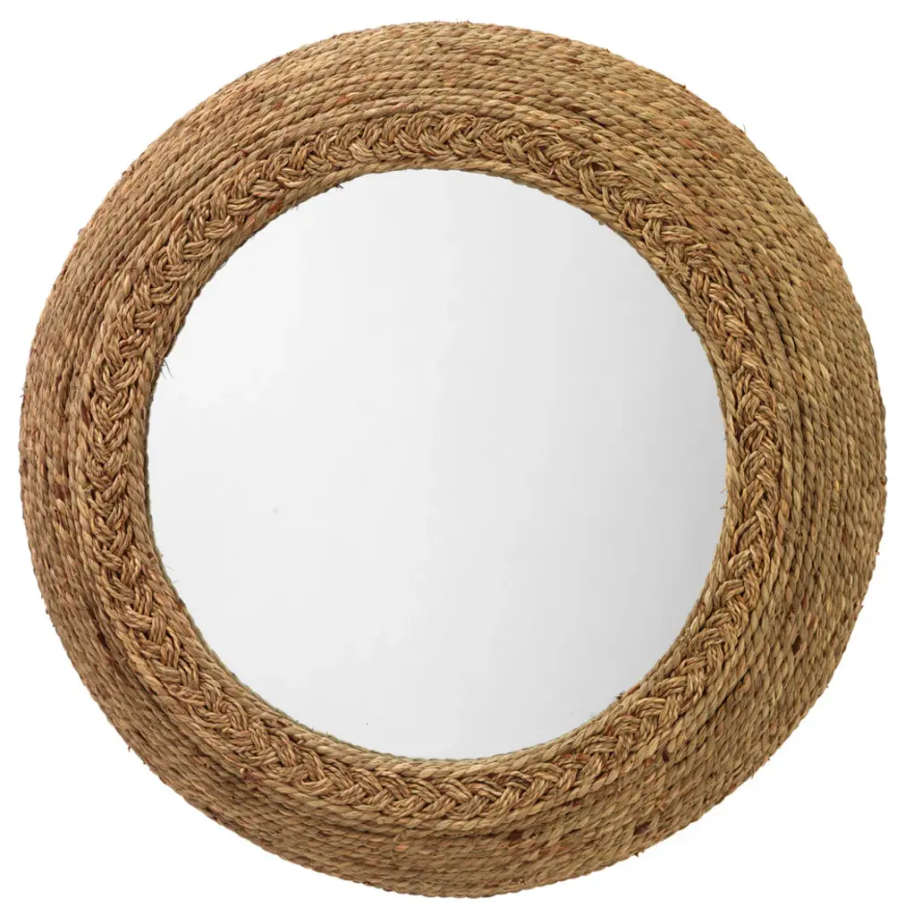 Add natural texture and an instant coastal flair to any room in your home. Hand-wrapped in natural seagrass, this mirror adds dimension and depth to any room. •Hand-woven of 100% Natural Seagrass•Non beveled glass mirror•Hangs vertical only•Natural Tone Will Vary The inherent variations in tone and texture of natural Seagrass are preserved, to create pieces rich in detail and natural beauty. These unique imperfections give our products character and individuality, with each piece having its own personality. We"™ve done our best to represent product as closely as possible; however, different lighting and settings in photography, phone or computer settings may slightly affect color and appearance. •Mirror Surface: 16""H x 16""W•D-Loop Hanging Mechanism•Frame: 5""W•MDF BackingCare Instructions: Wipe frame with a soft, dry cloth. Wipe glass with standard glass cleaner. DO NOT use cleaners or abrasives on mirror frame.
