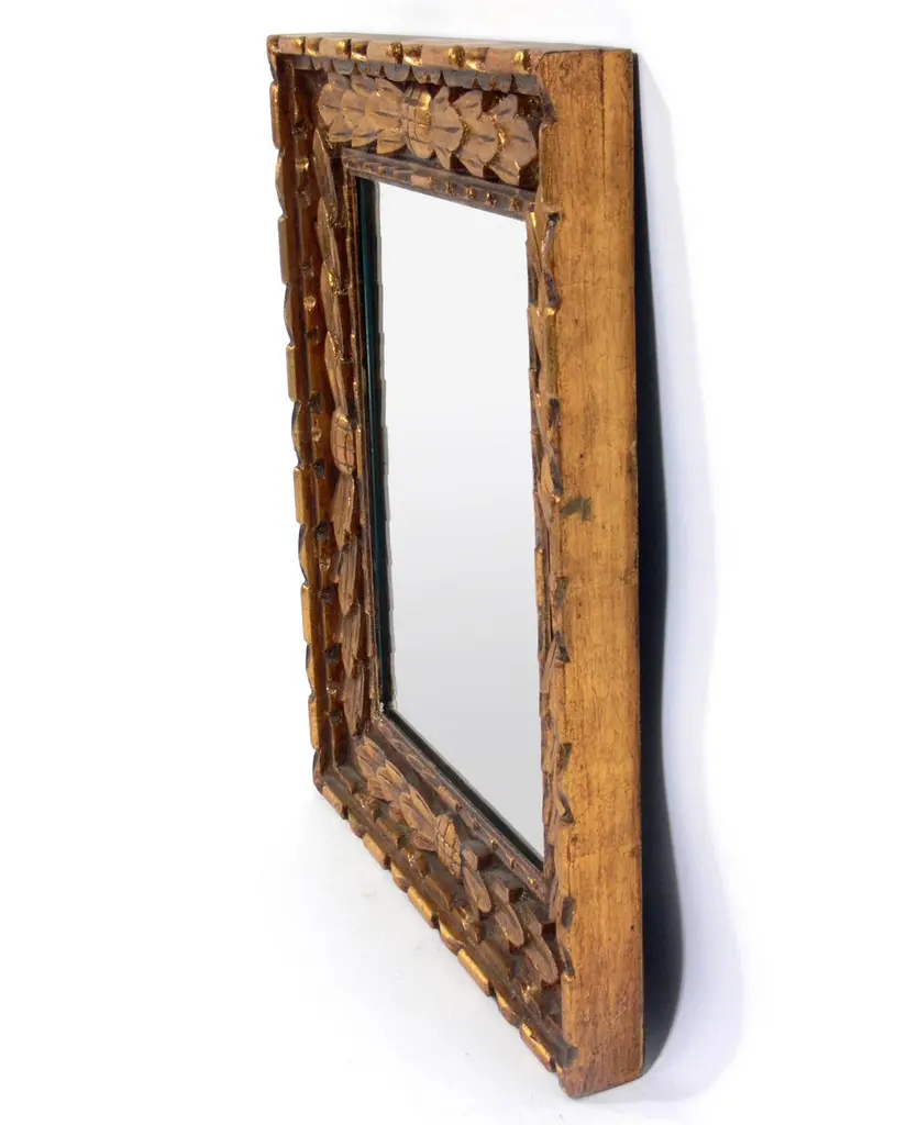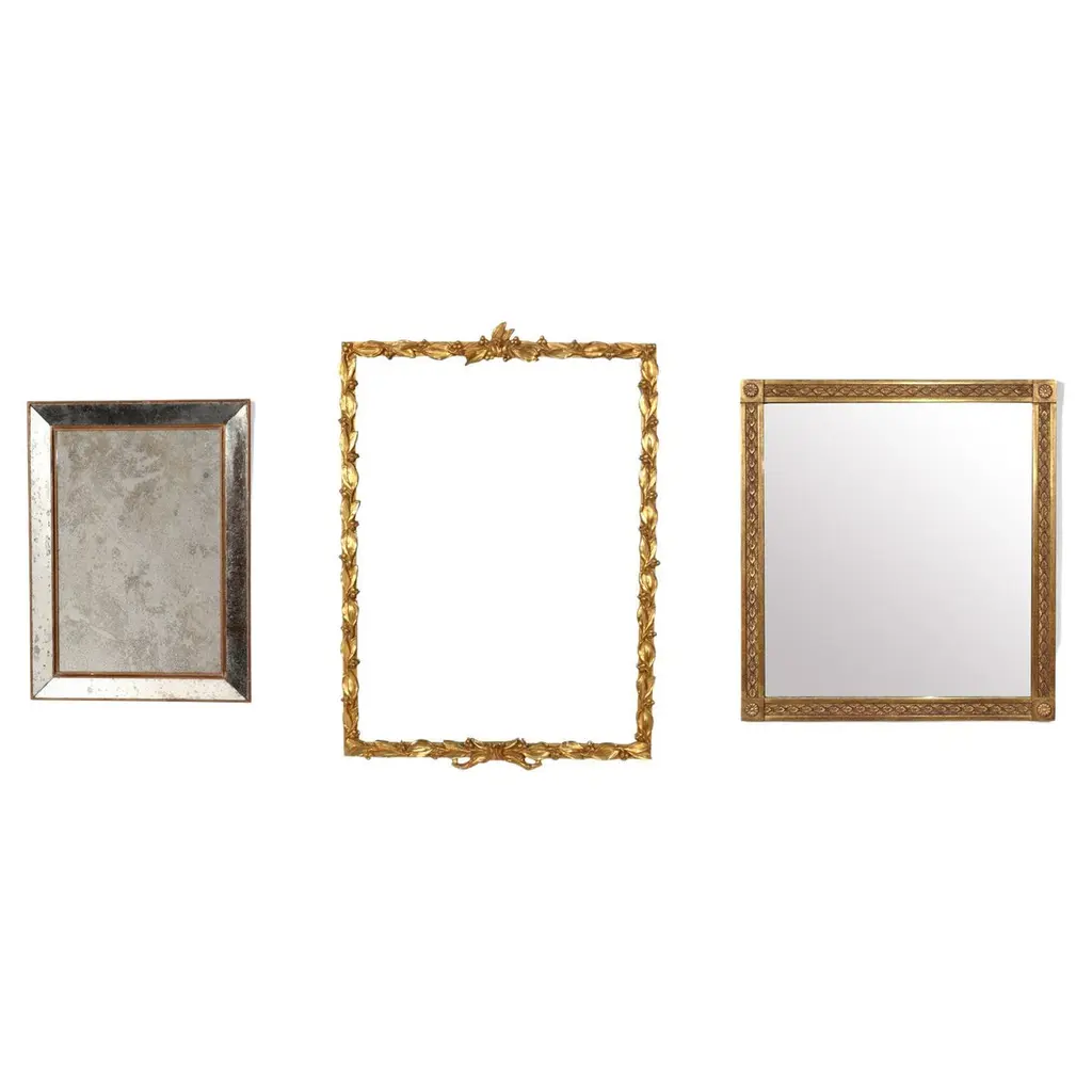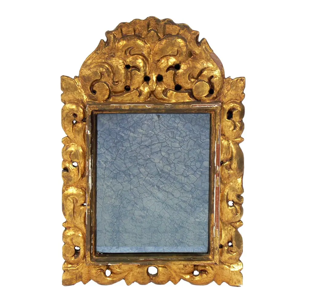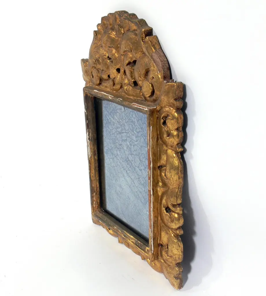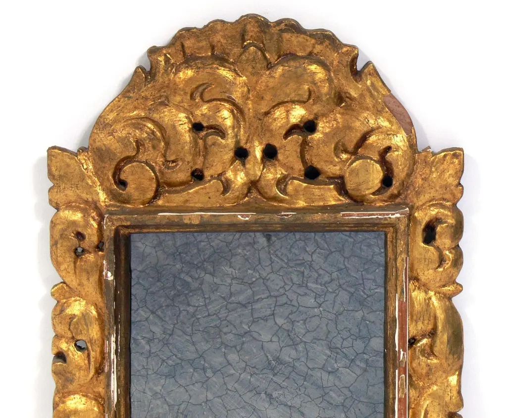 Selection of antiqued gilt mirrors #5, circa mid-20th century.They are:1) Spanish gilt mirror, circa 1940s. Retains original antiqued mirror. It is seen at the left in the first photo. It measures 17.5" H x 12"W x 1" D.2) Spanish gilt mirror, circa 1950s. Retains original mirror. It is seen at the centre in the first photo. It measures 22.5" H x 18.25" W x 2" D.3) Ornate gilt mirror, circa 1940s. It is seen at the right in the first photo. It measures 18" H x 10.5" W x 2" D.Various original distress and wear to wood frames. See detail photos.They are priced at $550 each.