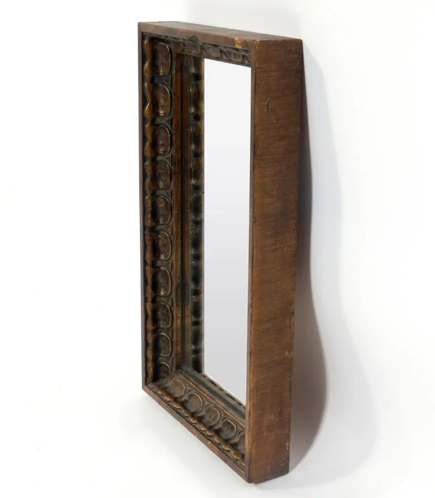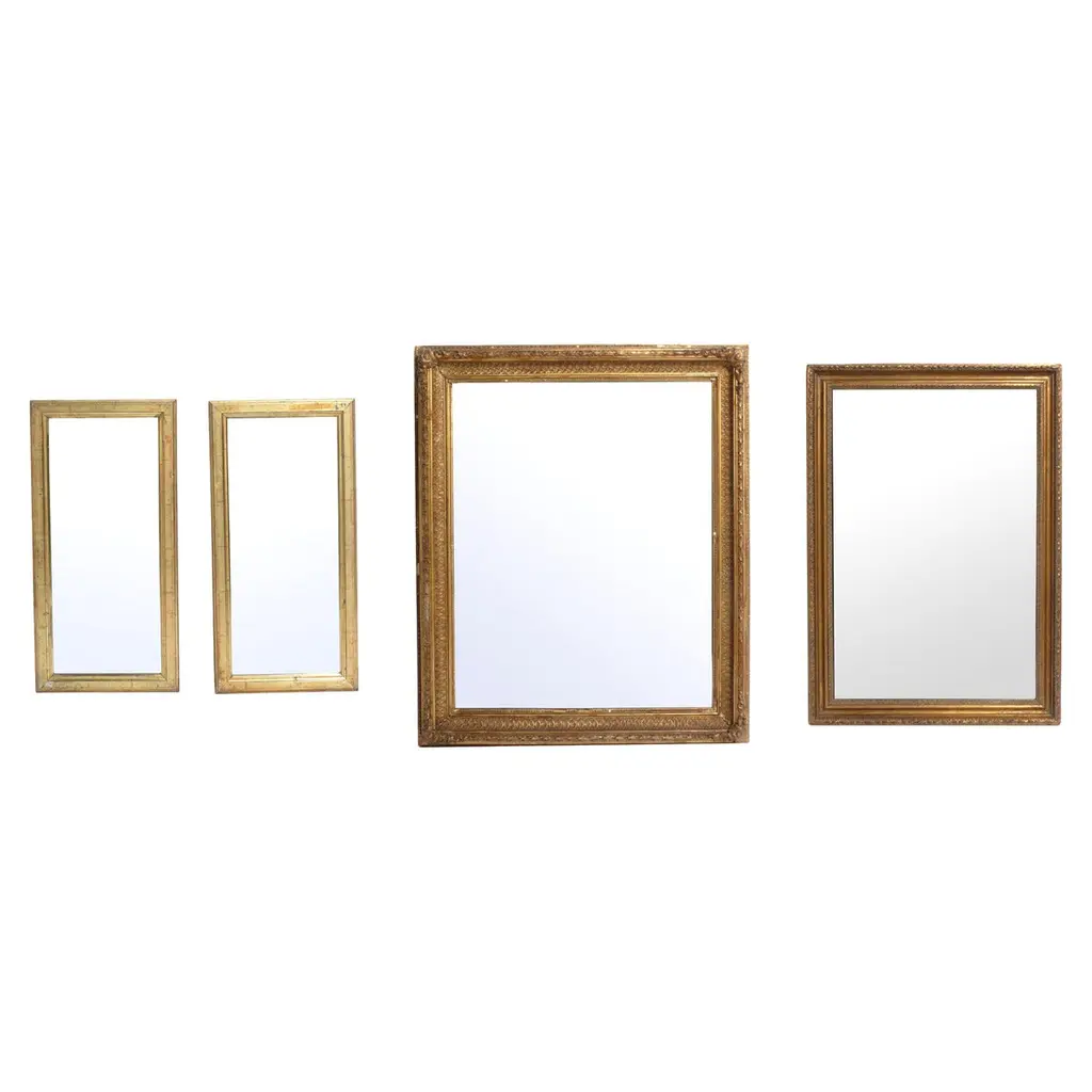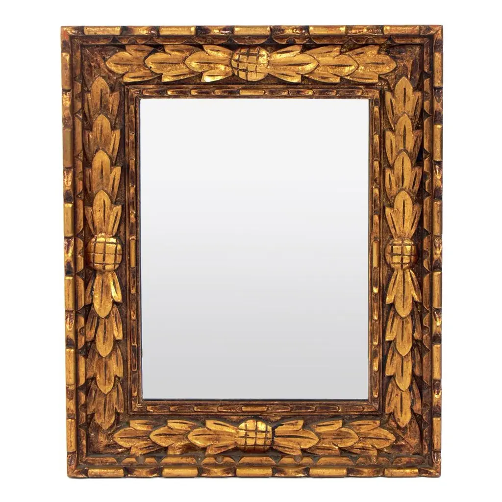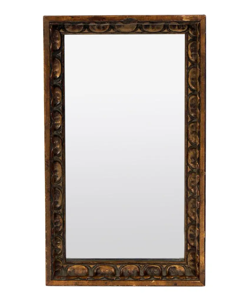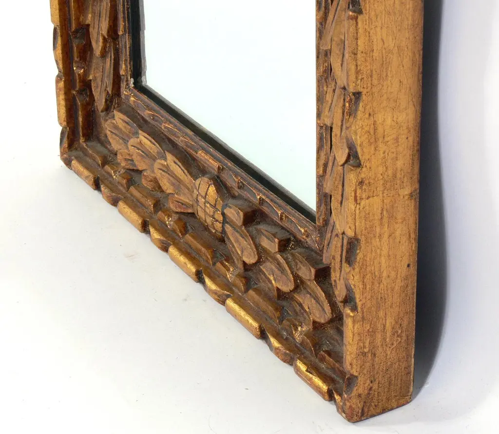 Selection of antiqued gilt mirrors #5, circa mid-20th century.They are:1) Spanish gilt mirror, circa 1940s. Retains original antiqued mirror. It is seen at the left in the first photo. It measures 17.5" H x 12"W x 1" D.2) Spanish gilt mirror, circa 1950s. Retains original mirror. It is seen at the centre in the first photo. It measures 22.5" H x 18.25" W x 2" D.3) Ornate gilt mirror, circa 1940s. It is seen at the right in the first photo. It measures 18" H x 10.5" W x 2" D.Various original distress and wear to wood frames. See detail photos.They are priced at $550 each.