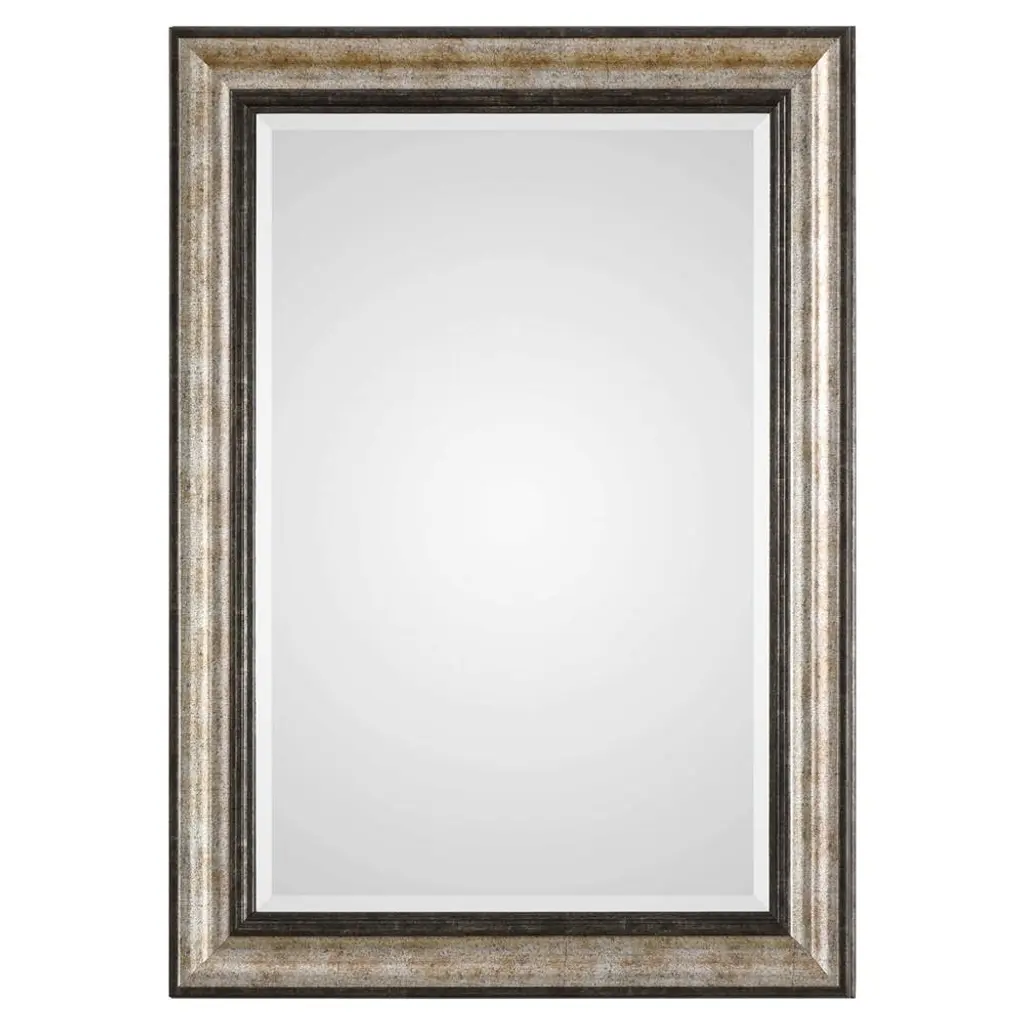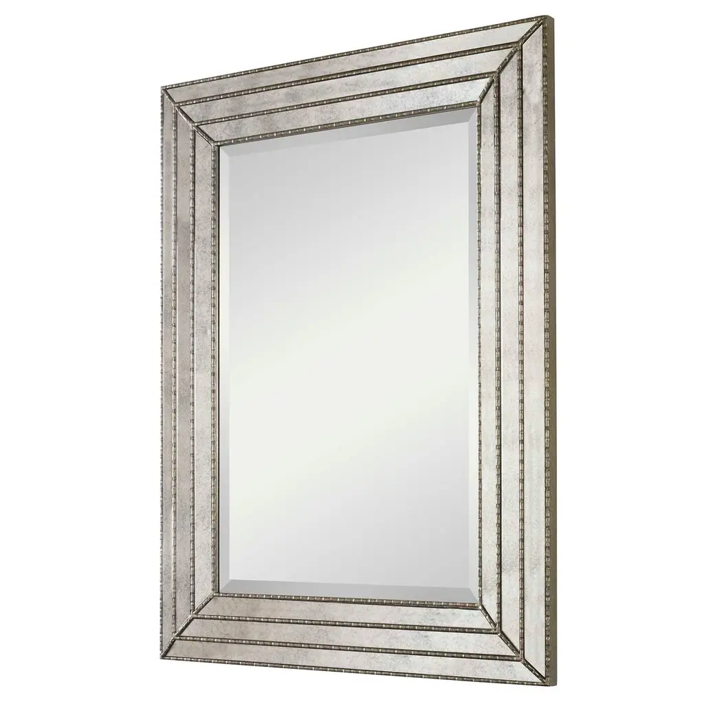 This mirror features a frame made of antiqued mirror inlays with burnished silver details. Center mirror features a generous 1 1/4" bevel. May be hung horizontal or vertical.
