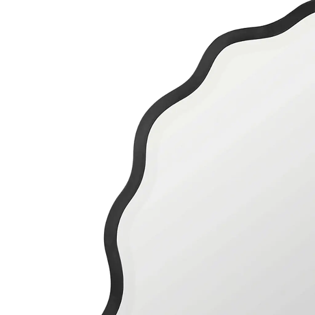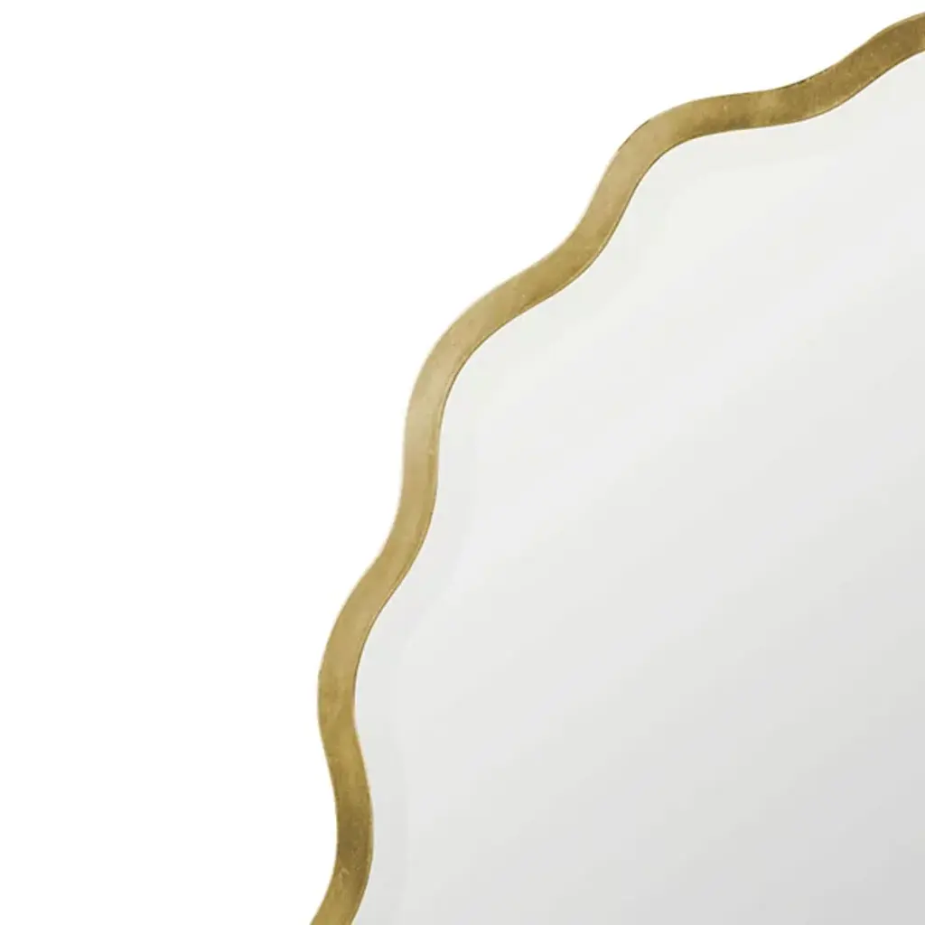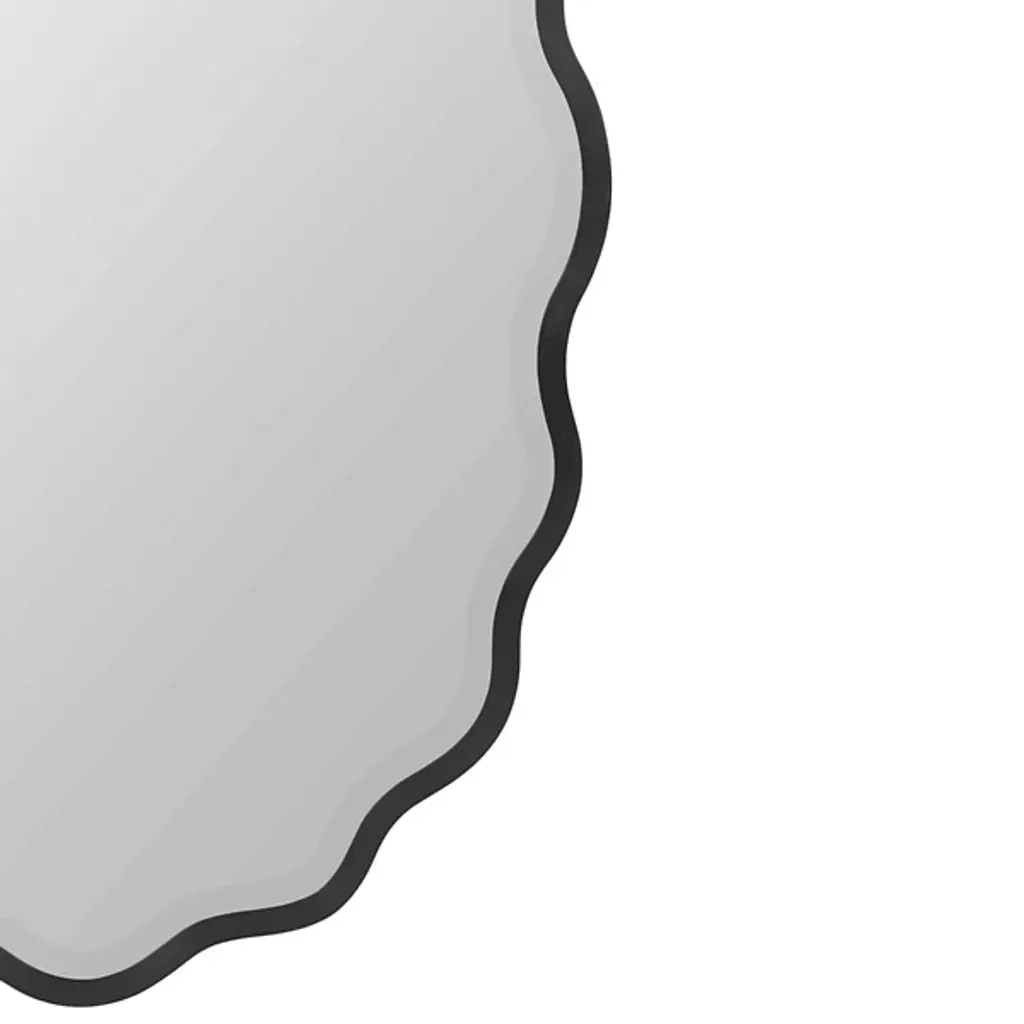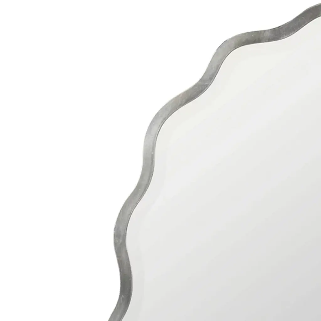 The Serafina Wall Mirror from Cooper Classics traces an undulating metal border around beveled glass. The frame's continuous motion creates twelve distinct curves, each flowing naturally into the next. This rhythmic pattern encircles the mirror without overpowering it. The metal construction allows for both vertical and horizontal placement, letting the waves change direction based on orientation.