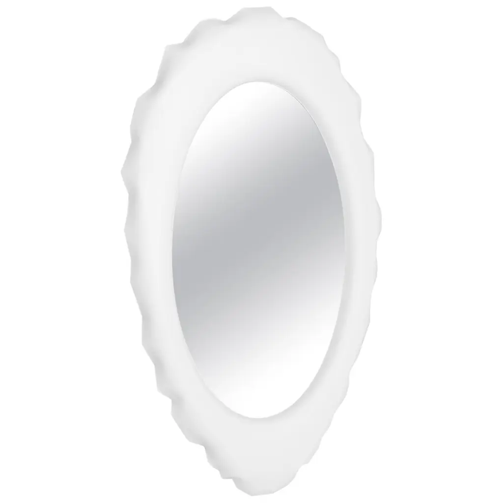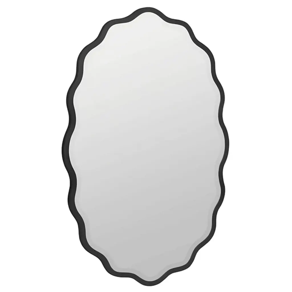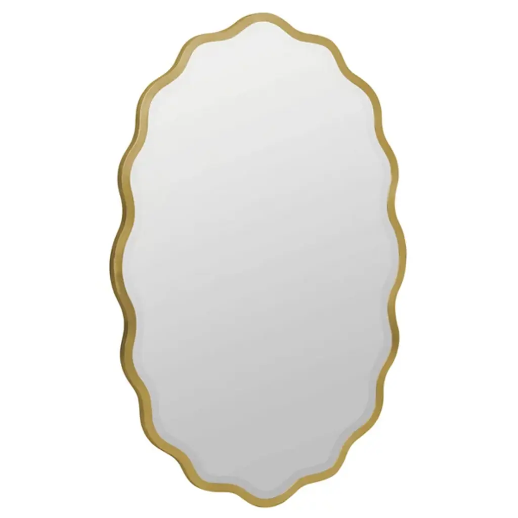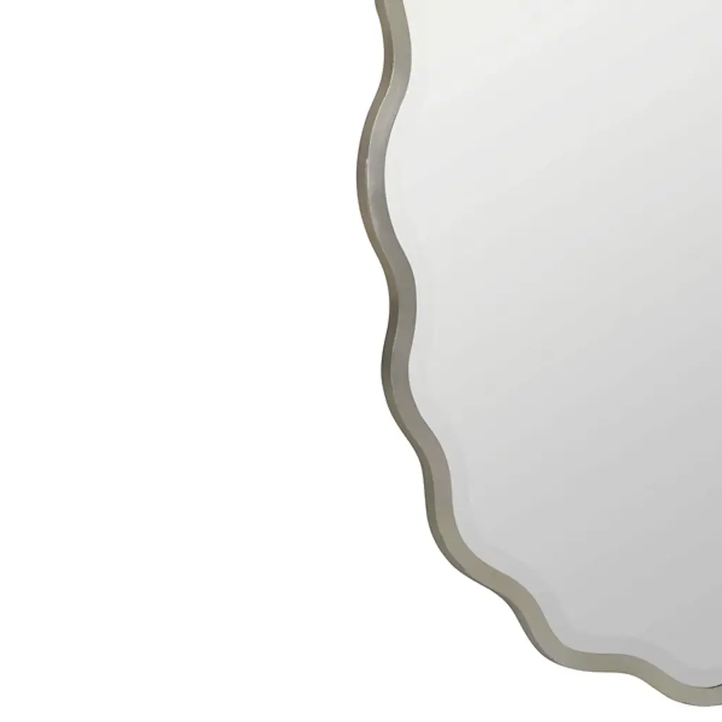 The Serafina Wall Mirror from Cooper Classics traces an undulating metal border around beveled glass. The frame's continuous motion creates twelve distinct curves, each flowing naturally into the next. This rhythmic pattern encircles the mirror without overpowering it. The metal construction allows for both vertical and horizontal placement, letting the waves change direction based on orientation.