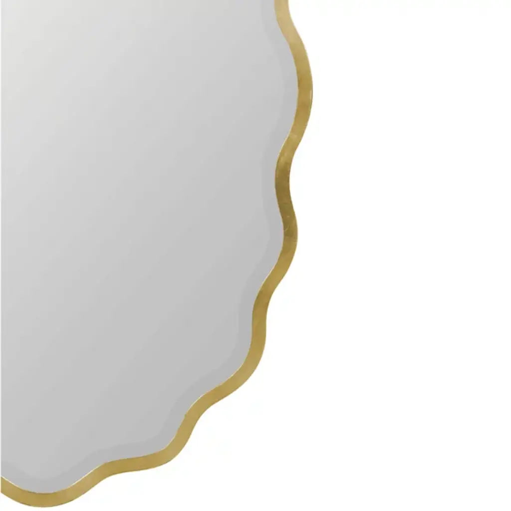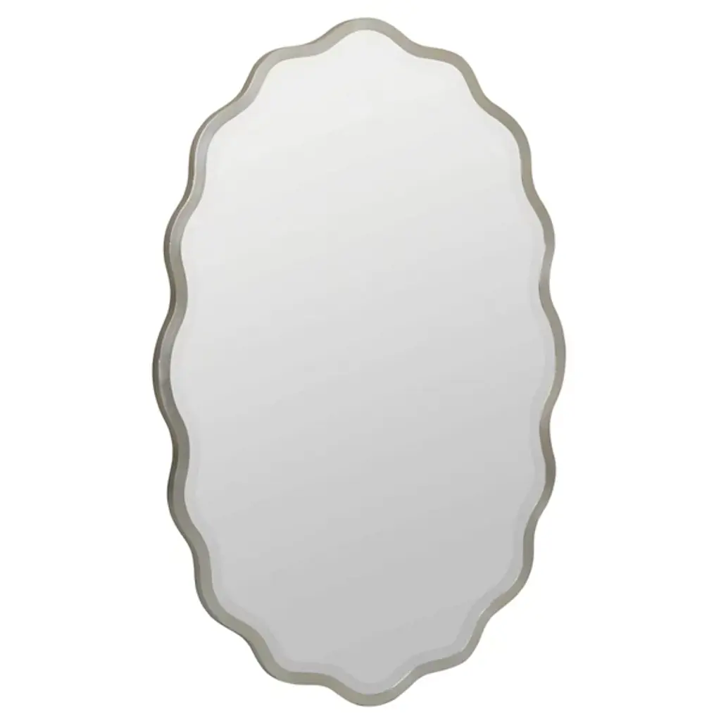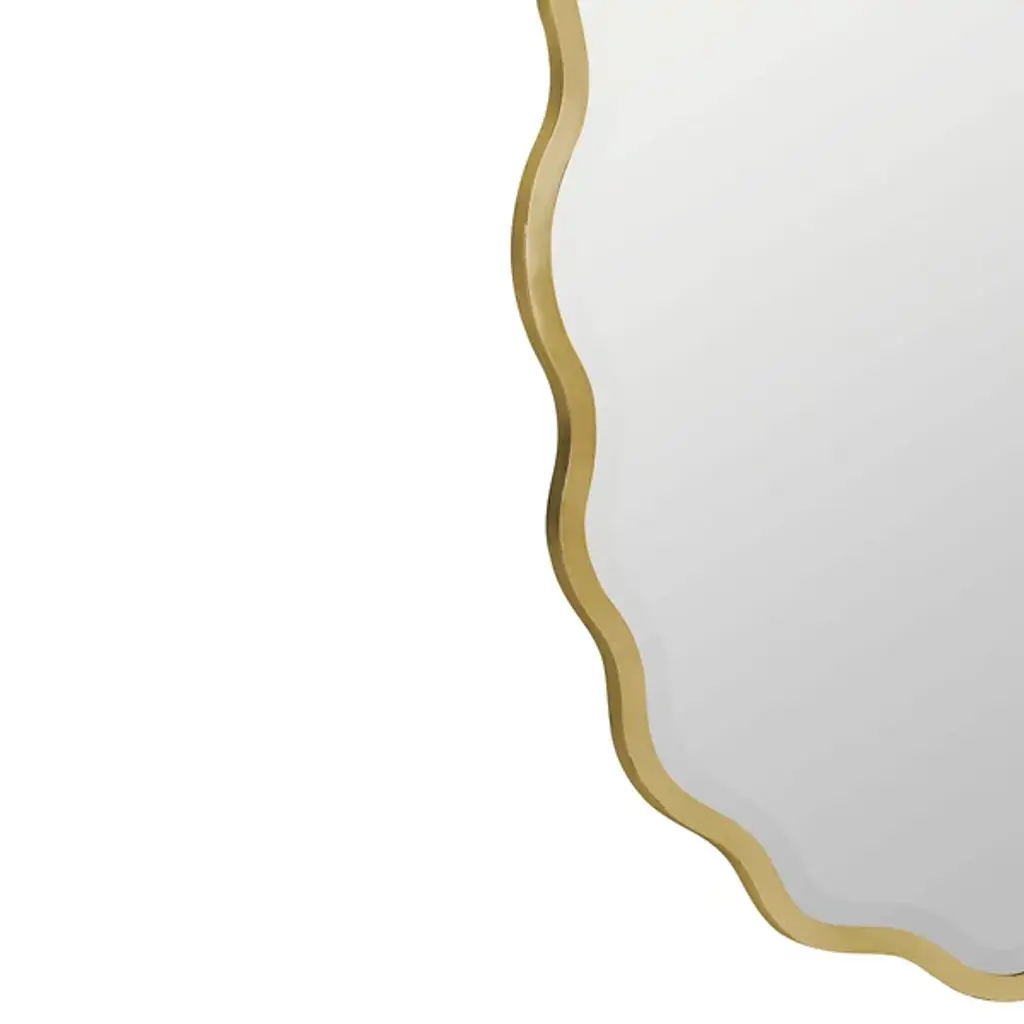 The Serafina Wall Mirror from Cooper Classics traces an undulating metal border around beveled glass. The frame's continuous motion creates twelve distinct curves, each flowing naturally into the next. This rhythmic pattern encircles the mirror without overpowering it. The metal construction allows for both vertical and horizontal placement, letting the waves change direction based on orientation.