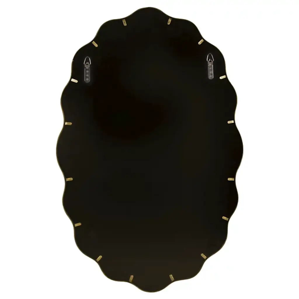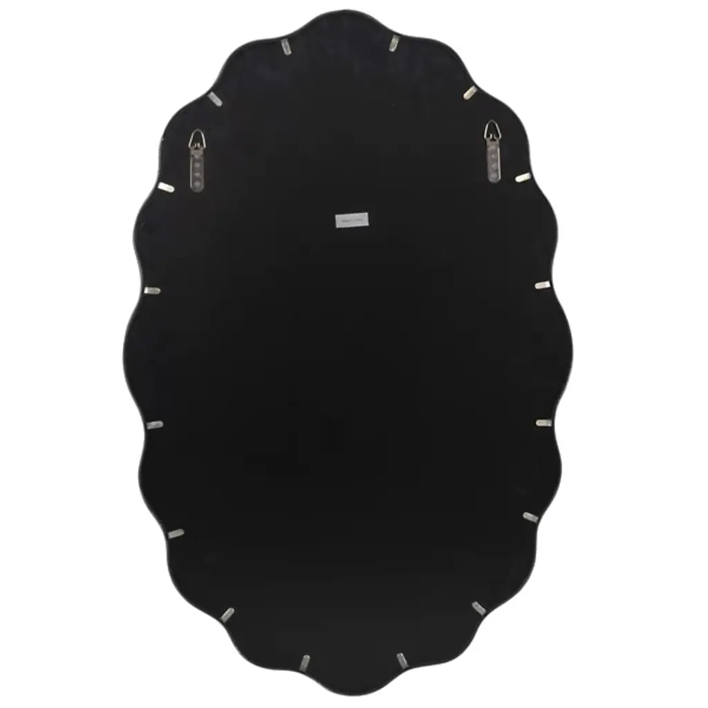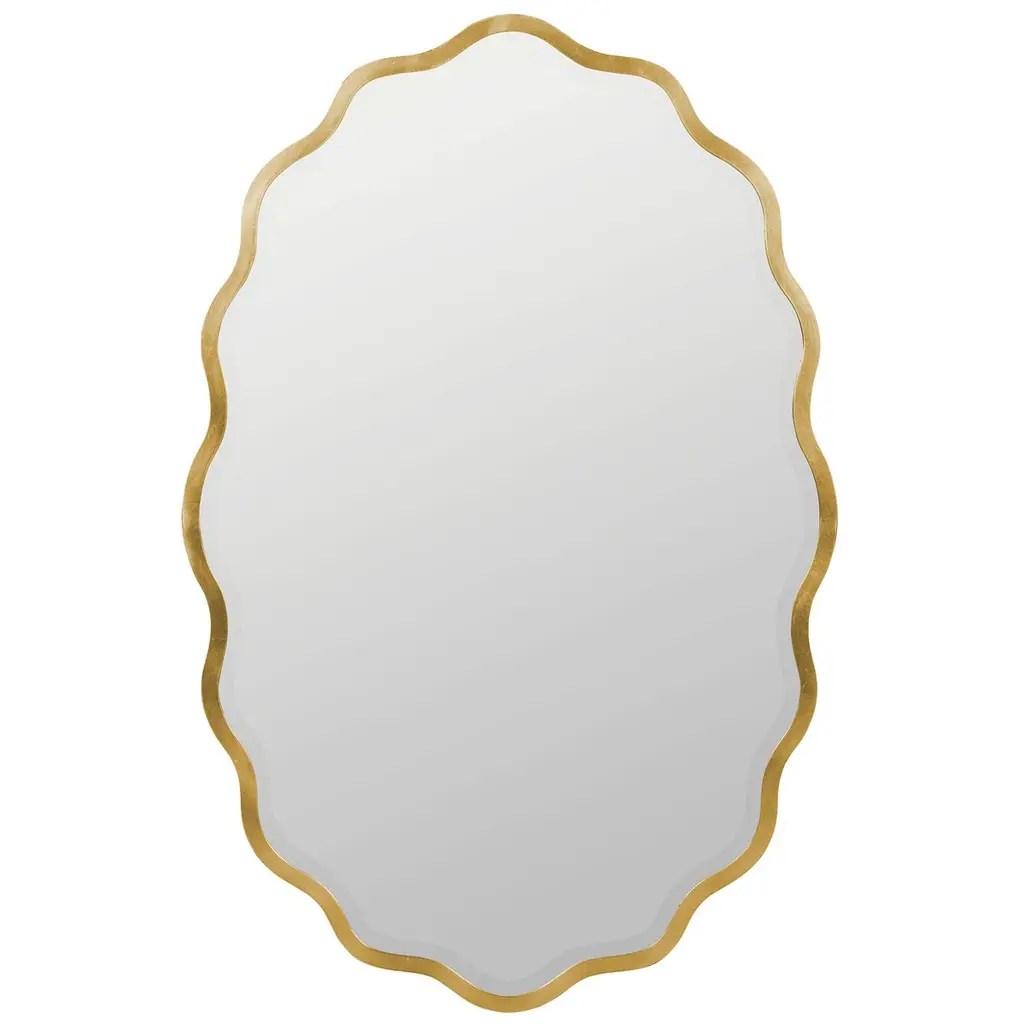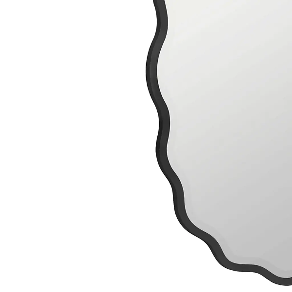 The Serafina Wall Mirror from Cooper Classics traces an undulating metal border around beveled glass. The frame's continuous motion creates twelve distinct curves, each flowing naturally into the next. This rhythmic pattern encircles the mirror without overpowering it. The metal construction allows for both vertical and horizontal placement, letting the waves change direction based on orientation.