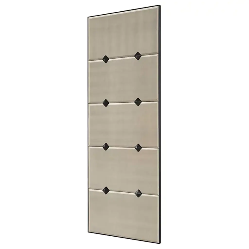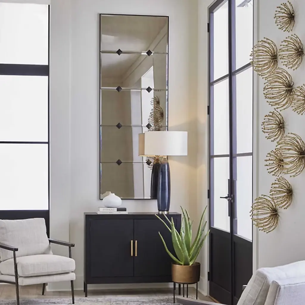 The Serchio Mirror from Uttermost brings dynamic elegance with its segmented antiqued mirror panels. The elongated design features a sleek iron frame adorned with metal studded medallions at each intersection. A petite beveled edge adds refinement, while the versatile mounting allows vertical or horizontal placement. Grace Feyock's vision incorporates traditional elements in a contemporary format. The MDF backing provides stable support for this statement piece that bridges classic and trendy aesthetics.