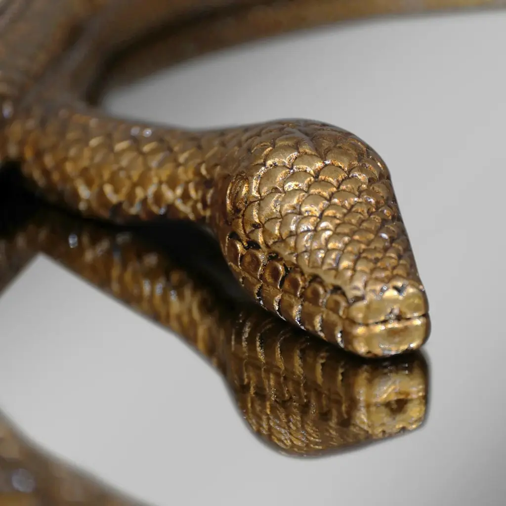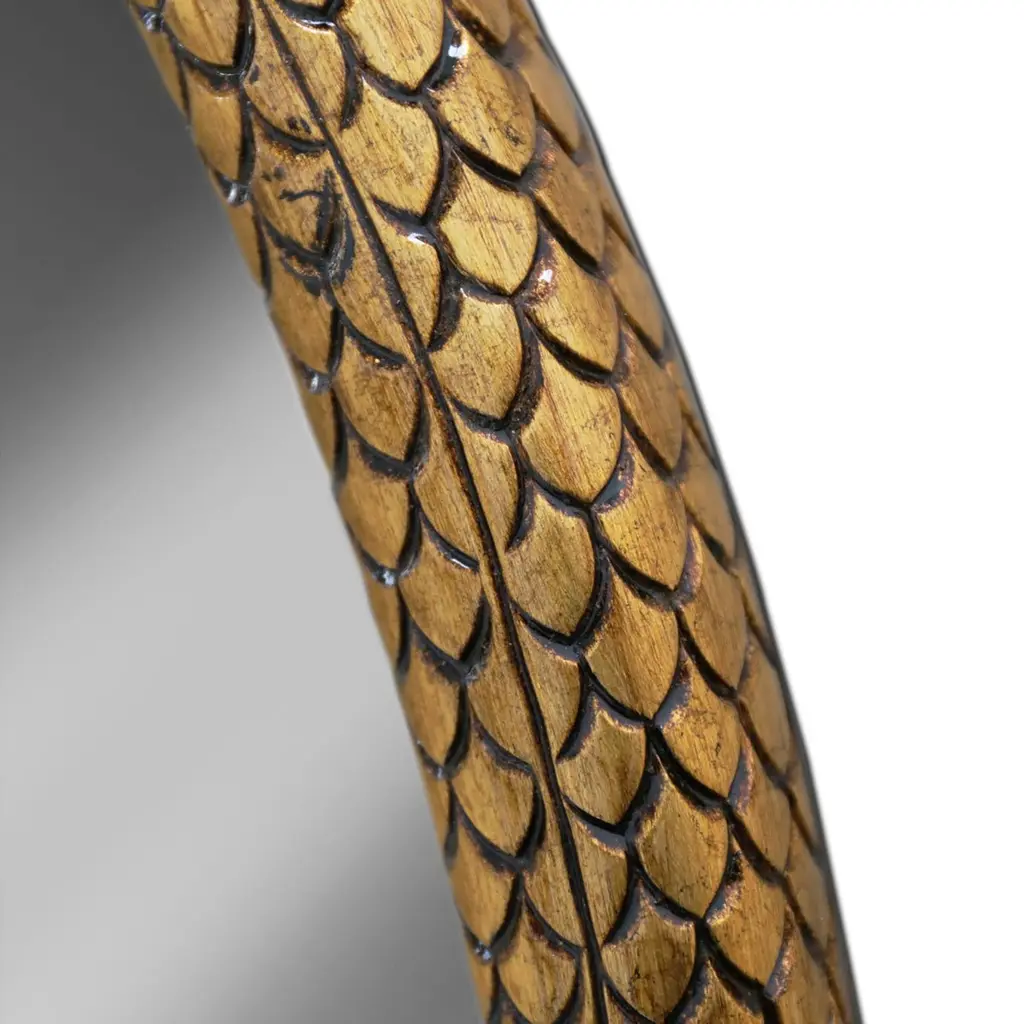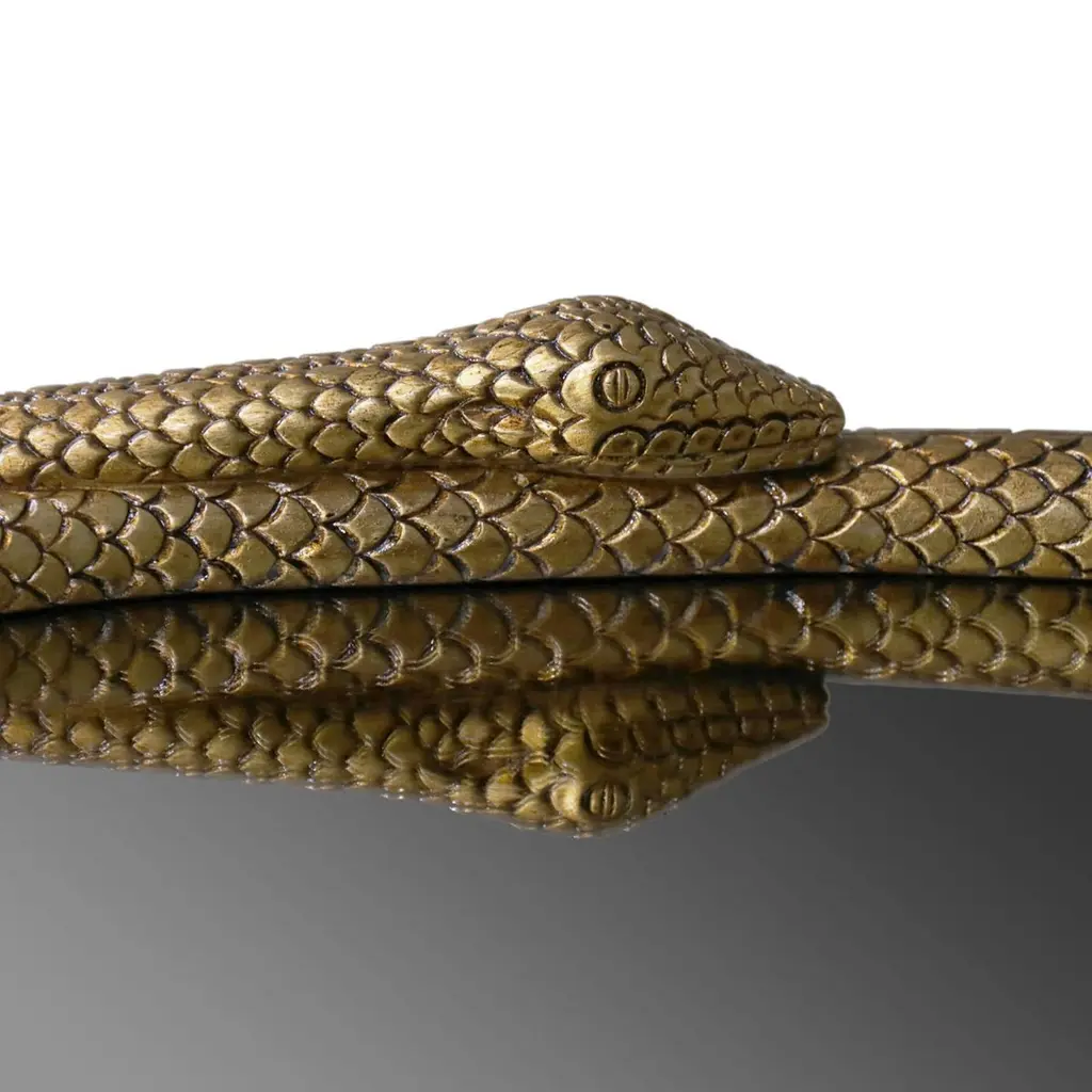 Be transformed as you gaze into the Serpentine II's apple-shaped mirror. Framed in two intertwined serpent forms made of hand-carved wood this mirror is the perfect way to add a touch of exoticism to any interior setting.Materials & Finishes: Structure: Broken Gold Leaf (High Gloss Finish)Mirror: Bronze Mirror (Plain Mirror)Back: Broken Gold Leaf (High Gloss Finish)Clean & Care: Maintain wood, lacquer and mother of pearl by not placing near heaters and air conditioning units to prevent over-drying or exposure to excessive moisture. Avoid extreme humidity changes in your home, as extremely dry air can cause wood to crack and lacquer to lift. Do not place/leave hot or moist objects directly on the wood. Rubber or plastic left on the wood finish can also damage the finish. Clean by using a dry or slightly damp soft cloth. Follow by polishing with a dry soft cloth. Do not use commercial, heavy-duty polishes or waxes, as they can yellow light finishes. We recommend that stained or soiled wood, lacquer or mother of pearl pieces be professionally cleaned or refinished.
