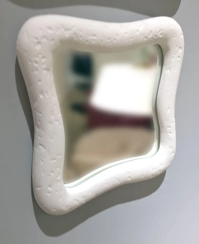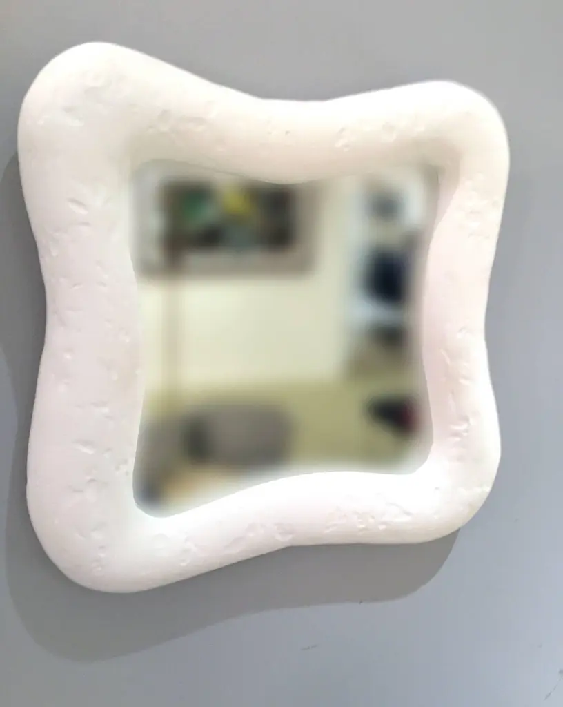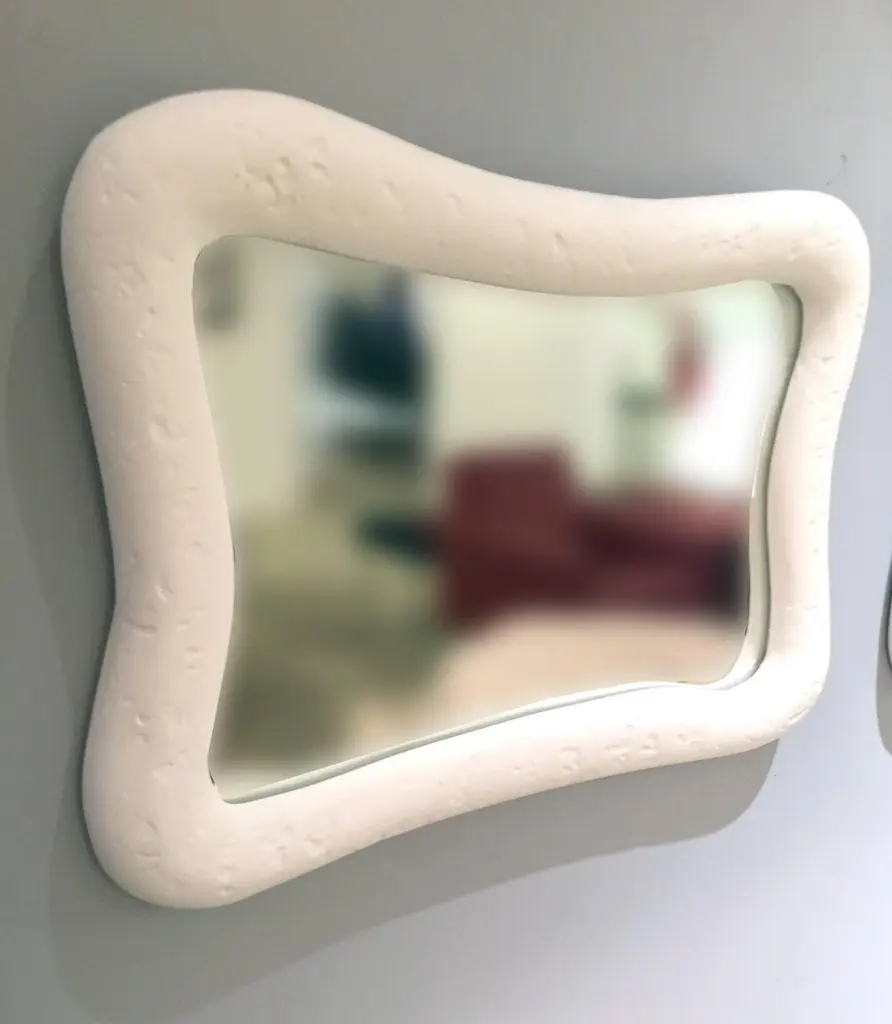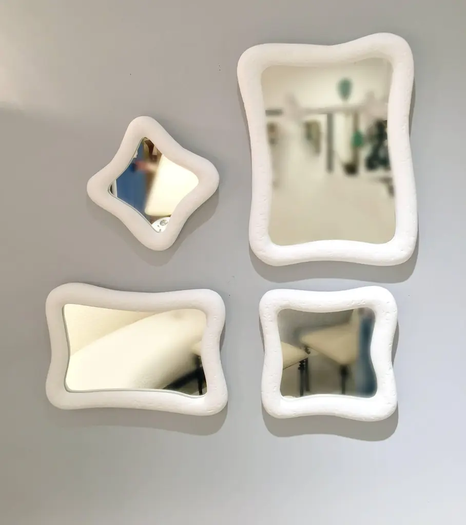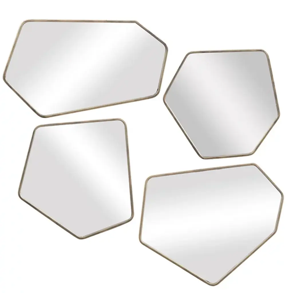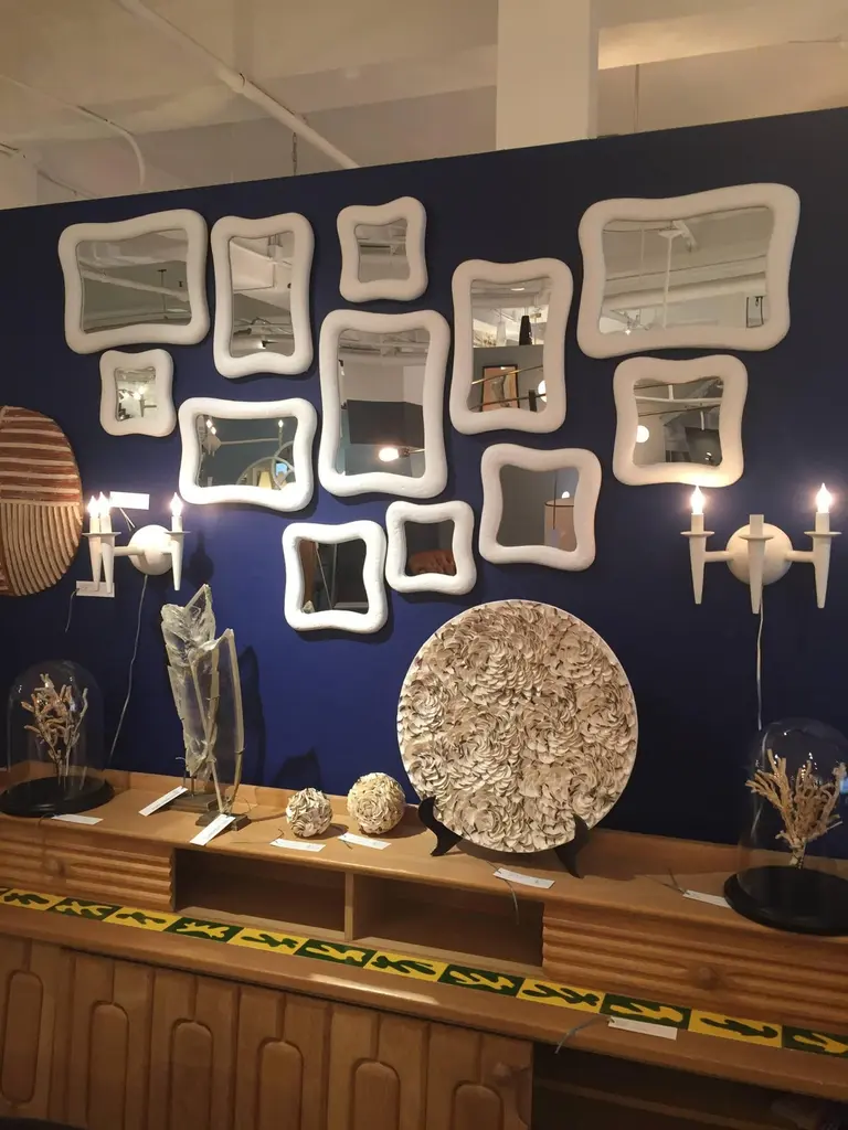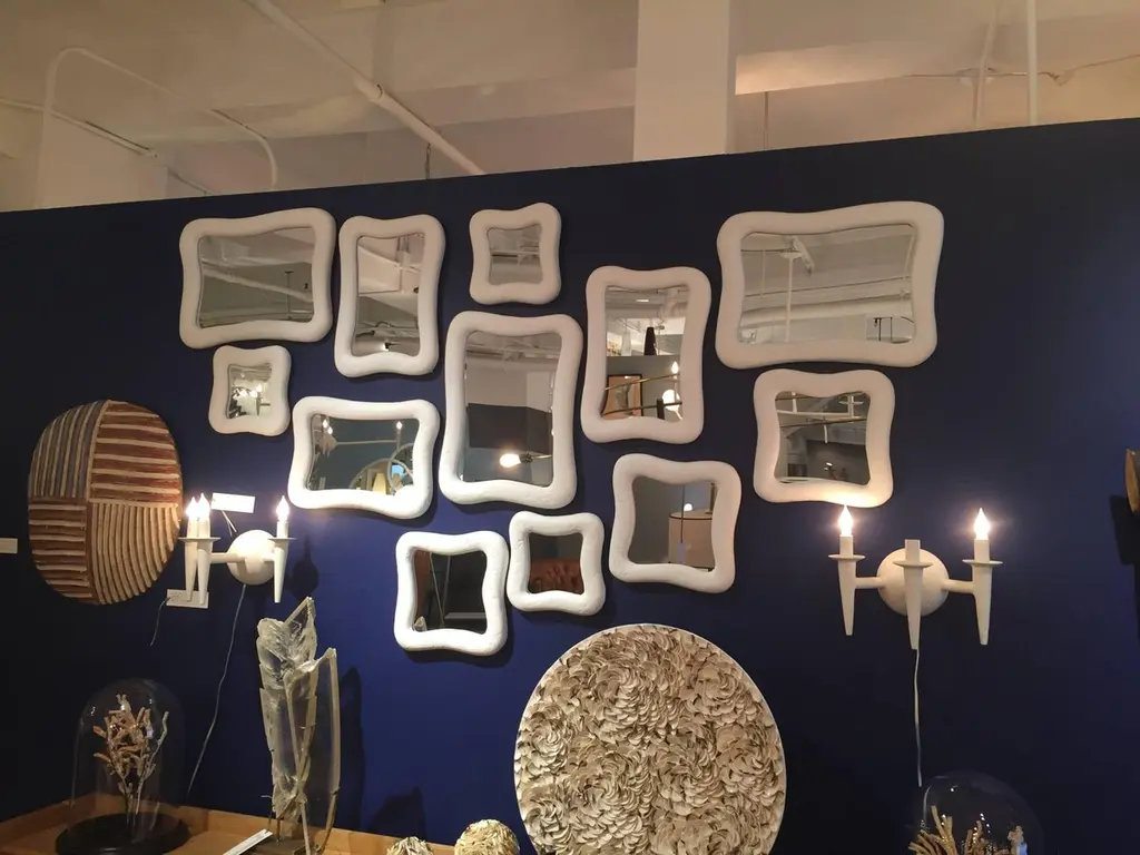 These 12 mirrors with their organic shapes are crafted with our signature plaster ofParis finish. The disposition of mirrors can be arranged in various configurations. Mirrordimensions three at 8" x 8", three at 9" x 9", three at 10" x 14" and three at 12" x 16".