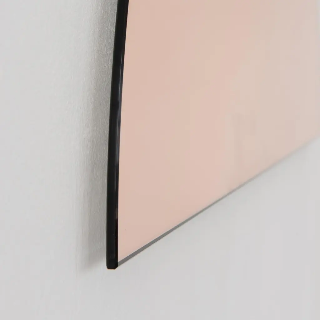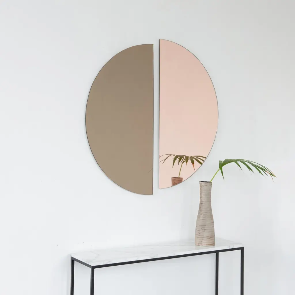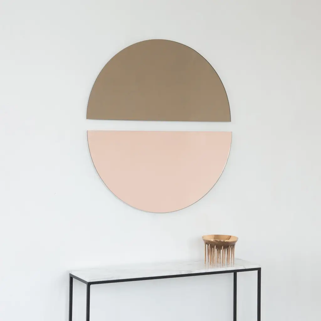Set of two minimalist half-moon Luna™ bronze + rose gold (peach) tinted frameless mirrors with a floating effect. Fitted with a quality hanging system for a flexible installation in 4 different directions. Designed and made in London, UK. Our mirrors are designed with an integrated French cleat (split batten) system that ensures the mirror is securely mounted flush with the wall. An alternative hanging hook or a Z-bar (depending on the size of the mirror) is available on demand for mirrors that need to be installed allowing some separation from the wall.Available in the following sizes (each piece):Regular: 50cm x 25cm / 19.7'' x 9.8''Medium: 60cm x 30cm / 23.6" x 11.8''Large: 80cm x 40cm / 31.5" x 15.7''Extra Large: 100cm x 50cm / 39.4" x 19.7''Mirror thickness: 6mm / 0.24" Overall mirror depth: 15mm / 0.59"or any bespoke dimensions.This mirror is fully customisable.Available options:- mirror tint: silver, bronze, black, rose gold / peach, blue or green- bevelling- back-illumination creating a halo effect- framed with various finishes: brass (brushed, polished or with a bronze patina), copper, stainless steel, blackened stainless steel, or in a variety of colours- frame depth: 18mm / 0.71’’, 24mm / 0.94’’ and 30mm / 1.18’’- front illumination for framed mirrors onlyPlease contact us for a quote for any bespoke specification or added options.All our mirrors are made on demand. Fabrication lead time for this particular mirror is approximately 3 weeks. Shipped safely and insured worldwide. Our mirrors are always shipped by courier express. Shipping via courier express typically requires 1 to 2 days to the UK, or 2 to 7 days outside the UK depending on the destination.All 4 directions the mirror may be installed in are illustrated in the photographs in this mirror entry. This mirror cannot be hung diagonally.ORDERS OF MULTIPLE MIRRORS OF THE SAME TYPE: Please contact us to receive a Packing and Shipping quote when ordering multiple mirrors of the same type. An order for multiple mirrors of the same type may not be accepted without extra packing and shipping fees. Thank you.
