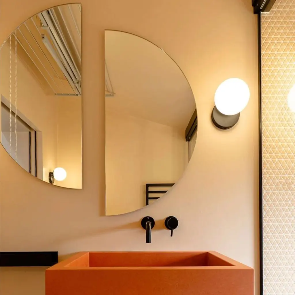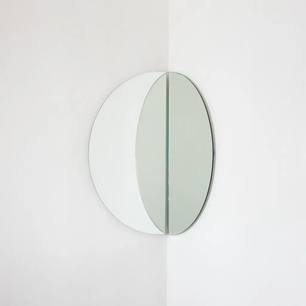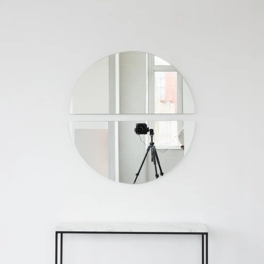 Set of two charming and minimalist Luna™ half-moon frameless mirrors with a floating effect. Fitted with a quality hanging system for a flexible installation in 4 different positions. Designed and made in London, UK.Our mirrors are designed with an integrated French cleat (split batten) system that ensures the mirror is securely mounted flush with the wall. An alternative hanging hook or a Z-bar (depending on the size of the mirror) is available on demand for mirrors that need to be installed allowing some separation from the wall.Available in the following sizes (each piece):Regular: 50cm x 25cm / 19.7'' x 9.8''Medium: 60cm x 30cm / 23.6" x 11.8''Large: 80cm x 40cm / 31.5" x 15.7''Extra Large: 100cm x 50cm / 39.4" x 19.7''Mirror thickness: 6mm / 0.24" Overall mirror depth: 15mm / 0.59"or any bespoke dimensions.This mirror is fully customisable.Available options:- mirror tint: silver, bronze, black, rose gold / peach, blue or green- bevelling- back-illumination creating a halo effect- framed with various finishes: brass (brushed, polished or with a bronze patina), copper, stainless steel, blackened stainless steel, or in a variety of colours- frame depth: 18mm / 0.71’’, 24mm / 0.94’’ and 30mm / 1.18’’- front illumination for framed mirrors onlyPlease contact us for a quote for any bespoke specification or added options.All our mirrors are made on demand. Fabrication lead time for this particular mirror is approximately 3 weeks. Shipped safely and insured worldwide. Our mirrors are always shipped by courier express. Shipping via courier express typically requires 1 to 2 days to the UK, or 2 to 7 days outside the UK depending on the destination.All 4 directions the mirror may be installed in are illustrated in the photographs in this mirror entry. This mirror cannot be hung diagonally.ORDERS OF MULTIPLE MIRRORS OF THE SAME TYPE: Please contact us to receive a Packing and Shipping quote when ordering multiple mirrors of the same type. An order for multiple mirrors of the same type may not be accepted without extra packing and shipping fees. Thank you.Location picture: bespoke Luna™ mirror for Feioi Interiors