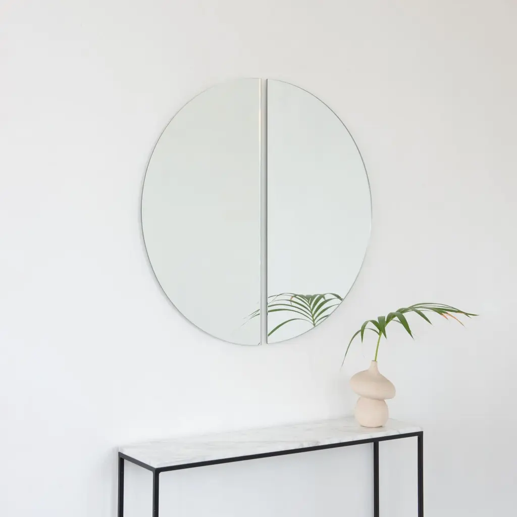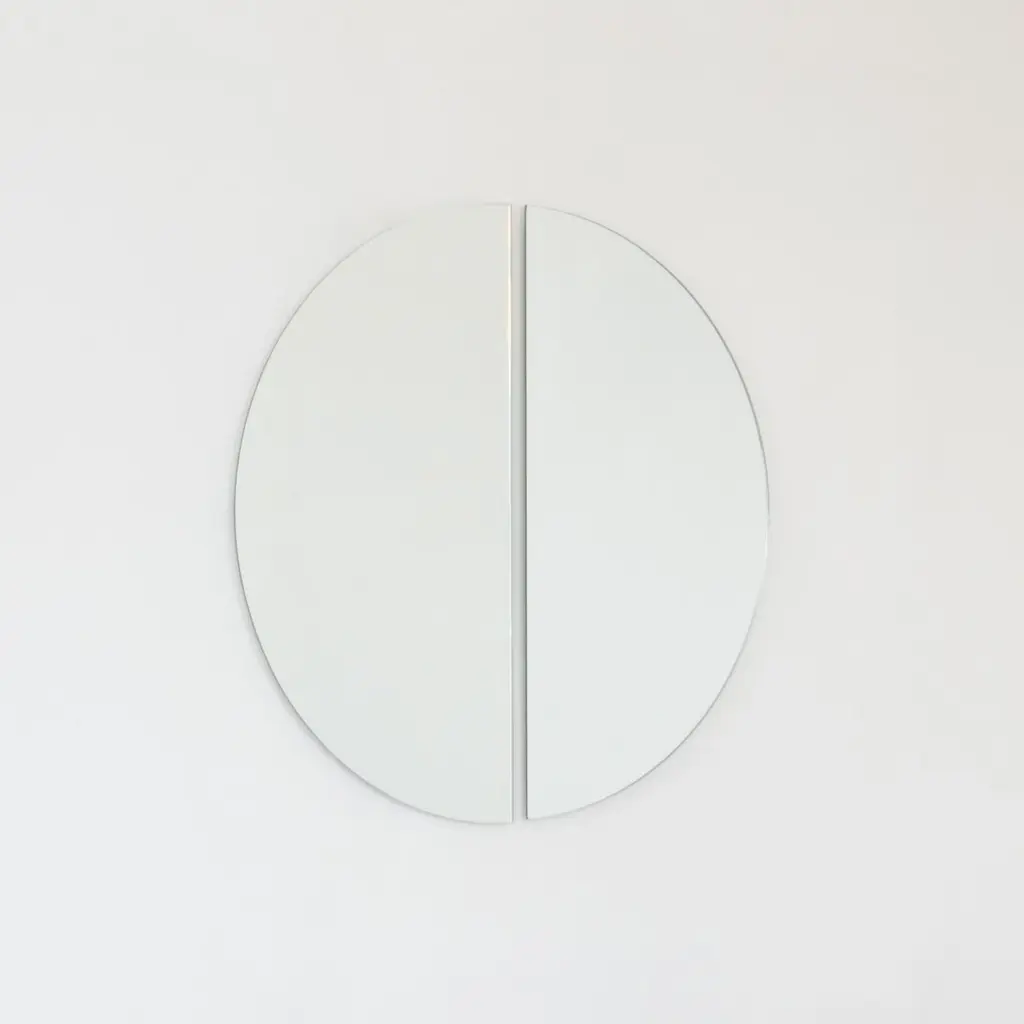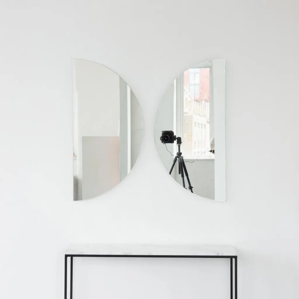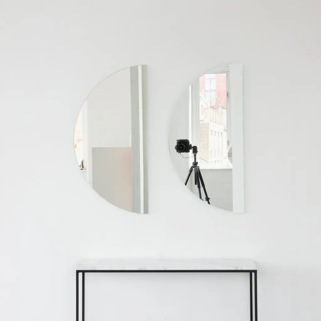 Set of two charming and minimalist Luna™ half-moon frameless mirrors with a floating effect. Fitted with a quality hanging system that allows for a flexible installation in 4 different directions. Designed and made in London, UK.Our mirrors are designed with an integrated French cleat (split batten) system that ensures the mirror is securely mounted flush with the wall. An alternative hanging hook or a Z-bar (depending on the size of the mirror) is available on demand for mirrors that need to be installed allowing some separation from the wall.Available in the following sizes (each piece):Regular: 50cm x 25cm / 19.7'' x 9.8''Medium: 60cm x 30cm / 23.6" x 11.8''Large: 80cm x 40cm / 31.5" x 15.7''Extra Large: 100cm x 50cm / 39.4" x 19.7''Mirror thickness: 6mm / 0.24" Overall mirror depth: 15mm / 0.59"or any bespoke dimensions.This mirror is fully customisable.Available options:- mirror tint: silver, bronze, black, rose gold / peach, blue or green- bevelling- back-illumination creating a halo effect- framed with various finishes: brass (brushed, polished or with a bronze patina), copper, stainless steel, blackened stainless steel, or in a variety of colours- frame depth: 18mm / 0.71’’, 24mm / 0.94’’ and 30mm / 1.18’’- front illumination for framed mirrors onlyPlease contact us for a quote for any bespoke specification or added options.All our mirrors are made on demand. Fabrication lead time for this particular mirror is approximately 3 weeks. Shipped safely and insured worldwide. Our mirrors are always shipped by courier express. Shipping via courier express typically requires 1 to 2 days to the UK, or 2 to 7 days outside the UK depending on the destination.All 4 directions the mirror may be installed in are illustrated in the photographs in this mirror entry. This mirror cannot be hung diagonally.ORDERS OF MULTIPLE MIRRORS OF THE SAME TYPE: Please contact us to receive a Packing and Shipping quote when ordering multiple mirrors of the same type. An order for multiple mirrors of the same type may not be accepted without extra packing and shipping fees. Thank you.
