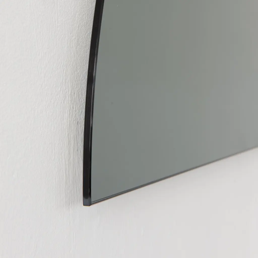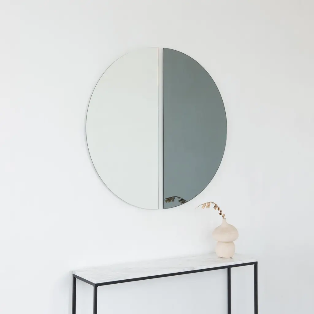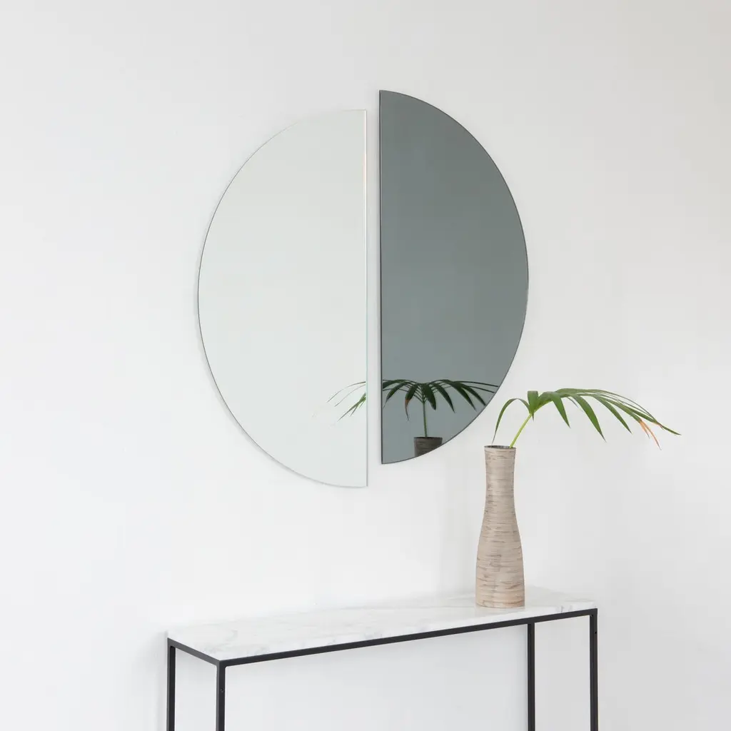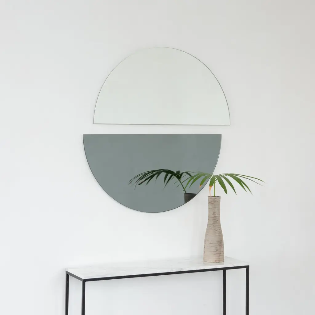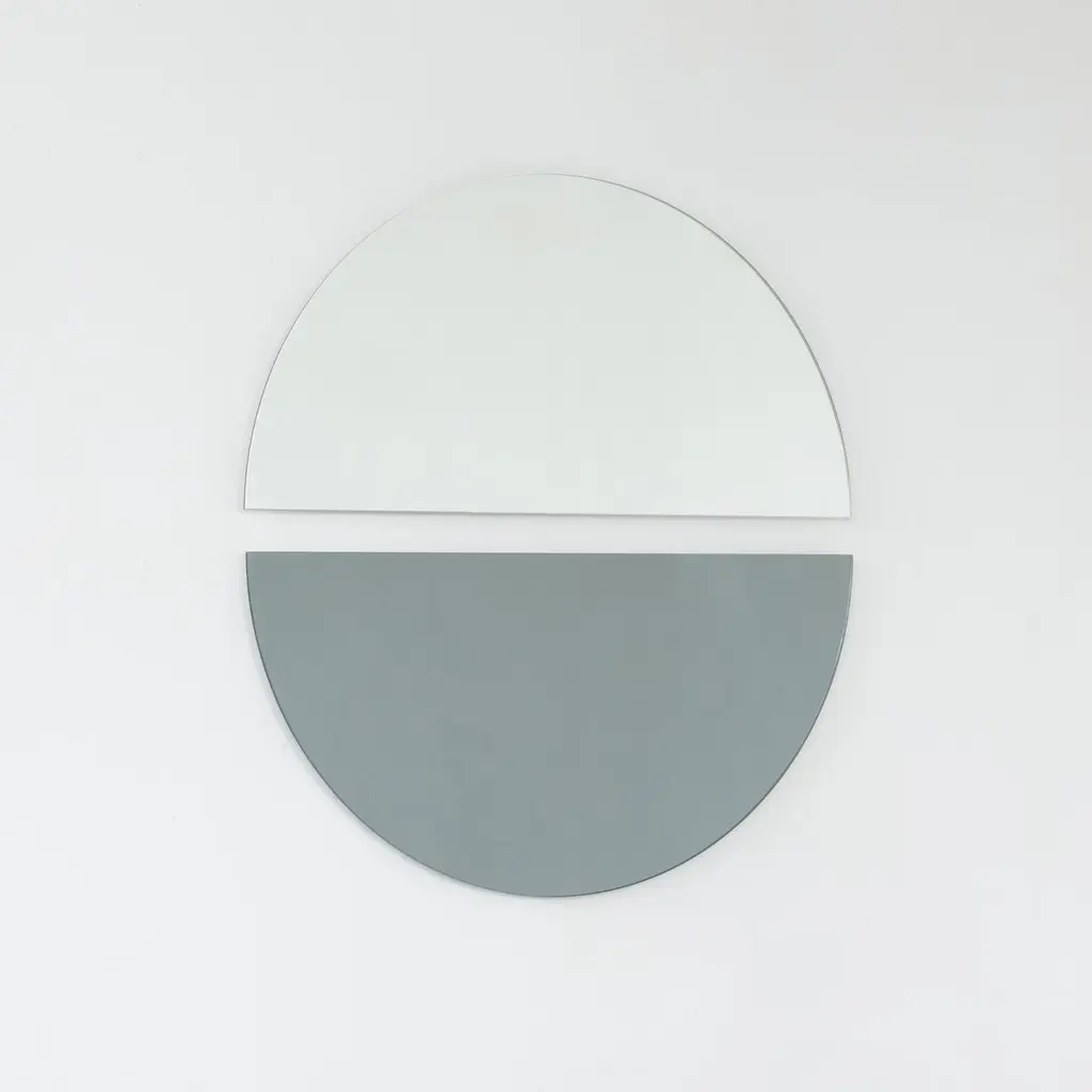 Set of two minimalist half-moon Luna™ standard silver + black tinted frameless mirrors with a floating effect. Fitted with a quality and ingenious hanging system for a flexible installation in 4 different directions. Designed and made in London, UK. The backing has a brand new design that sets it apart from other frameless mirrors. The quality moisture resistant panel is crafted with a professional French Cleat system that ensures the mirror always hangs safely and perfectly parallel to the wall. It also makes the installation very easy. The mirror itself is lined at the back with a quality protective film.Available in the following sizes (each piece):Regular: 50cm x 25cm / 19.7'' x 9.8''Medium: 60cm x 30cm / 23.6" x 11.8''Large: 80cm x 40cm / 31.5" x 15.7''Extra Large: 100cm x 50cm / 39.4" x 19.7''Mirror thickness: 6mm / 0.24" Overall mirror depth: 15mm / 0.59"or any bespoke dimensions.This mirror is fully customisable.Available options:- mirror tint: silver, bronze, black, rose gold / peach, blue or green- bevelling- back-illumination creating a halo effect- framed with various finishes: brass (brushed, polished or with a bronze patina), copper, stainless steel, blackened stainless steel, or in a variety of colours- frame depth: 18mm / 0.71’’, 24mm / 0.94’’ and 30mm / 1.18’’- front illumination for framed mirrors onlyPlease contact us for a quote for any bespoke specification or added options.All our mirrors are made on demand. Fabrication lead time for this particular mirror is approximately 3 weeks. Shipped safely and insured worldwide. Our mirrors are always shipped by courier express. Shipping via courier express typically requires 1 to 2 days to the UK, or 2 to 7 days outside the UK depending on the destination.All 4 directions the mirror may be installed in are illustrated in the photographs in this mirror entry. This mirror cannot be hung diagonally.ORDERS OF MULTIPLE MIRRORS OF THE SAME TYPE: Please contact us to receive a Packing and Shipping quote when ordering multiple mirrors of the same type. An order for multiple mirrors of the same type may not be accepted without extra packing and shipping fees. Thank you.