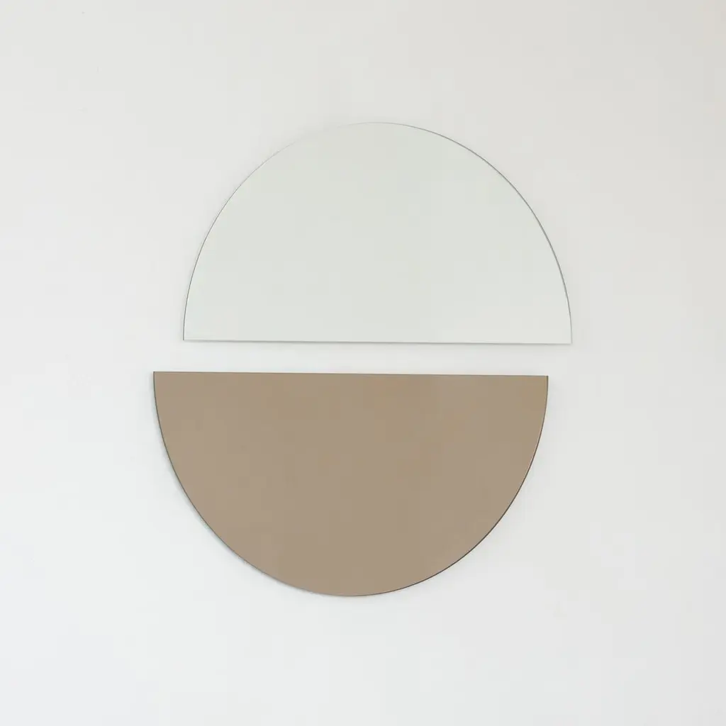 Set of two minimalist half-moon Luna™ standard silver + bronze tinted frameless mirrors with a floating effect. Fitted with a quality hanging system for a flexible installation in 4 different directions. Designed and made in London, UK. Our mirrors are designed with an integrated French cleat (split batten) system that ensures the mirror is securely mounted flush with the wall. An alternative hanging hook or a Z-bar (depending on the size of the mirror) is available on demand for mirrors that need to be installed allowing some separation from the wall.Available in the following sizes (each piece):Regular: 50cm x 25cm / 19.7'' x 9.8''Medium: 60cm x 30cm / 23.6" x 11.8''Large: 80cm x 40cm / 31.5" x 15.7''Extra Large: 100cm x 50cm / 39.4" x 19.7''Mirror thickness: 6mm / 0.24" Overall mirror depth: 15mm / 0.59"or any bespoke dimensions.This mirror is fully customisable.Available options:- mirror tint: silver, bronze, black, rose gold / peach, blue or green- bevelling- back-illumination creating a halo effect- framed with various finishes: brass (brushed, polished or with a bronze patina), copper, stainless steel, blackened stainless steel, or in a variety of colours- frame depth: 18mm / 0.71’’, 24mm / 0.94’’ and 30mm / 1.18’’- front illumination for framed mirrors onlyPlease contact us for a quote for any bespoke specification or added options.All our mirrors are made on demand. Fabrication lead time for this particular mirror is approximately 3 weeks. Shipped safely and insured worldwide. Our mirrors are always shipped by courier express. Shipping via courier express typically requires 1 to 2 days to the UK, or 2 to 7 days outside the UK depending on the destination.All 4 directions the mirror may be installed in are illustrated in the photographs in this mirror entry. This mirror cannot be hung diagonally.ORDERS OF MULTIPLE MIRRORS OF THE SAME TYPE: Please contact us to receive a Packing and Shipping quote when ordering multiple mirrors of the same type. An order for multiple mirrors of the same type may not be accepted without extra packing and shipping fees. Thank you.