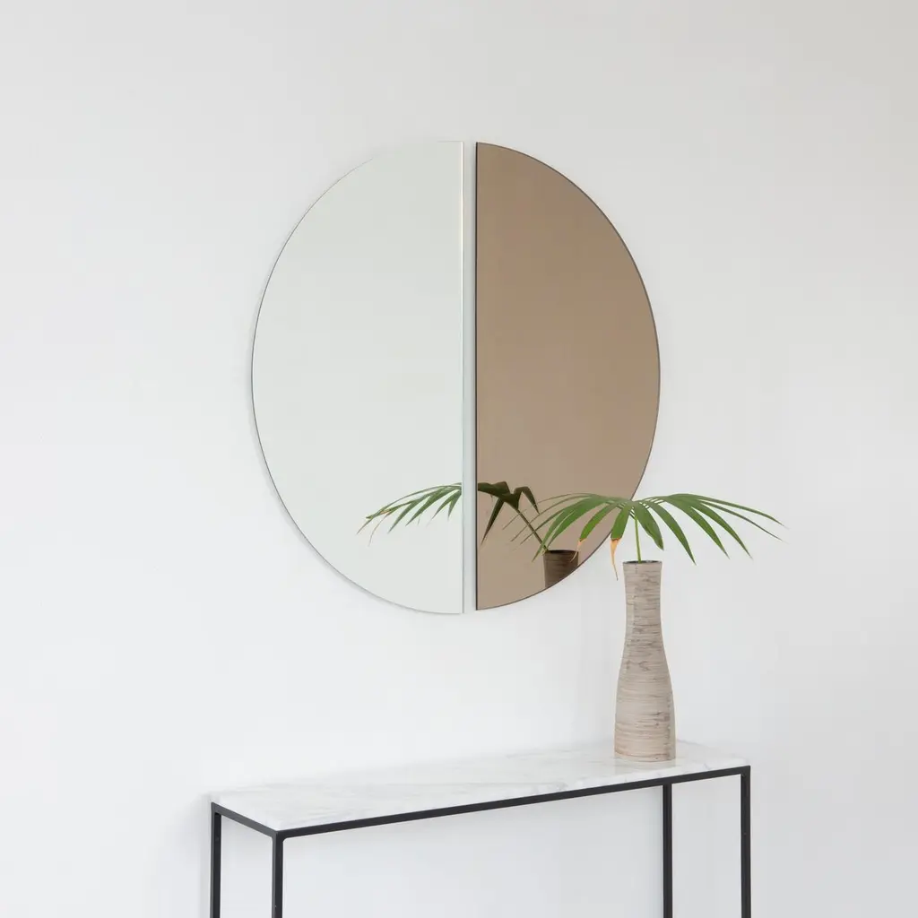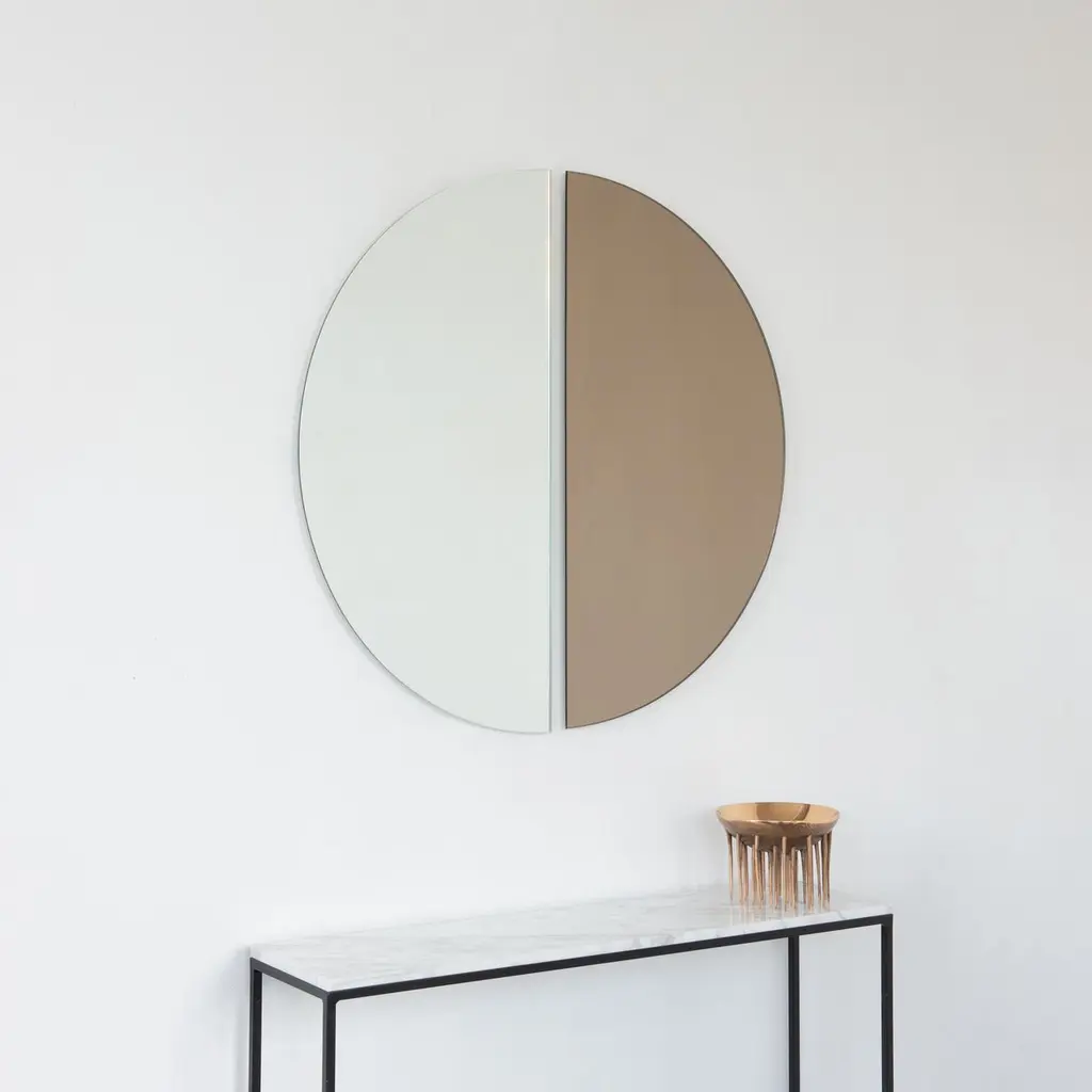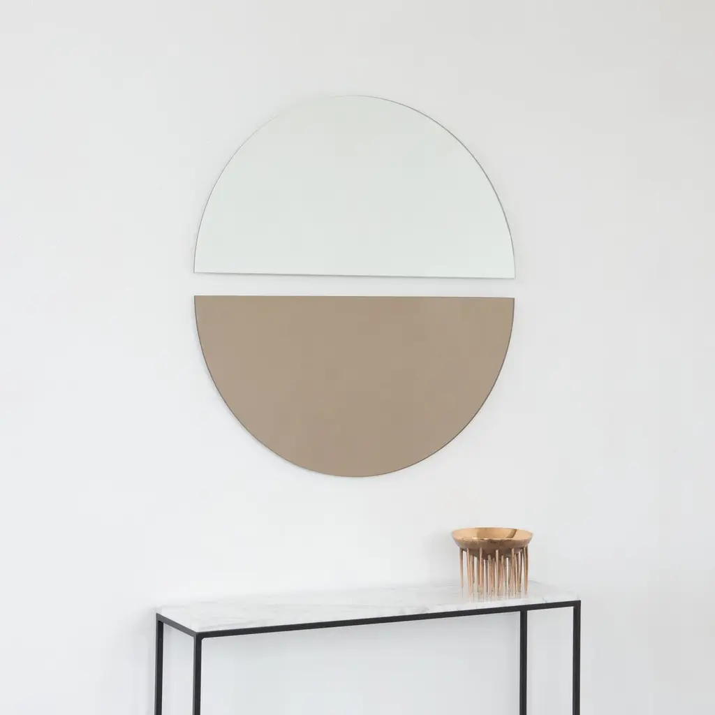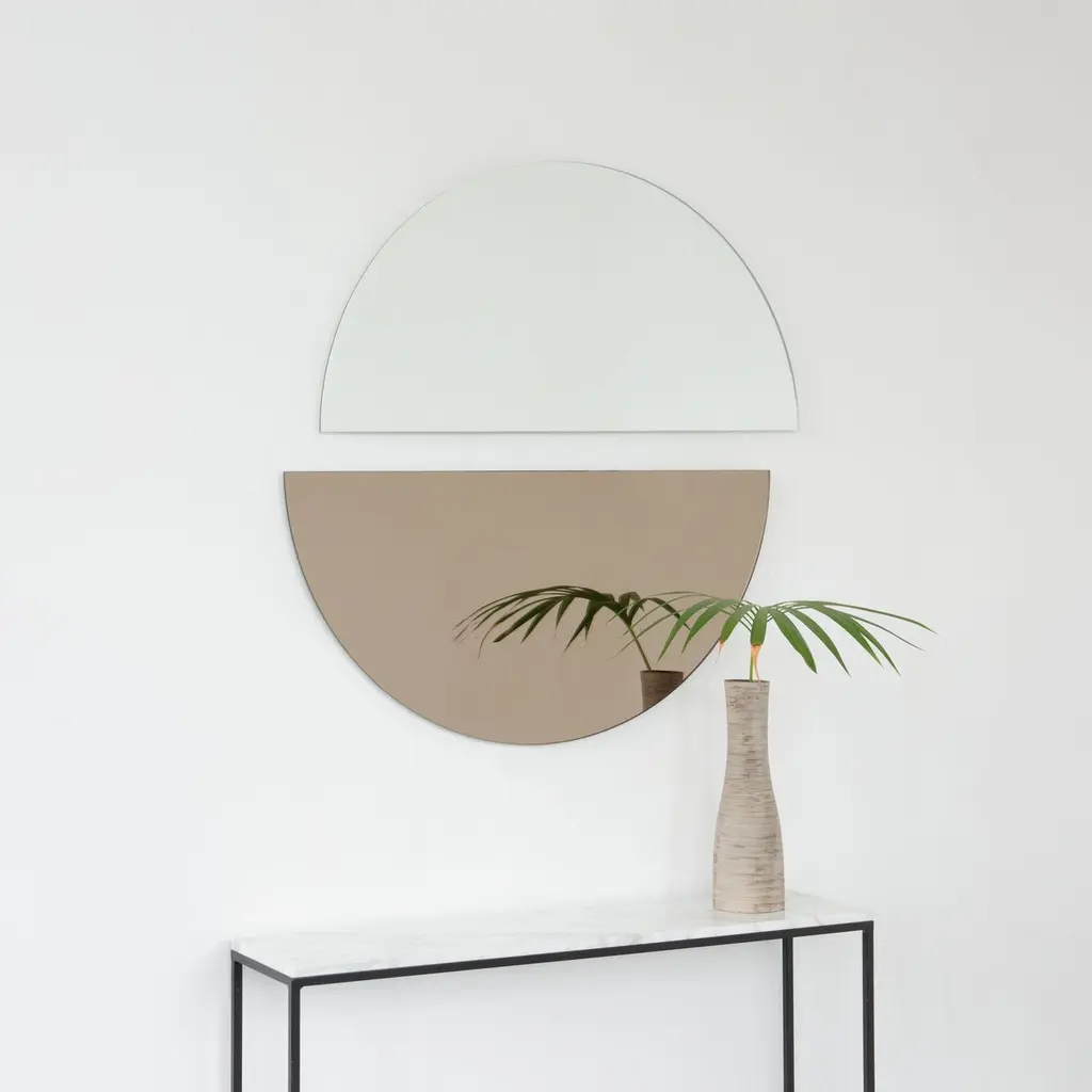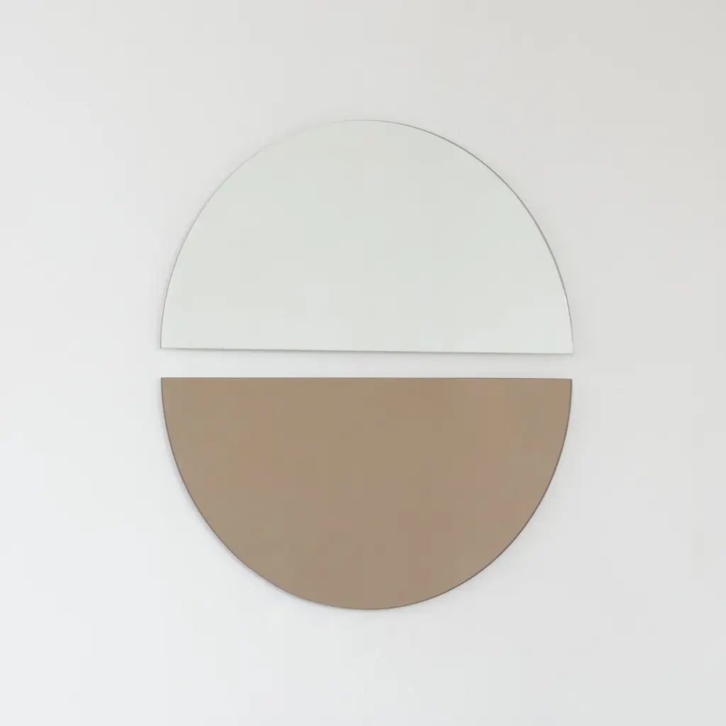 Set of two minimalist half-moon Luna™ standard silver + bronze tinted frameless mirrors with a floating effect. Fitted with a quality and ingenious hanging system for a flexible installation in 4 different directions. Designed and made in London, UK. Our mirrors are designed with an integrated French cleat (split batten) system that ensures the mirror is securely mounted flush with the wall. An alternative hanging hook or a Z-bar (depending on the size of the mirror) is available on demand for mirrors that need to be installed allowing some separation from the wall.Available in the following sizes (each piece):Regular: 50cm x 25cm / 19.7'' x 9.8''Medium: 60cm x 30cm / 23.6" x 11.8''Large: 80cm x 40cm / 31.5" x 15.7''Extra Large: 100cm x 50cm / 39.4" x 19.7''Mirror thickness: 6mm / 0.24" Overall mirror depth: 15mm / 0.59"or any bespoke dimensions.This mirror is fully customisable.Available options:- mirror tint: silver, bronze, black, rose gold / peach, blue or green- bevelling- back-illumination creating a halo effect- framed with various finishes: brass (brushed, polished or with a bronze patina), copper, stainless steel, blackened stainless steel, or in a variety of colours- frame depth: 18mm / 0.71’’, 24mm / 0.94’’ and 30mm / 1.18’’- front illumination for framed mirrors onlyPlease contact us for a quote for any bespoke specification or added options.All our mirrors are made on demand. Fabrication lead time for this particular mirror is approximately 3 weeks. Shipped safely and insured worldwide. Our mirrors are always shipped by courier express. Shipping via courier express typically requires 1 to 2 days to the UK, or 2 to 7 days outside the UK depending on the destination.All 4 directions the mirror may be installed in are illustrated in the photographs in this mirror entry. This mirror cannot be hung diagonally.ORDERS OF MULTIPLE MIRRORS OF THE SAME TYPE: Please contact us to receive a Packing and Shipping quote when ordering multiple mirrors of the same type. An order for multiple mirrors of the same type may not be accepted without extra packing and shipping fees. Thank you.