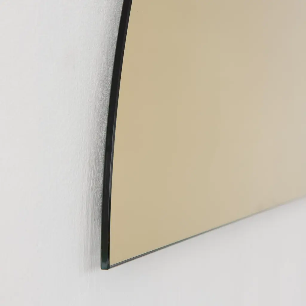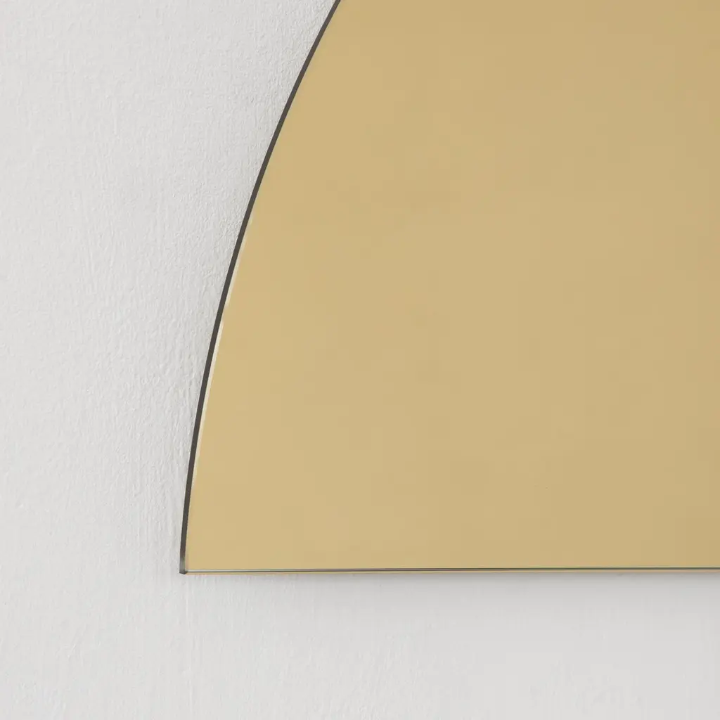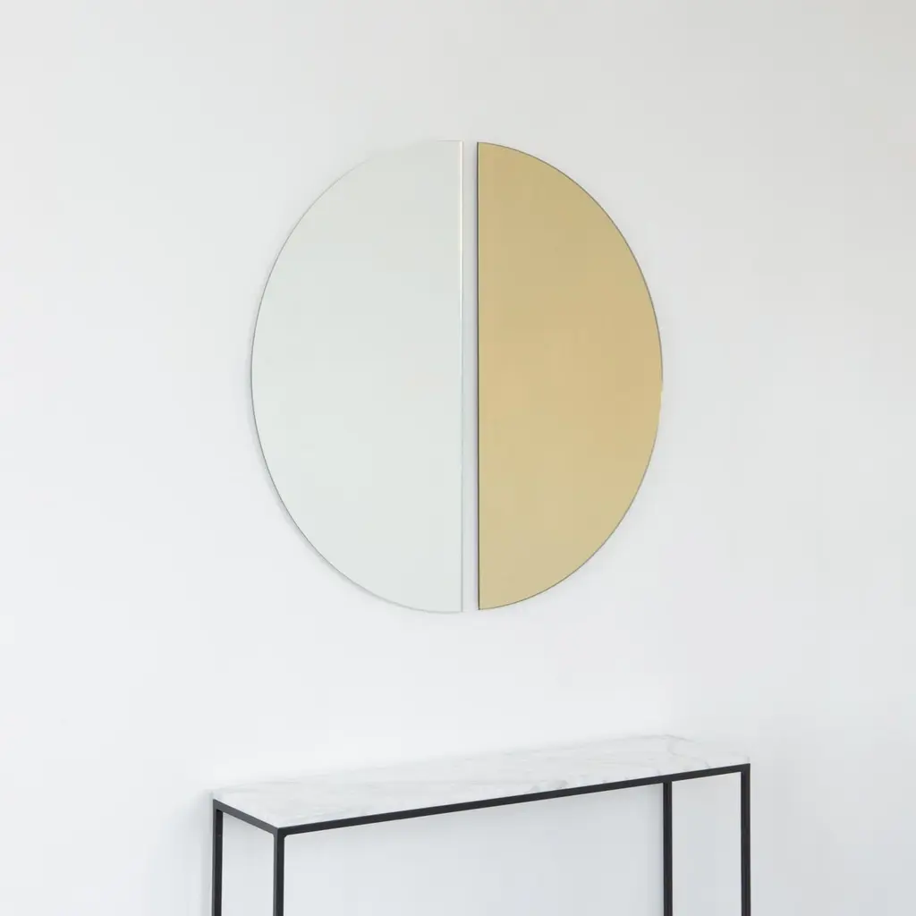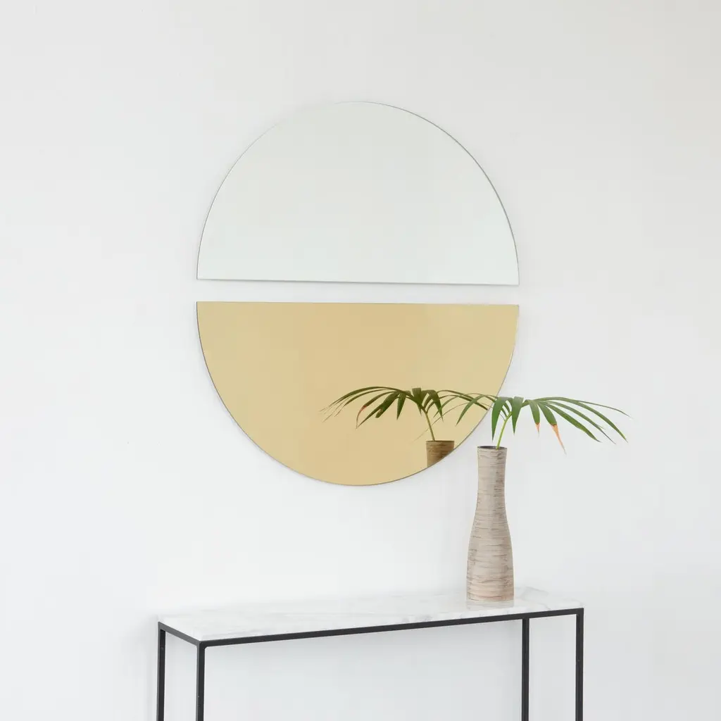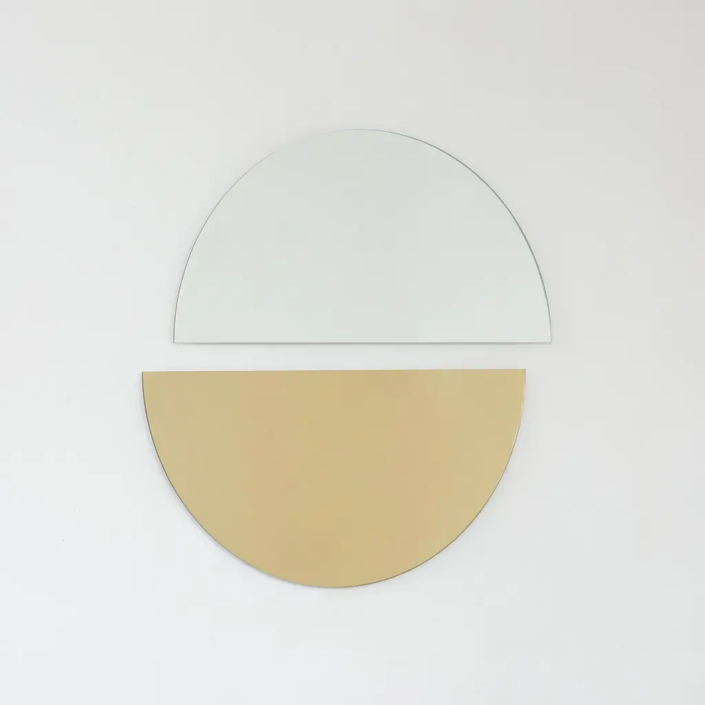 Set of two minimalist half-moon Luna™ standard silver + gold tinted frameless mirrors with a floating effect. Fitted with a quality and ingenious hanging system for a flexible installation in 4 different directions. Designed and made in London, UK. Our mirrors are designed with an integrated French cleat (split batten) system that ensures the mirror is securely mounted flush with the wall. An alternative hanging hook or a Z-bar (depending on the size of the mirror) is available on demand for mirrors that need to be installed allowing some separation from the wall.Available in the following sizes (each piece):Regular: 50cm x 25cm / 19.7'' x 9.8''Medium: 60cm x 30cm / 23.6" x 11.8''Large: 80cm x 40cm / 31.5" x 15.7''Extra Large: 100cm x 50cm / 39.4" x 19.7''Mirror thickness: 6mm / 0.24" Overall mirror depth: 15mm / 0.59"or any bespoke dimensions.This mirror is fully customisable.Available options:- mirror tint: silver, bronze, black, rose gold / peach, blue or green- bevelling- back-illumination creating a halo effect- framed with various finishes: brass (brushed, polished or with a bronze patina), copper, stainless steel, blackened stainless steel, or in a variety of colours- frame depth: 18mm / 0.71’’, 24mm / 0.94’’ and 30mm / 1.18’’- front illumination for framed mirrors onlyPlease contact us for a quote for any bespoke specification or added options.All our mirrors are made on demand. Fabrication lead time for this particular mirror is approximately 3 weeks. Shipped safely and insured worldwide. Our mirrors are always shipped by courier express. Shipping via courier express typically requires 1 to 2 days to the UK, or 2 to 7 days outside the UK depending on the destination.All 4 directions the mirror may be installed in are illustrated in the photographs in this mirror entry. This mirror cannot be hung diagonally.ORDERS OF MULTIPLE MIRRORS OF THE SAME TYPE: Please contact us to receive a Packing and Shipping quote when ordering multiple mirrors of the same type. An order for multiple mirrors of the same type may not be accepted without extra packing and shipping fees. Thank you.