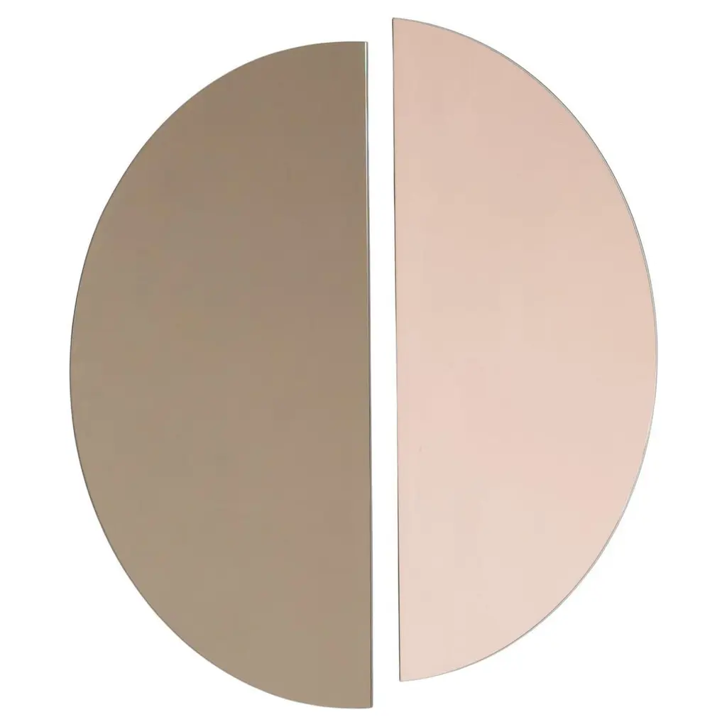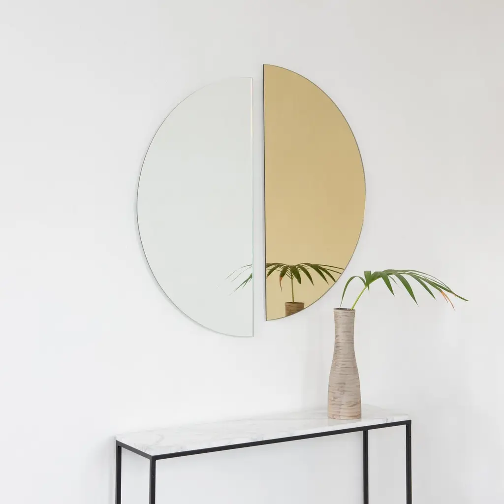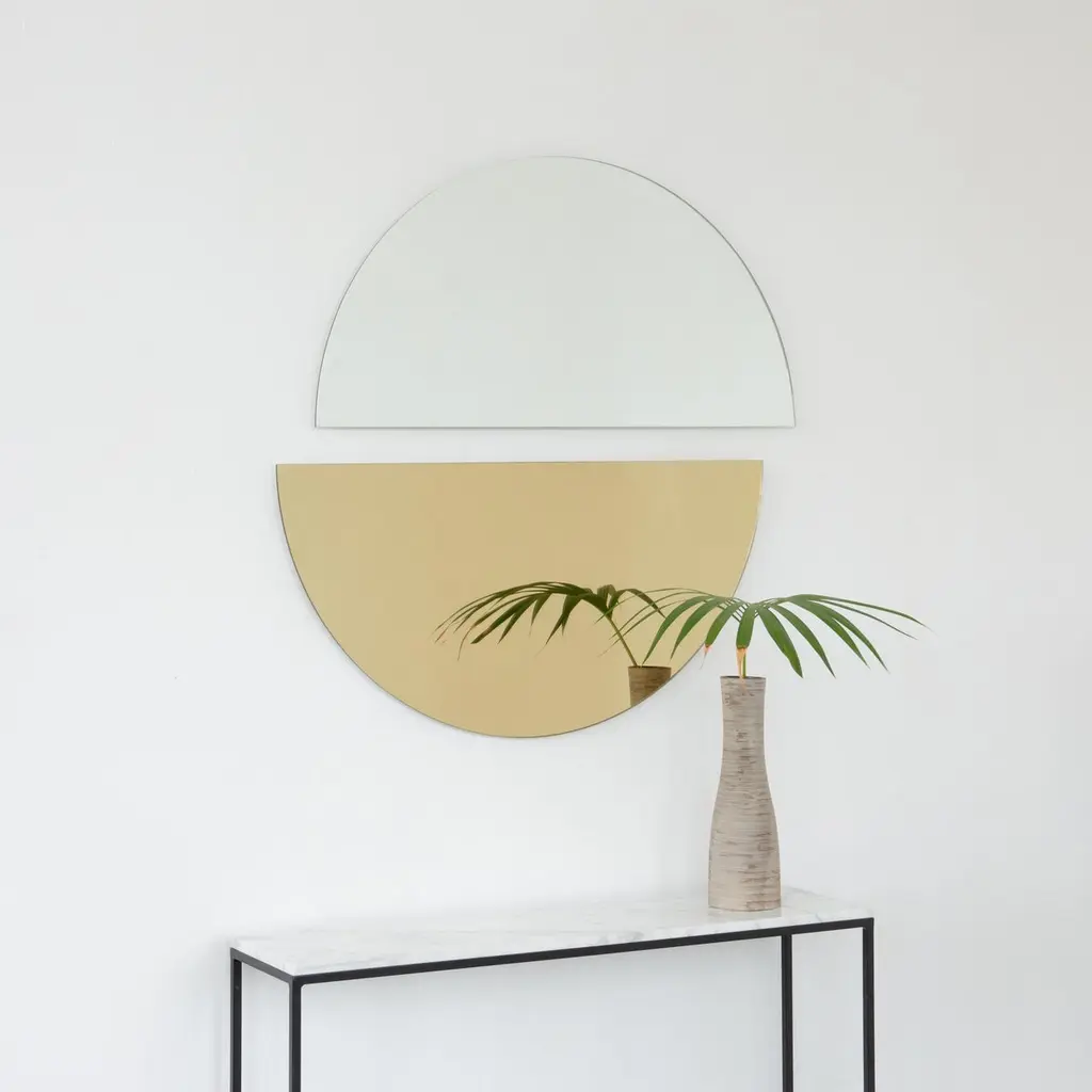 Set of two minimalist half-moon Luna™ standard silver + gold tinted frameless mirrors with a floating effect. Fitted with a quality hanging system for a flexible installation in 4 different directions. Designed and made in London, UK. Our mirrors are designed with an integrated French cleat (split batten) system that ensures the mirror is securely mounted flush with the wall. An alternative hanging hook or a Z-bar (depending on the size of the mirror) is available on demand for mirrors that need to be installed allowing some separation from the wall.Available in the following sizes (each piece):Regular: 50cm x 25cm / 19.7'' x 9.8''Medium: 60cm x 30cm / 23.6" x 11.8''Large: 80cm x 40cm / 31.5" x 15.7''Extra Large: 100cm x 50cm / 39.4" x 19.7''Mirror thickness: 6mm / 0.24" Overall mirror depth: 15mm / 0.59"or any bespoke dimensions.This mirror is fully customisable.Available options:- mirror tint: silver, bronze, black, rose gold / peach, blue or green- bevelling- back-illumination creating a halo effect- framed with various finishes: brass (brushed, polished or with a bronze patina), copper, stainless steel, blackened stainless steel, or in a variety of colours- frame depth: 18mm / 0.71’’, 24mm / 0.94’’ and 30mm / 1.18’’- front illumination for framed mirrors onlyPlease contact us for a quote for any bespoke specification or added options.All our mirrors are made on demand. Fabrication lead time for this particular mirror is approximately 3 weeks. Shipped safely and insured worldwide. Our mirrors are always shipped by courier express. Shipping via courier express typically requires 1 to 2 days to the UK, or 2 to 7 days outside the UK depending on the destination.All 4 directions the mirror may be installed in are illustrated in the photographs in this mirror entry. This mirror cannot be hung diagonally.ORDERS OF MULTIPLE MIRRORS OF THE SAME TYPE: Please contact us to receive a Packing and Shipping quote when ordering multiple mirrors of the same type. An order for multiple mirrors of the same type may not be accepted without extra packing and shipping fees. Thank you.