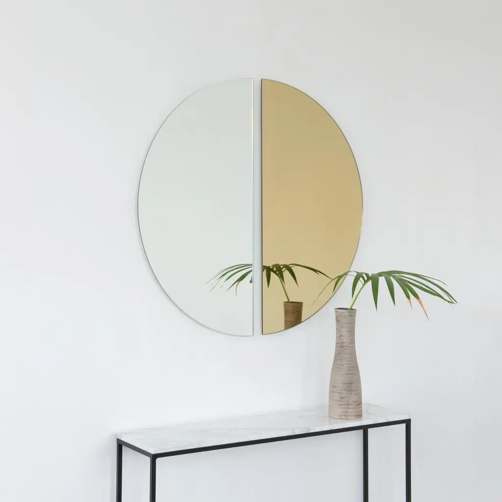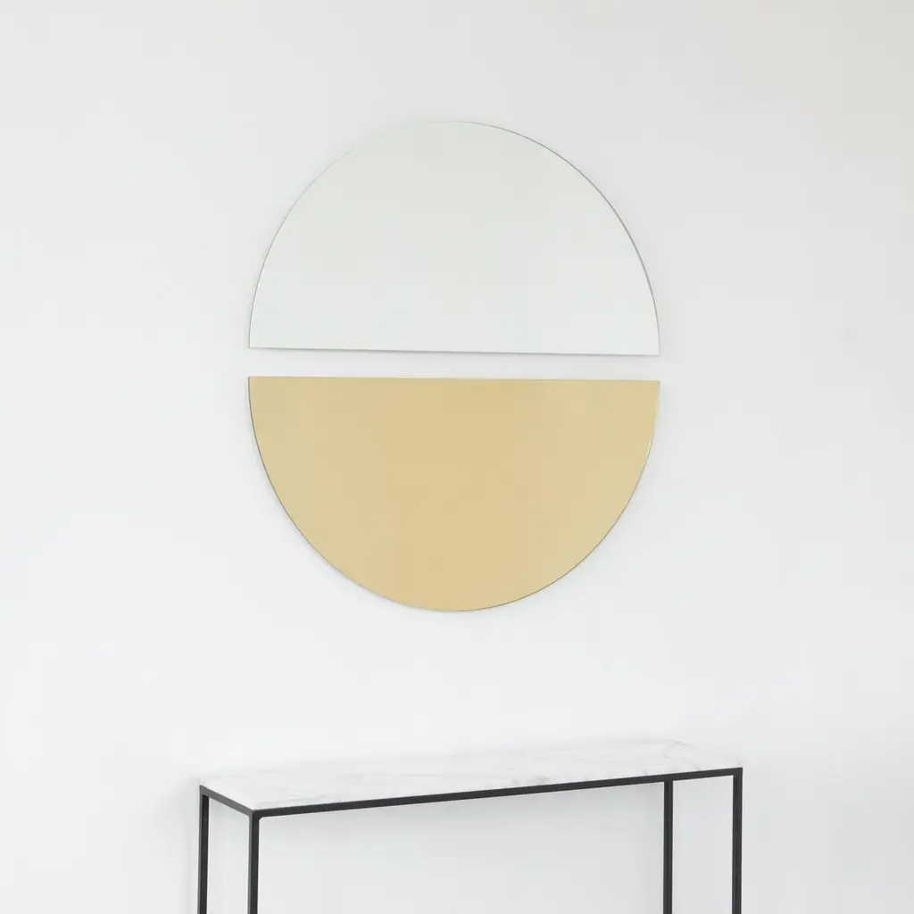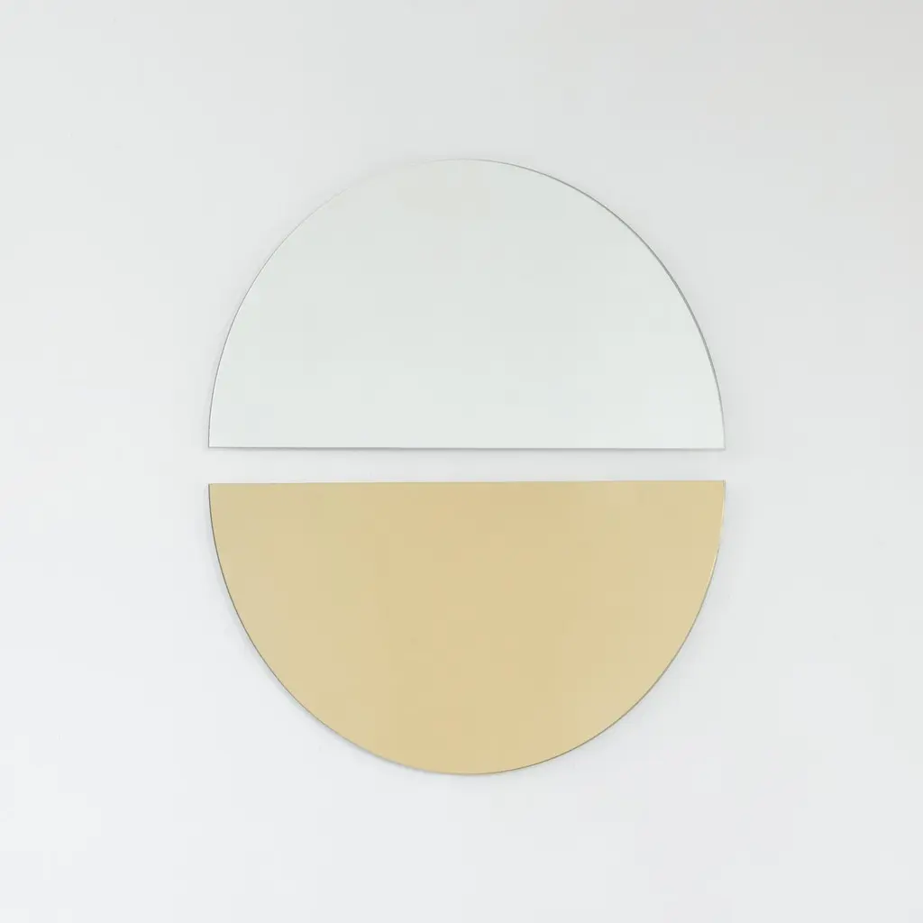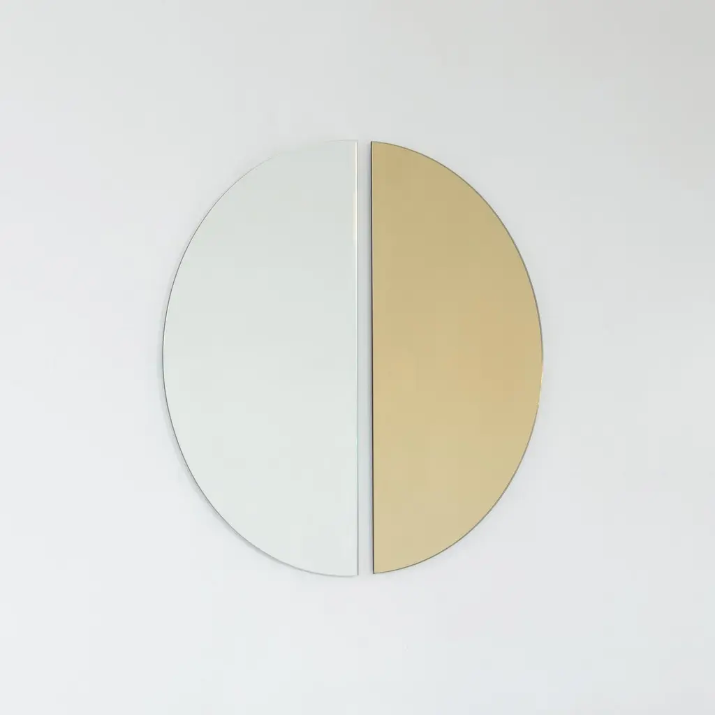 Set of two minimalist half-moon Luna™ standard silver + gold tinted frameless mirrors with a floating effect. Fitted with a quality hanging system for a flexible installation in 4 different directions. Designed and made in London, UK. Our mirrors are designed with an integrated French cleat (split batten) system that ensures the mirror is securely mounted flush with the wall. An alternative hanging hook or a Z-bar (depending on the size of the mirror) is available on demand for mirrors that need to be installed allowing some separation from the wall.Available in the following sizes (each piece):Regular: 50cm x 25cm / 19.7'' x 9.8''Medium: 60cm x 30cm / 23.6" x 11.8''Large: 80cm x 40cm / 31.5" x 15.7''Extra Large: 100cm x 50cm / 39.4" x 19.7''Mirror thickness: 6mm / 0.24" Overall mirror depth: 15mm / 0.59"or any bespoke dimensions.This mirror is fully customisable.Available options:- mirror tint: silver, bronze, black, rose gold / peach, blue or green- bevelling- back-illumination creating a halo effect- framed with various finishes: brass (brushed, polished or with a bronze patina), copper, stainless steel, blackened stainless steel, or in a variety of colours- frame depth: 18mm / 0.71’’, 24mm / 0.94’’ and 30mm / 1.18’’- front illumination for framed mirrors onlyPlease contact us for a quote for any bespoke specification or added options.All our mirrors are made on demand. Fabrication lead time for this particular mirror is approximately 3 weeks. Shipped safely and insured worldwide. Our mirrors are always shipped by courier express. Shipping via courier express typically requires 1 to 2 days to the UK, or 2 to 7 days outside the UK depending on the destination.All 4 directions the mirror may be installed in are illustrated in the photographs in this mirror entry. This mirror cannot be hung diagonally.ORDERS OF MULTIPLE MIRRORS OF THE SAME TYPE: Please contact us to receive a Packing and Shipping quote when ordering multiple mirrors of the same type. An order for multiple mirrors of the same type may not be accepted without extra packing and shipping fees. Thank you.