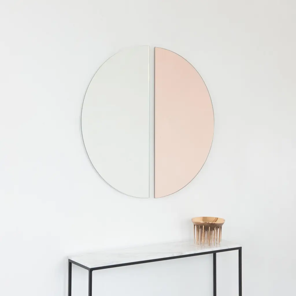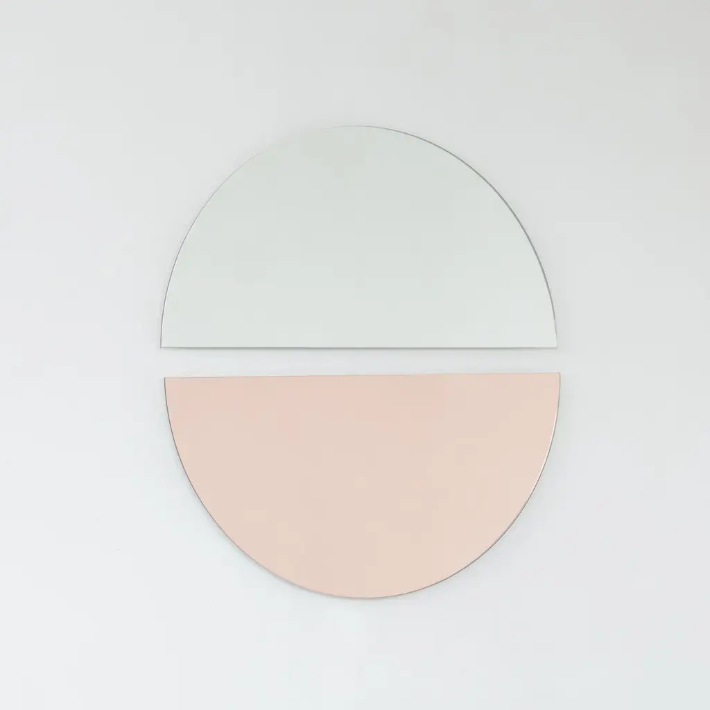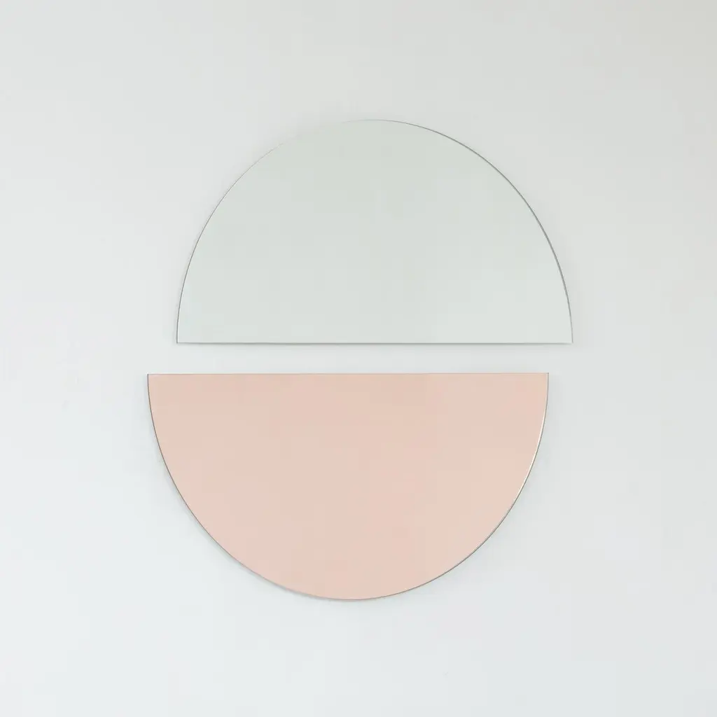 Set of two minimalist rose gold (peach) and standard silver Luna™ half-moon frameless mirrors with a floating effect. Fitted with a quality hanging system for a flexible installation in 4 different directions. Designed and made in London, UK. Our mirrors are designed with an integrated French cleat (split batten) system that ensures the mirror is securely mounted flush with the wall. An alternative hanging hook or a Z-bar (depending on the size of the mirror) is available on demand for mirrors that need to be installed allowing some separation from the wall.Available in the following sizes (each piece):Regular: 50cm x 25cm / 19.7'' x 9.8''Medium: 60cm x 30cm / 23.6" x 11.8''Large: 80cm x 40cm / 31.5" x 15.7''Extra Large: 100cm x 50cm / 39.4" x 19.7''Mirror thickness: 6mm / 0.24" Overall mirror depth: 15mm / 0.59"or any bespoke dimensions.This mirror is fully customisable.Available options:- mirror tint: silver, bronze, black, rose gold / peach, blue or green- bevelling- back-illumination creating a halo effect- framed with various finishes: brass (brushed, polished or with a bronze patina), copper, stainless steel, blackened stainless steel, or in a variety of colours- frame depth: 18mm / 0.71’’, 24mm / 0.94’’ and 30mm / 1.18’’- front illumination for framed mirrors onlyPlease contact us for a quote for any bespoke specification or added options.All our mirrors are made on demand. Fabrication lead time for this particular mirror is approximately 3 weeks. Shipped safely and insured worldwide. Our mirrors are always shipped by courier express. Shipping via courier express typically requires 1 to 2 days to the UK, or 2 to 7 days outside the UK depending on the destination.All 4 directions the mirror may be installed in are illustrated in the photographs in this mirror entry. This mirror cannot be hung diagonally.ORDERS OF MULTIPLE MIRRORS OF THE SAME TYPE: Please contact us to receive a Packing and Shipping quote when ordering multiple mirrors of the same type. An order for multiple mirrors of the same type may not be accepted without extra packing and shipping fees. Thank you.