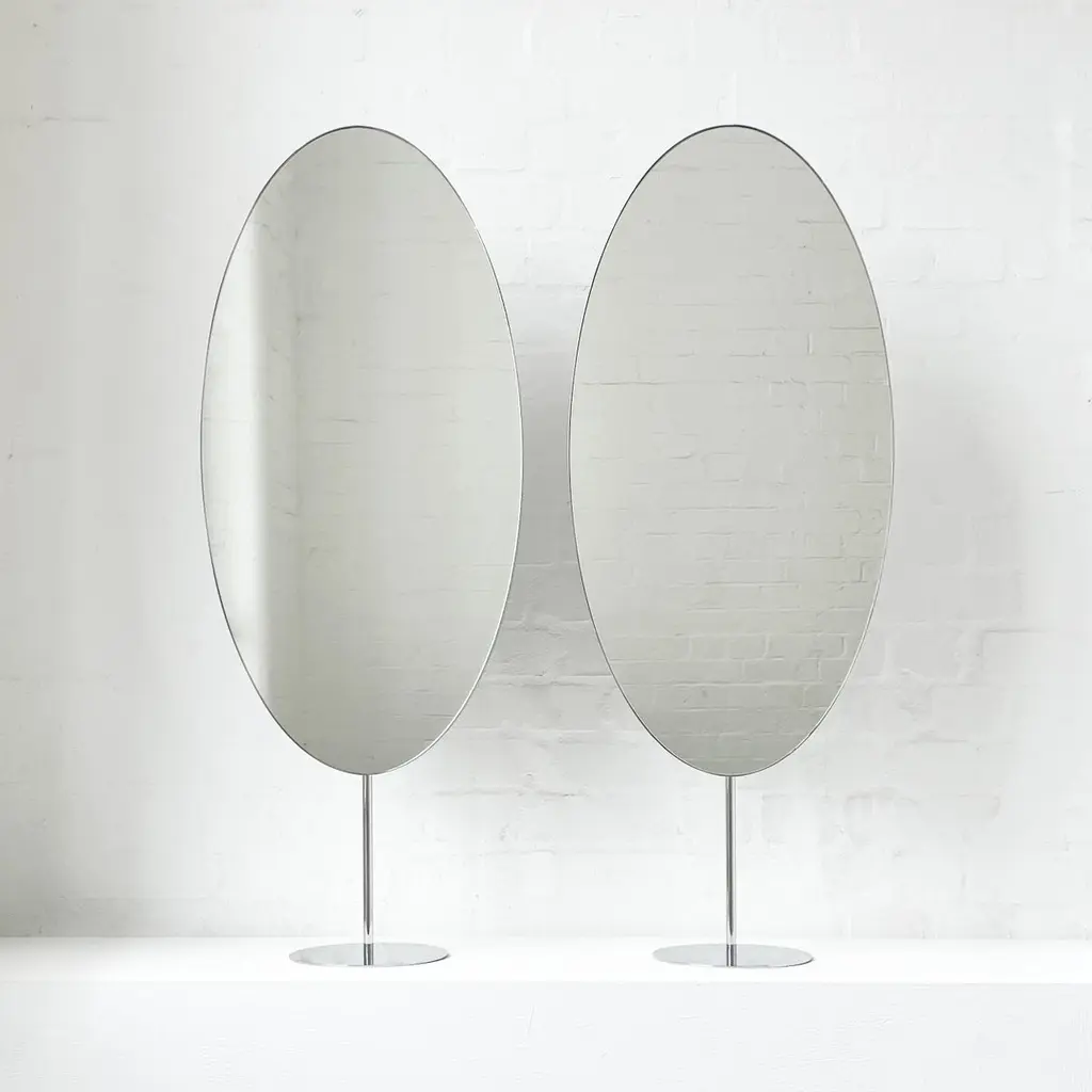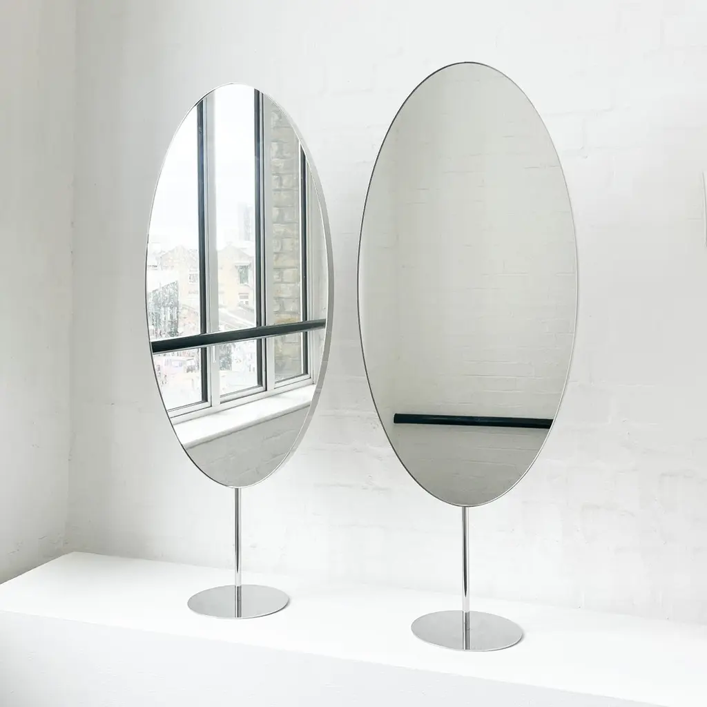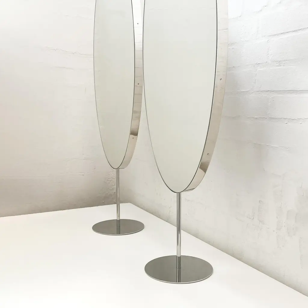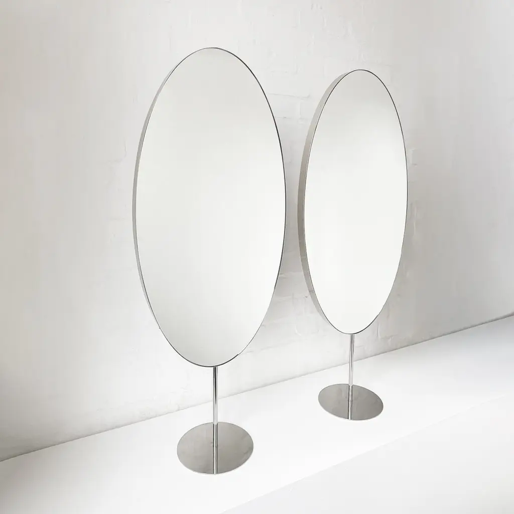 Set of 2 Ovalis™ countertop attached oval mirrors with a modern polished stainless steel frame. Designed and handcrafted in London, UK.Dimensions:W 40cm x H 80cm x D 3cm (Rise 23cm )W 15.75in x H 31.5in x D 1.18in (Rise 9.06in)Overall height 103cm / 40.55inThis mirror is fully customisable. Please contact us for further information.Mirror backing. The high quality finish of our countertop mirrors extends to their backings, which are made from a powder coated panel available in black or white. Backings can also be upgraded to a finish that matches the frame or can be substituted by a second mirror, making your mirror double sided.Cover plate. This mirror is supplied with a cover plate designed to hide the installation screws to complete the minimalist design of the mirror.Shipped safely and insured worldwide. All our mirrors are made on demand. Fabrication lead time for this particular mirror is approximately 6 to 7 weeks. Our mirrors are always shipped by courier express, which typically requires 1 to 2 days to the UK, or 2 to 7 days outside the UK depending on the destination.Available options:- frame finishes: brass (brushed, polished or with a bronze patina), copper, stainless steel, blackened metal, powder coated aluminium in a range of standard or bespoke colours- full frame that extends to the front of the mirror- backing with a finish that matches the frame- double-sided mirror- mirror tints: standard silver, black, bronze, blue, rose gold / peach- back-illumination creating a halo effect- ON/OFF sensor switch- dimmable driver- demister pad- bevelPlease contact us for a quote for any bespoke specification or added options.IMPORTANT NOTES:This mirror is intended to be fitted onto a countertop. Ceiling suspended mirrors or countertop to ceiling attached mirrors are also available on demand.ORDERS OF MULTIPLE MIRRORS OF THE SAME TYPE: Please contact us to receive a Packing and Shipping quote when ordering multiple mirrors of the same type. An order for multiple mirrors of the same type may not be accepted without extra packing and shipping fees. Thank you.