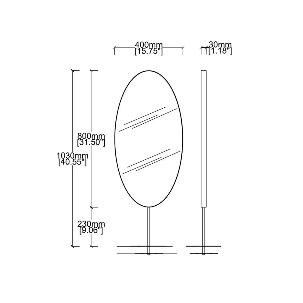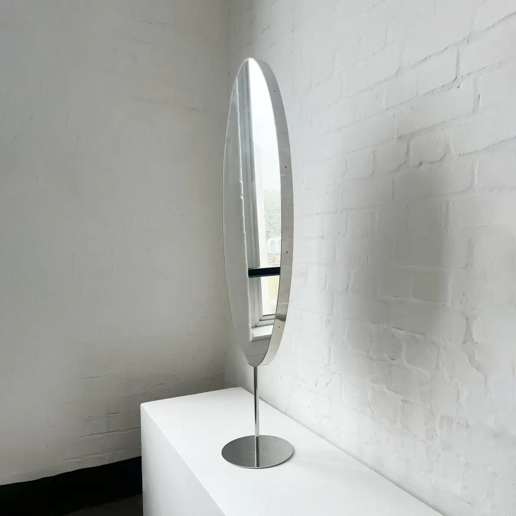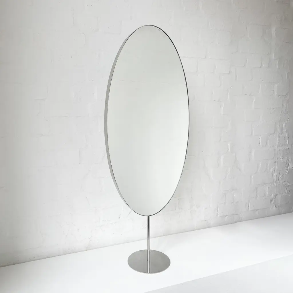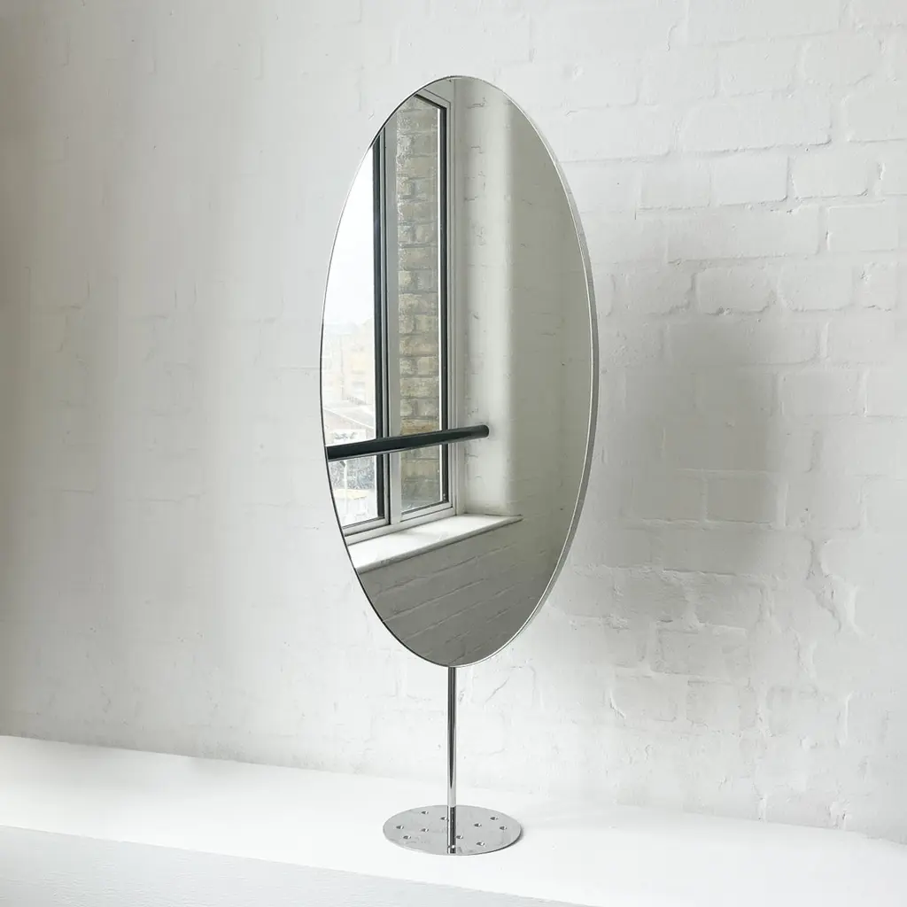 Set of 2 Ovalis™ countertop attached oval mirrors with a modern polished stainless steel frame. Designed and handcrafted in London, UK.Dimensions:W 40cm x H 80cm x D 3cm (Rise 23cm )W 15.75in x H 31.5in x D 1.18in (Rise 9.06in)Overall height 103cm / 40.55inThis mirror is fully customisable. Please contact us for further information.Mirror backing. The high quality finish of our countertop mirrors extends to their backings, which are made from a powder coated panel available in black or white. Backings can also be upgraded to a finish that matches the frame or can be substituted by a second mirror, making your mirror double sided.Cover plate. This mirror is supplied with a cover plate designed to hide the installation screws to complete the minimalist design of the mirror.Shipped safely and insured worldwide. All our mirrors are made on demand. Fabrication lead time for this particular mirror is approximately 6 to 7 weeks. Our mirrors are always shipped by courier express, which typically requires 1 to 2 days to the UK, or 2 to 7 days outside the UK depending on the destination.Available options:- frame finishes: brass (brushed, polished or with a bronze patina), copper, stainless steel, blackened metal, powder coated aluminium in a range of standard or bespoke colours- full frame that extends to the front of the mirror- backing with a finish that matches the frame- double-sided mirror- mirror tints: standard silver, black, bronze, blue, rose gold / peach- back-illumination creating a halo effect- ON/OFF sensor switch- dimmable driver- demister pad- bevelPlease contact us for a quote for any bespoke specification or added options.IMPORTANT NOTES:This mirror is intended to be fitted onto a countertop. Ceiling suspended mirrors or countertop to ceiling attached mirrors are also available on demand.ORDERS OF MULTIPLE MIRRORS OF THE SAME TYPE: Please contact us to receive a Packing and Shipping quote when ordering multiple mirrors of the same type. An order for multiple mirrors of the same type may not be accepted without extra packing and shipping fees. Thank you.