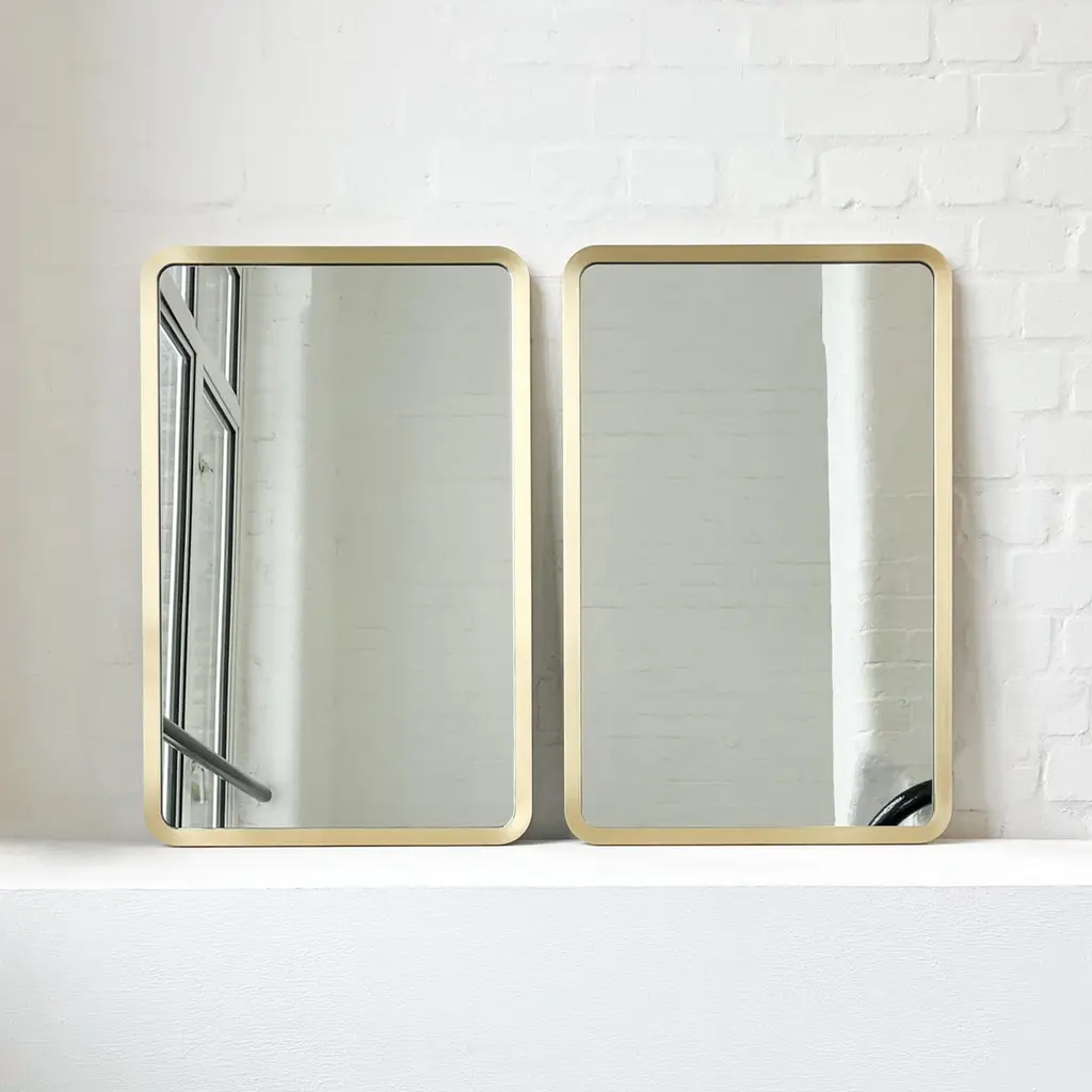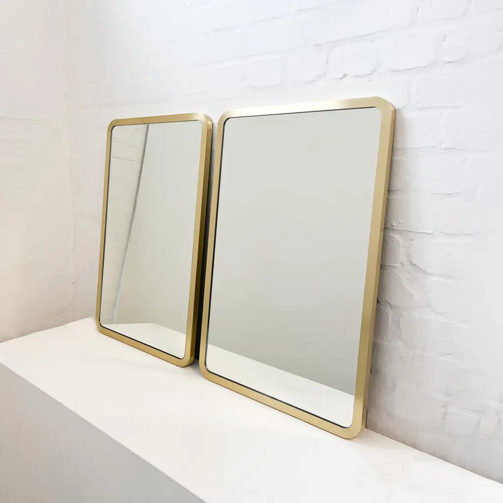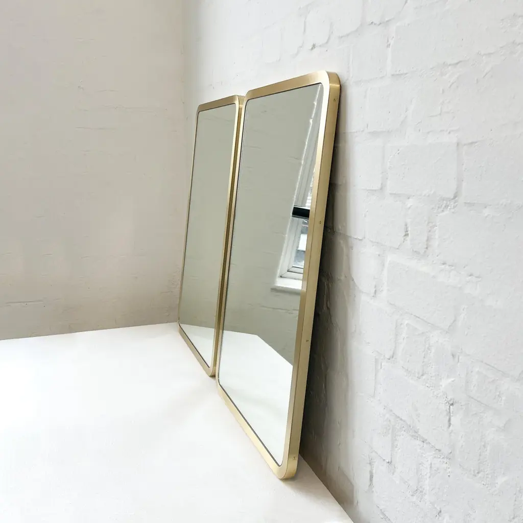 Set of two modern rectangular mirrors with an elegant solid brushed brass full frame. Part of the charming Quadris™ collection, designed and handcrafted in London, UK. Our brand new 'Full Frame' design maintains the chic and elegant style of Alguacil & Perkoff' signature 'Minimalist Frame' mirrors, yet placing more emphasis on the solid brass. The designer awards more prominence to this noble material by creating a wider frame on the front of the mirror itself.The detailing and finish, including visible brass screws, highlight the craft and quality feel of the mirror. Designed and handcrafted in London, UK.Our mirrors are designed with an integrated French cleat (split batten) system that ensures the mirror is securely mounted flush with the wall. An alternative hanging hook or a Z-bar (depending on the size of the mirror) is available on demand for mirrors that need to be installed allowing some separation from the wall.These mirrors are fully customisable.The mirrors in the images illustrate a large size, measuring 46cm x 71cm x 1.8cm / 18.1in x 28in x 0.71inShipped safely and insured worldwide. All our mirrors are made on demand. Fabrication lead time for this particular mirror is approximately 4 to 5 weeks. Our mirrors are always shipped by courier express. Shipping via courier express typically requires 1 to 2 days to the UK, or 2 to 7 days outside the UK depending on the destination.Available in the following sizes:Small: 27cm x 68cm x 1.8cm / 10.6'' x 26.8'' x 0.71’’Medium: 37cm x 56cm x 1.8cm / 14.6'' x 22" x 0.71’’Large: 46cm x 71cm x 1.8cm / 18.1'' x 28" x 0.71’’Extra Large: 48cm x 97cm x 1.8cm / 18.9" x 38.2" x 0.71’’or any bespoke dimensions.Available options:- frame depth: 18mm / 0.71’’, 24mm / 0.94’’ and 30mm / 1.18’’- frame finish: brass (brushed, polished or with a bronze patina), copper, stainless steel, blackened stainless steel, or in a variety of colours- mirror tint: silver, bronze, black, rose gold / peach, blue or green- bevelling- back-illumination creating a halo effect- demister padPlease contact us for a quote for any bespoke specification or added options.ORDERS OF MULTIPLE MIRRORS OF THE SAME TYPE: Please contact us to receive a Packing and Shipping quote when ordering multiple mirrors of the same type. An order for multiple mirrors of the same type may not be accepted without extra packing and shipping fees. Thank you.