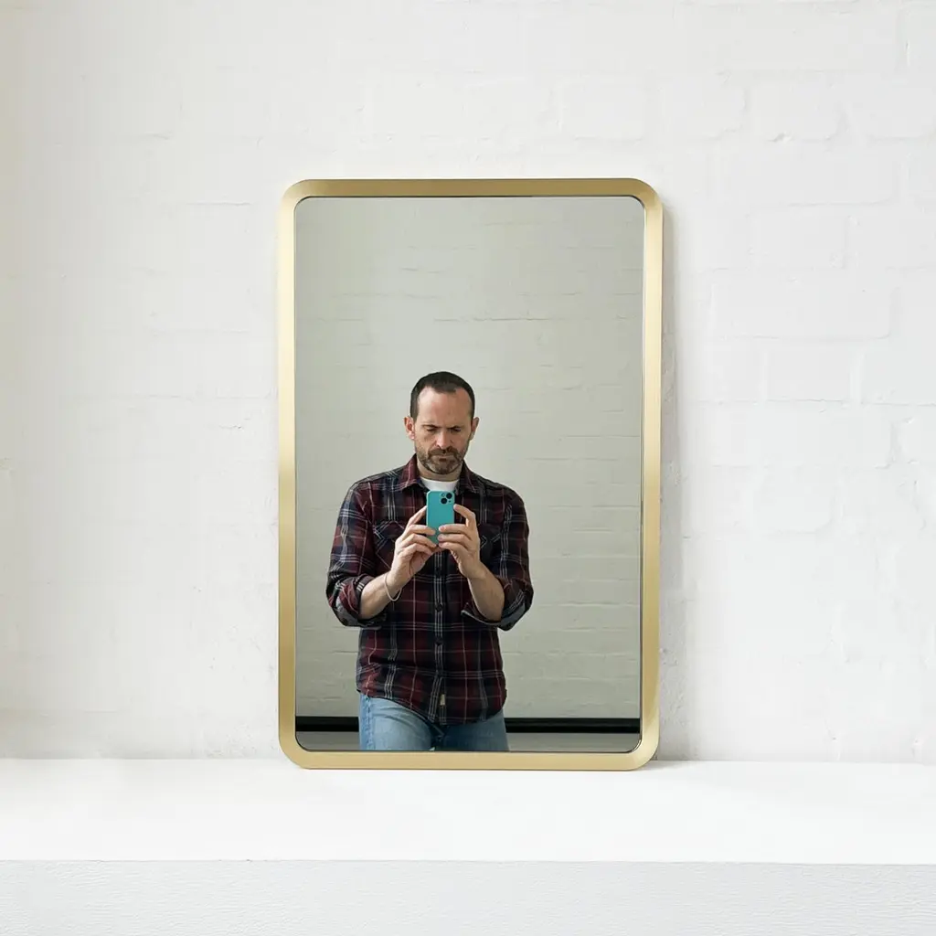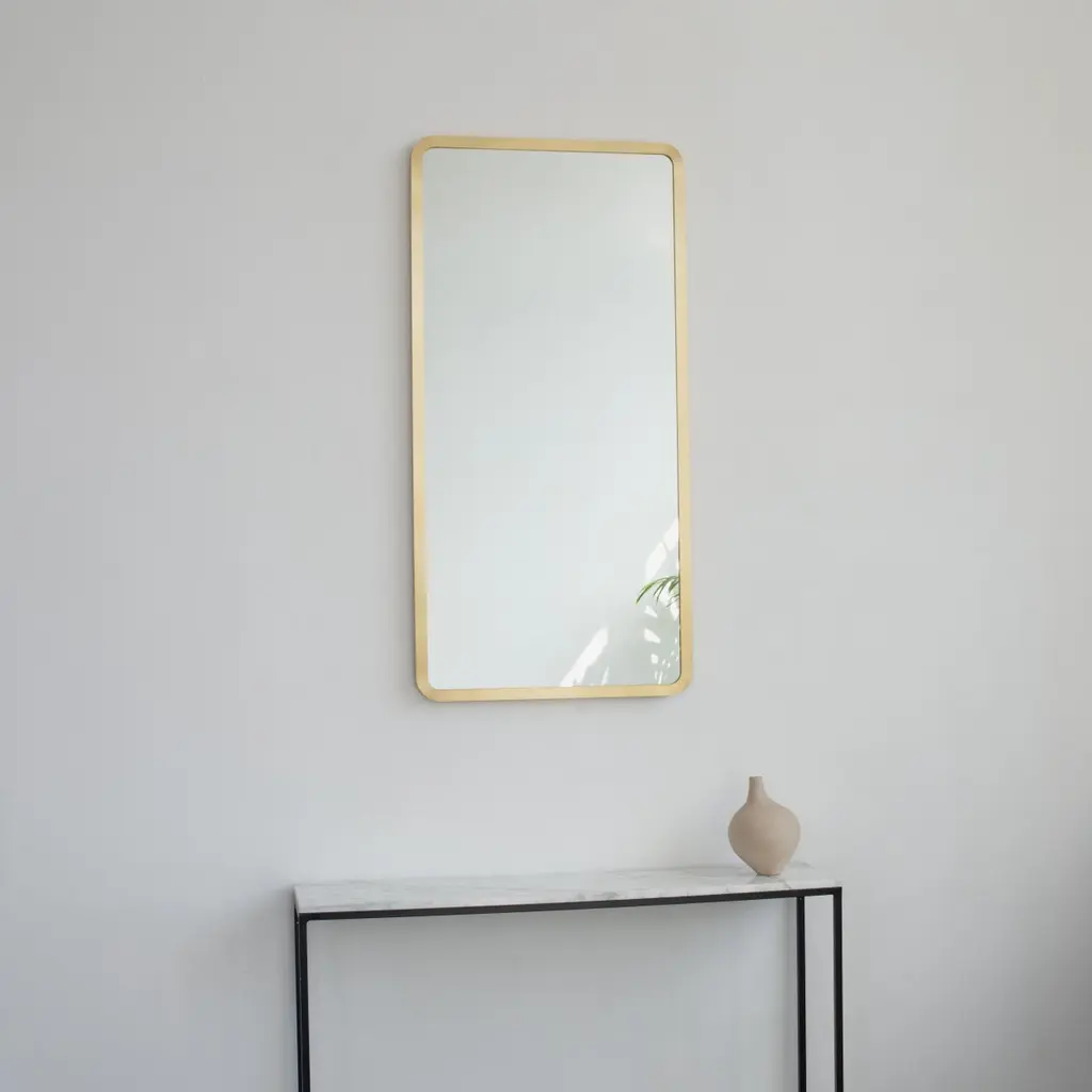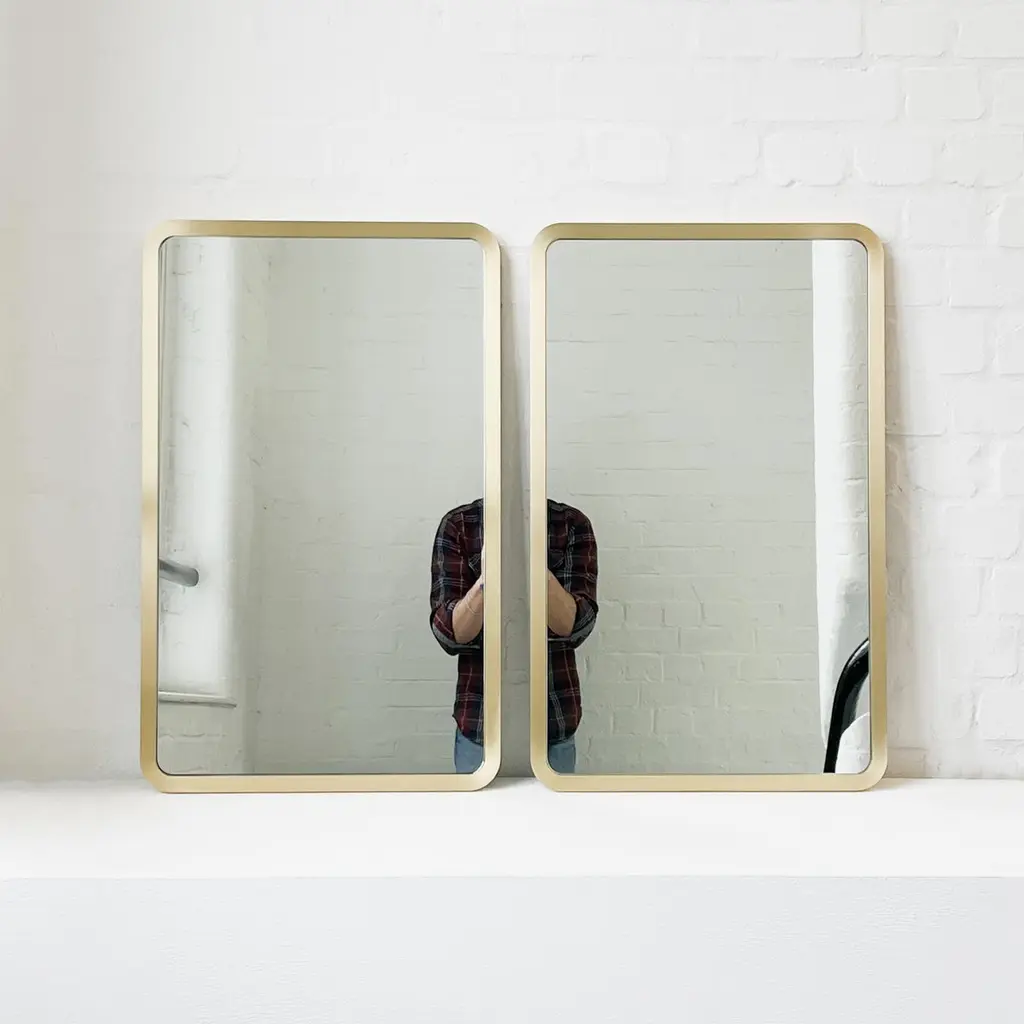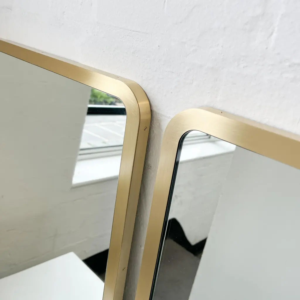 Set of two modern rectangular mirrors with an elegant solid brushed brass full frame. Part of the charming Quadris™ collection, designed and handcrafted in London, UK. Our brand new 'Full Frame' design maintains the chic and elegant style of Alguacil & Perkoff' signature 'Minimalist Frame' mirrors, yet placing more emphasis on the solid brass. The designer awards more prominence to this noble material by creating a wider frame on the front of the mirror itself.The detailing and finish, including visible brass screws, highlight the craft and quality feel of the mirror. Designed and handcrafted in London, UK.Our mirrors are designed with an integrated French cleat (split batten) system that ensures the mirror is securely mounted flush with the wall. An alternative hanging hook or a Z-bar (depending on the size of the mirror) is available on demand for mirrors that need to be installed allowing some separation from the wall.These mirrors are fully customisable.The mirrors in the images illustrate a large size, measuring 46cm x 71cm x 1.8cm / 18.1in x 28in x 0.71inShipped safely and insured worldwide. All our mirrors are made on demand. Fabrication lead time for this particular mirror is approximately 4 to 5 weeks. Our mirrors are always shipped by courier express. Shipping via courier express typically requires 1 to 2 days to the UK, or 2 to 7 days outside the UK depending on the destination.Available in the following sizes:Small: 27cm x 68cm x 1.8cm / 10.6'' x 26.8'' x 0.71’’Medium: 37cm x 56cm x 1.8cm / 14.6'' x 22" x 0.71’’Large: 46cm x 71cm x 1.8cm / 18.1'' x 28" x 0.71’’Extra Large: 48cm x 97cm x 1.8cm / 18.9" x 38.2" x 0.71’’or any bespoke dimensions.Available options:- frame depth: 18mm / 0.71’’, 24mm / 0.94’’ and 30mm / 1.18’’- frame finish: brass (brushed, polished or with a bronze patina), copper, stainless steel, blackened stainless steel, or in a variety of colours- mirror tint: silver, bronze, black, rose gold / peach, blue or green- bevelling- back-illumination creating a halo effect- demister padPlease contact us for a quote for any bespoke specification or added options.ORDERS OF MULTIPLE MIRRORS OF THE SAME TYPE: Please contact us to receive a Packing and Shipping quote when ordering multiple mirrors of the same type. An order for multiple mirrors of the same type may not be accepted without extra packing and shipping fees. Thank you.