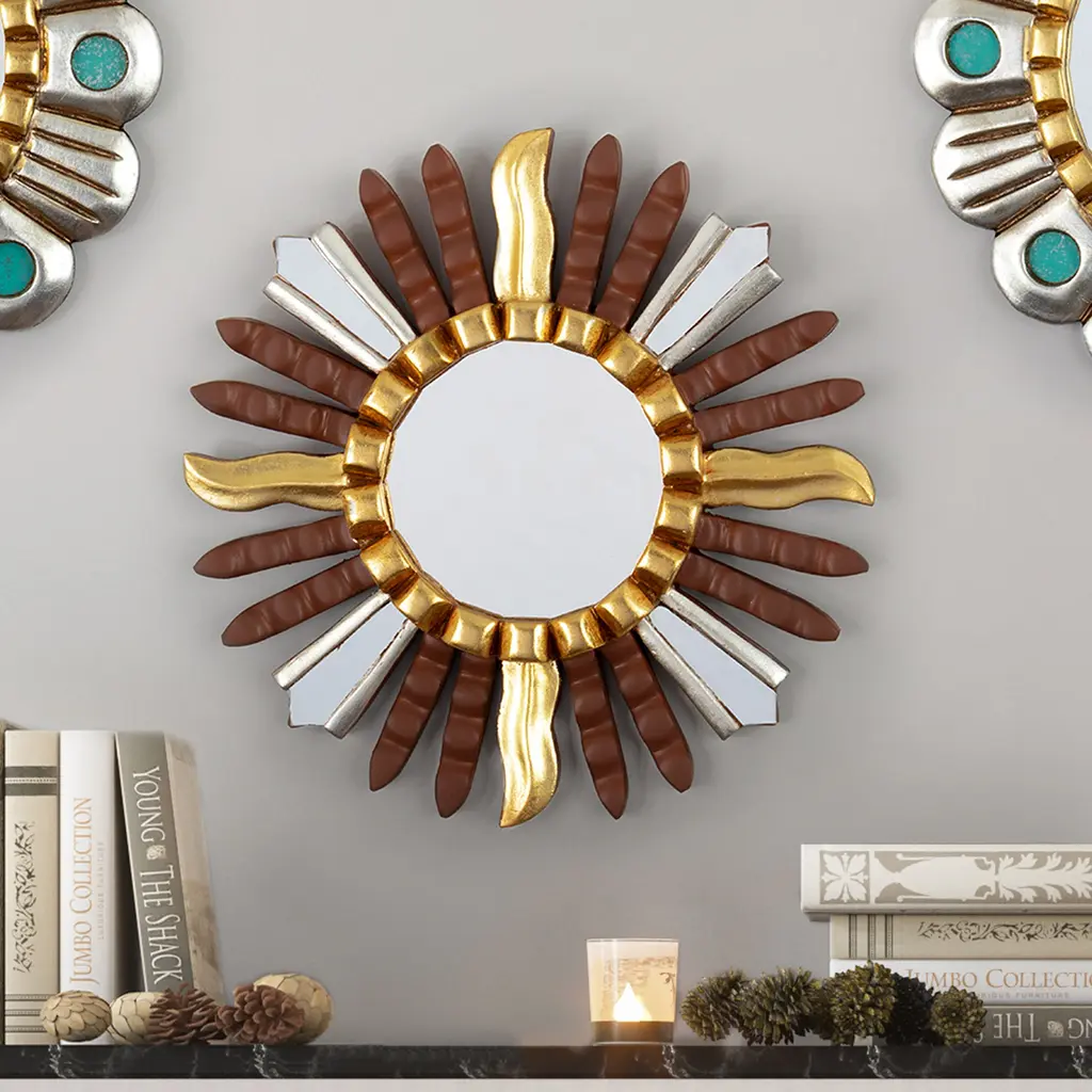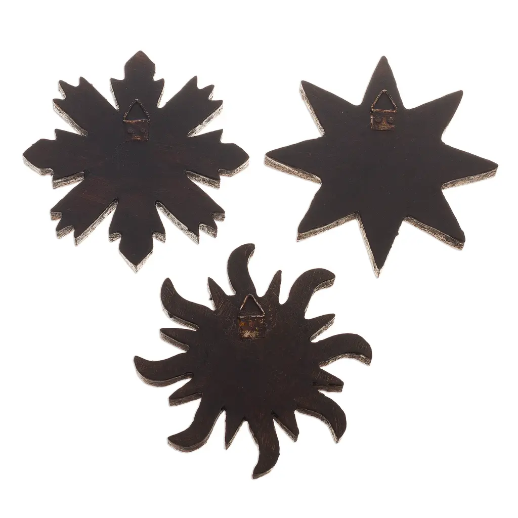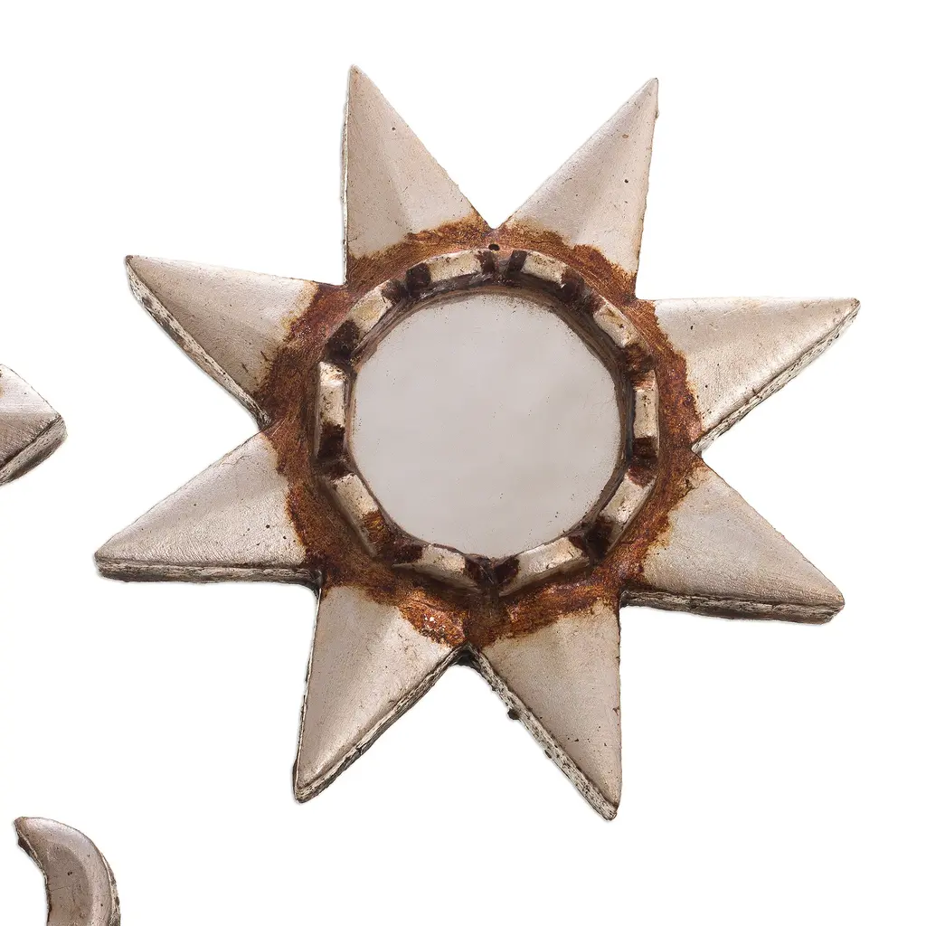 Radiant celestial faces beam from these three mirrored wall accents, each one a handcrafted sun that brings warmth and character to your space. Designed by Peru's Gliseria Soto, the wooden frames are adorned with silvery aluminum leaf and finished with walnut stain to create an aged, timeworn patina that feels both rustic and refined. Together, this trio of reflective suns transforms any blank wall into a gallery of light and artistry.