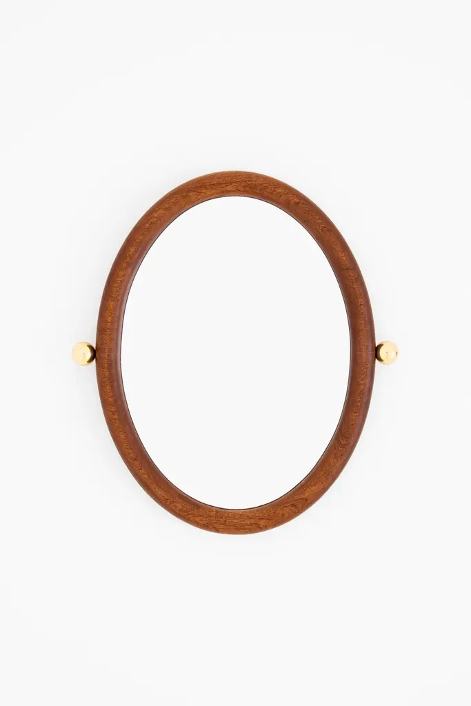 Set of 5 Aro mirrors by Leandro Garcia Contemporary Brazil designDimensions: H 25 x 5.6 x l 32 cm H 35 x 5.6 x l 42 cm H 45 x 5.6 x l 52 cm H 55 x 5.6 x l 62 cm H 55 x 5.6 x l 68 cm Materials: Light, medium, dark or reddish tauari wood frame and background Silver mirror Polished brass spheresThe initial idea for the Aro Mirror came during the social project “Mãos em Ação” (“Hands in Action”), a realization of Instituto Campana in partnership with ÔdaDesign Club, produced by Consuelo Cornelsen and mentoring by Humberto Campana. Later developed, Aro Mirror has a thick round-section solid wooden frame forming a circle or an ellipse. Embedded to it is the mirrored surface. Each side edge of the frame receives a solid metal sphere that can be used as ahanger. Available in several dimensions, Aro Mirror still allows to form sets through the metal spheres, which this time connect the pieces in sequence and create different compositionsLeandro GarciaContrary to a general trend of large-scale production and homogenization, he develops unique and exclusive designs. His creative process claims on rational and functional solutions that explore the essence of shapes in the conception of the object and/or space. Leandro Garcia seeks to develop a timeless aesthetic, which translates into the disposal of excess and theexploration of primordial spatial matters such as proportion, light and shadow, materials and textures.The detail is essential, being directly connected to the design artwork.Architect and urban-planer graduated from the university “Universidade do Grande ABC(UniABC)”, Leandro Garcia began his studies in the area over 25 years ago, when attended technicalschool in Civil Engineering Drawing (ETE Julio de Mesquita). Still in university, he received an honorablemention at the International Competition of Architecture Schools from the 4th International Biennialof Architecture. He collaborated with two important Brazilian offices, receiving several national andinternational prizes. At first he worked with the designer Marcelo Rosenbaum and then with therenowned architect Isay Weinfeld.The architect was also professor at Campo Real College, at Centro Europeu and at ISAE/FGV.Nowadays, he directs his own studio, which develops residential, commercial and institutionalarchitecture projects, and also interior and furniture design. Many of these projects have been publishedin different Brazilian and foreign magazines, and products presented in several editions of the MilanDesign Week and commercialized nationally and internationally.He is also a professor at the Tuiuti University of Paraná (UTP) and the British School of Creative Arts (EBAC).